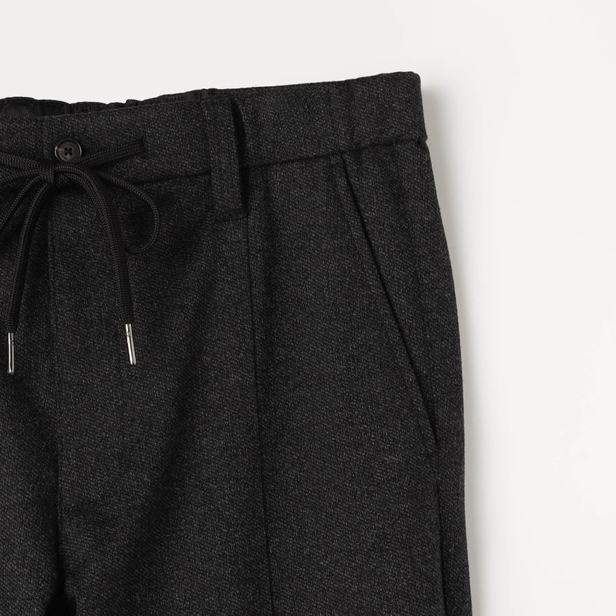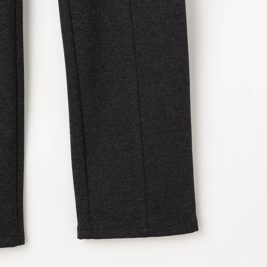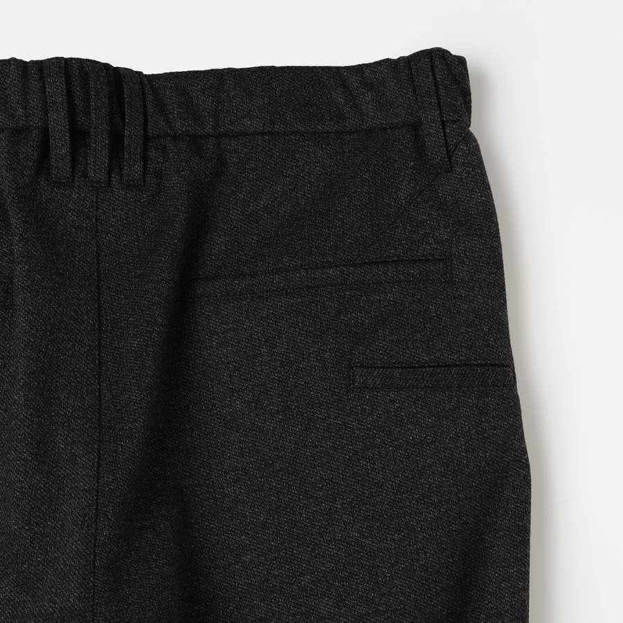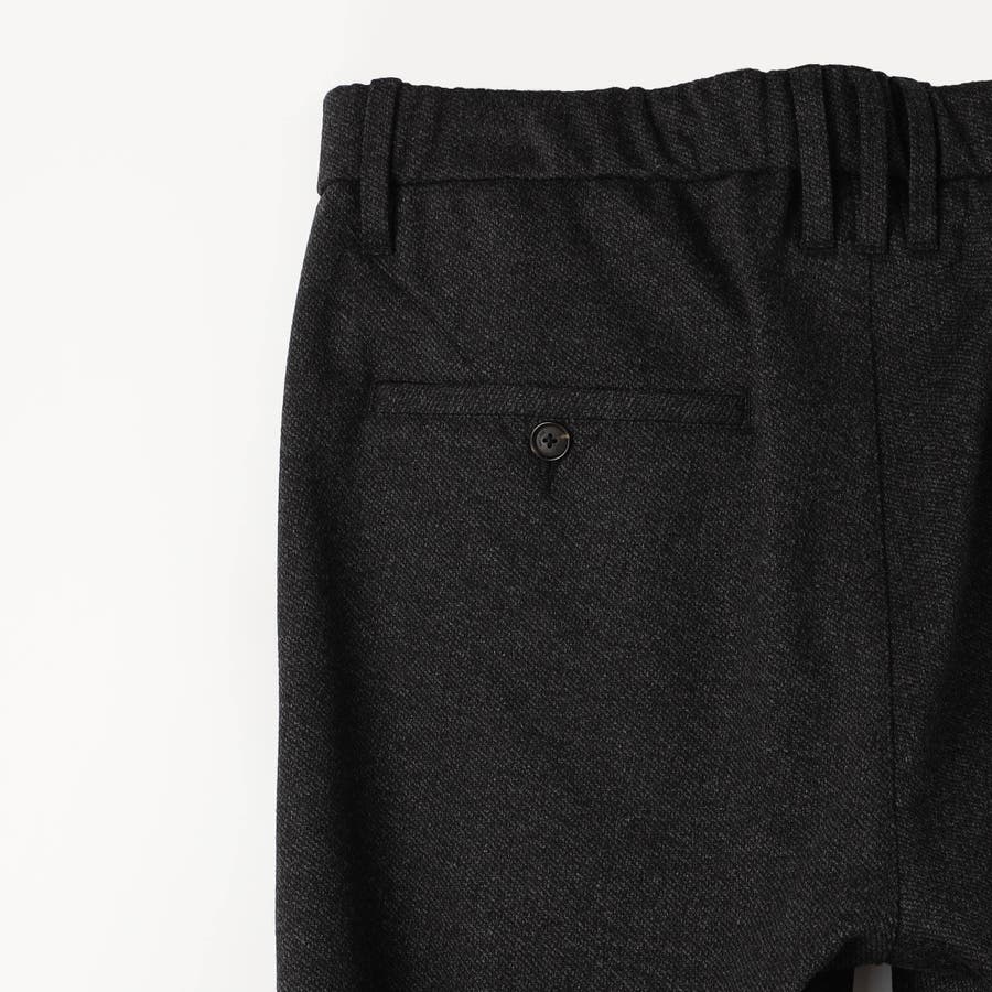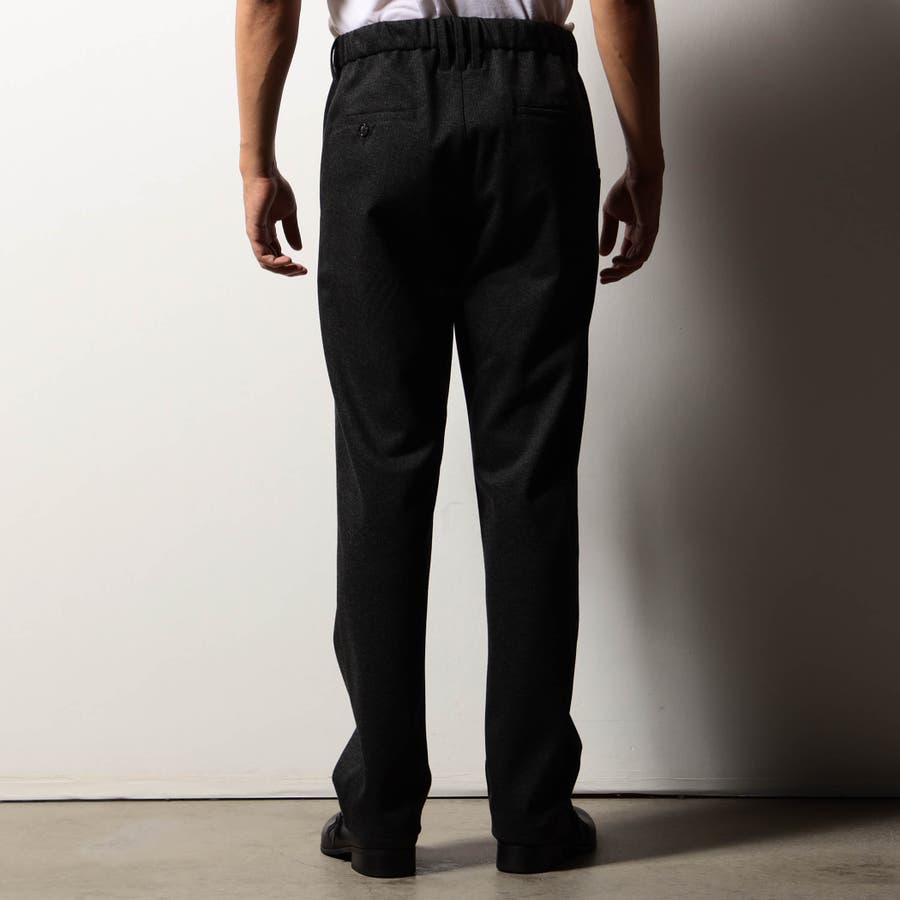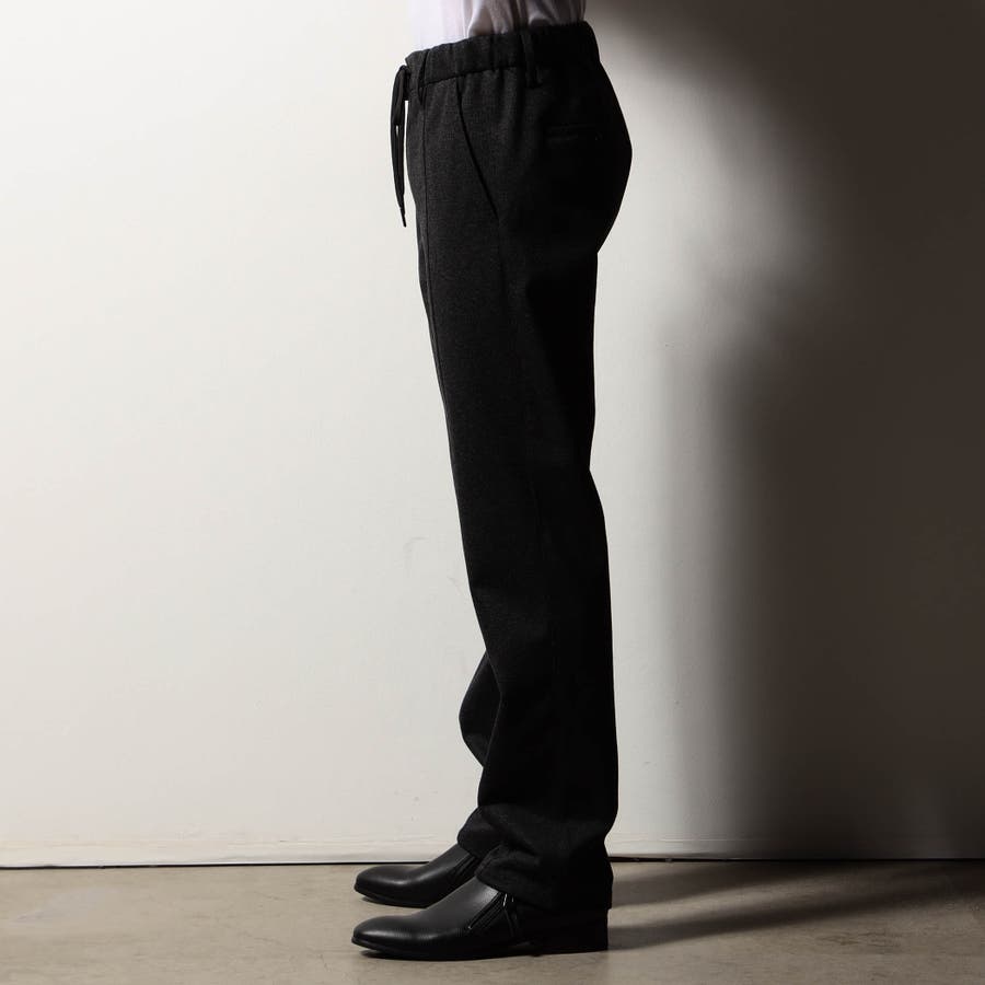 ウエストベルトには平ゴムを中に入れ、スピンドルを通したイージー仕様のスラックスパンツです。腰周りは少しタイトめに調整、裾口を広くしたパイプドステム・ストレートシルエットの綺麗なラインです。股下は少し短めの9分丈設定にしています。