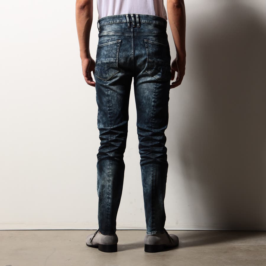 最終の製品加工を岡山のデニム専門の加工所(Wellsウェルズ)に依頼。中国で縫製後、ユーズドとケミカル加工を施し、全体のサイズ感を調整しています。国内で最終加工、顔料を混ぜた樹脂コーティング剤を部分的吹き付け、所々アイロンでしっかり抑える事で縫い代の厚みがある部分や平たい部分に光沢を出してコーティングパンツの様な質感に仕上げます。最後に立体的でリアルな3Dシワ加工を施し、更に陰影感をつける様に顔料を吹き付けています。