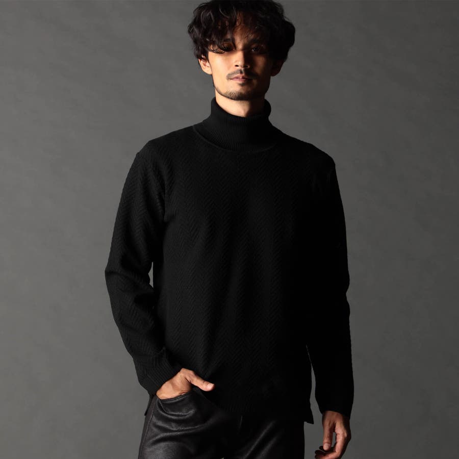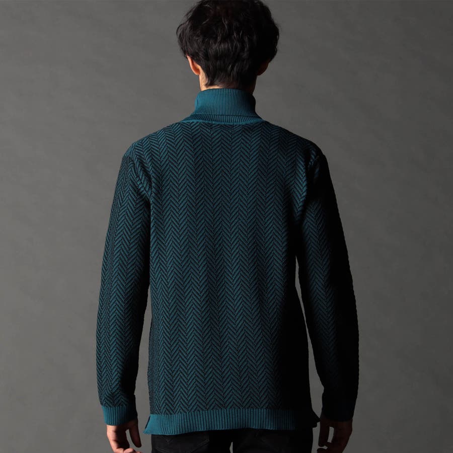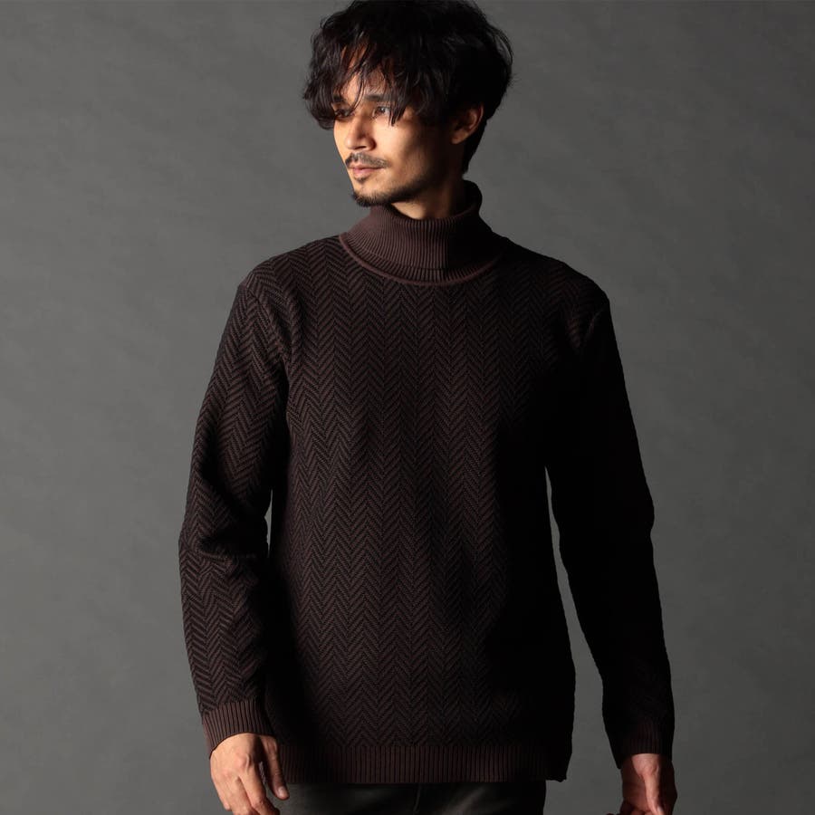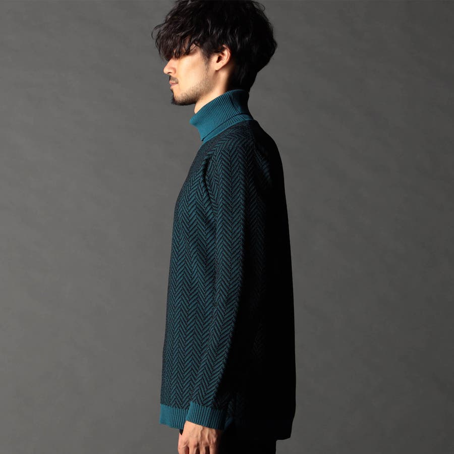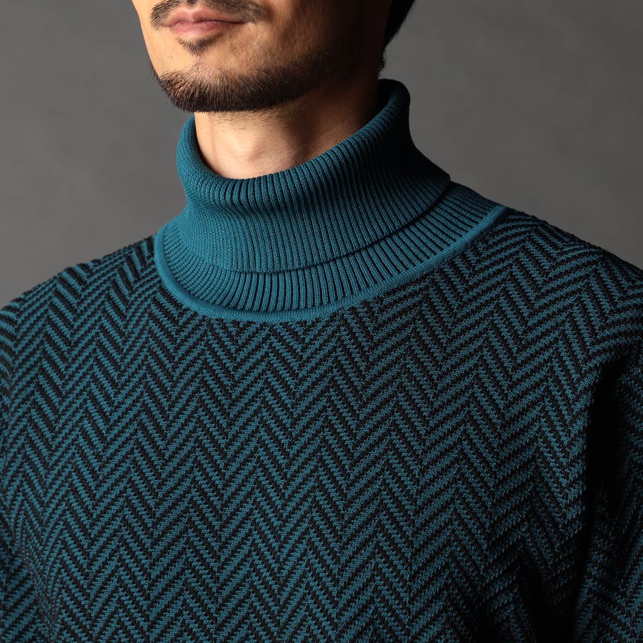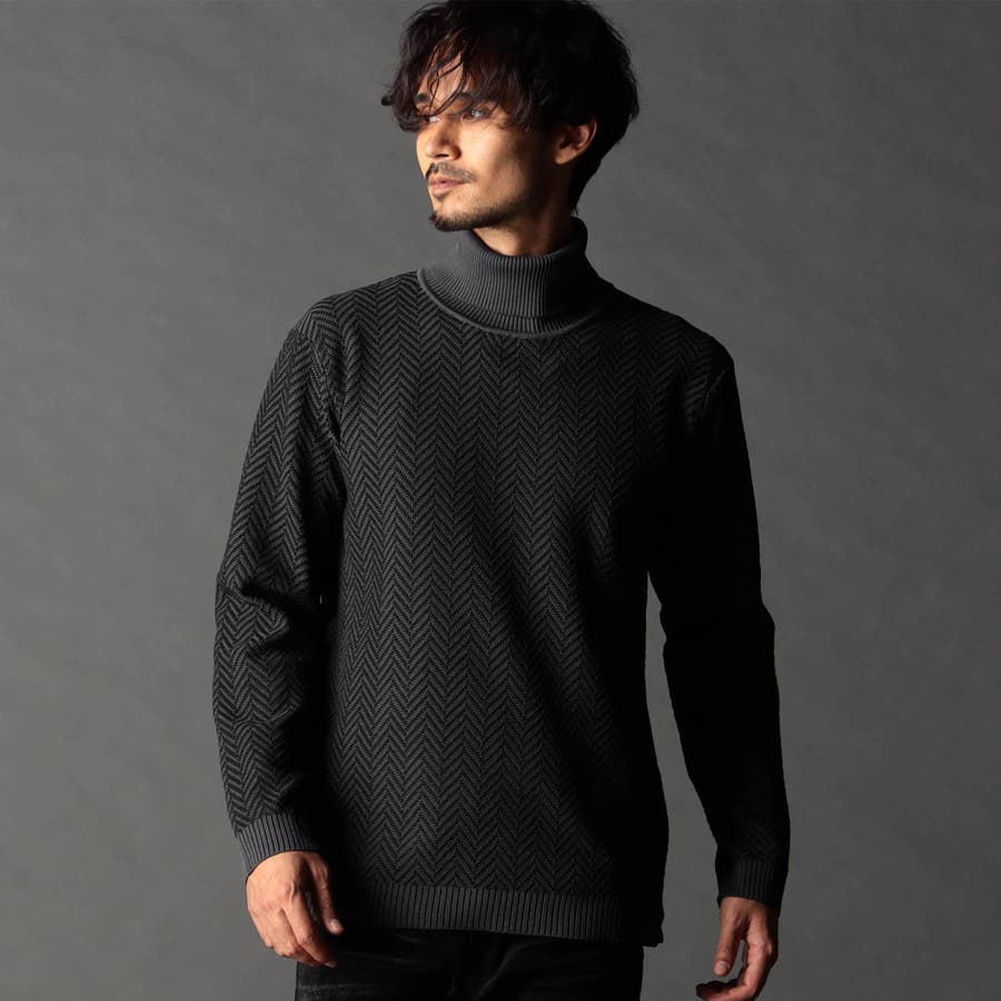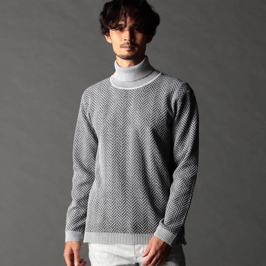 身頃部分の大き目なヘリンボン柄がインパクトのあるタートルネックニット。カフス、衿部分を総針リブにする事で全体の印象を引き締めています。