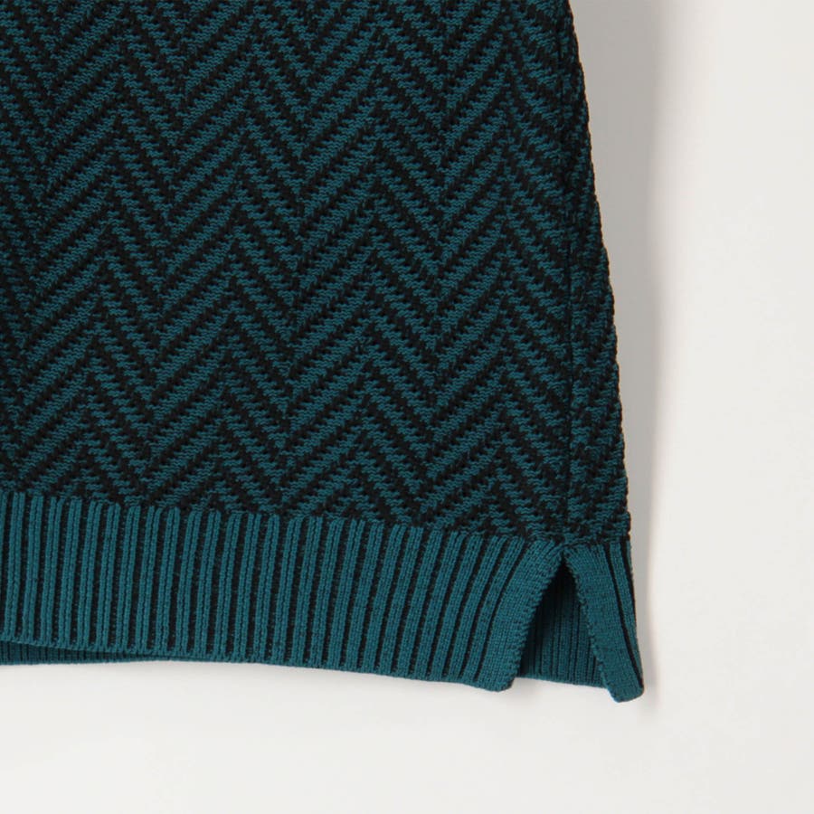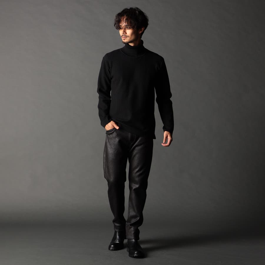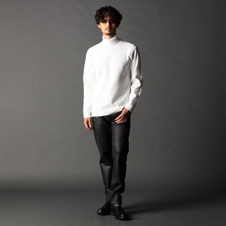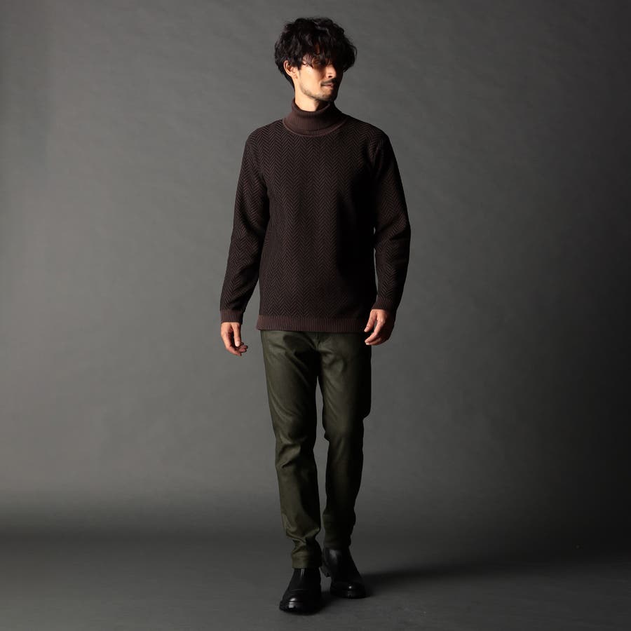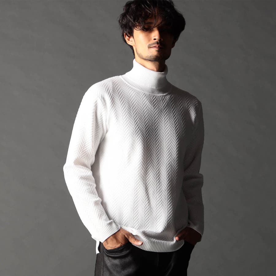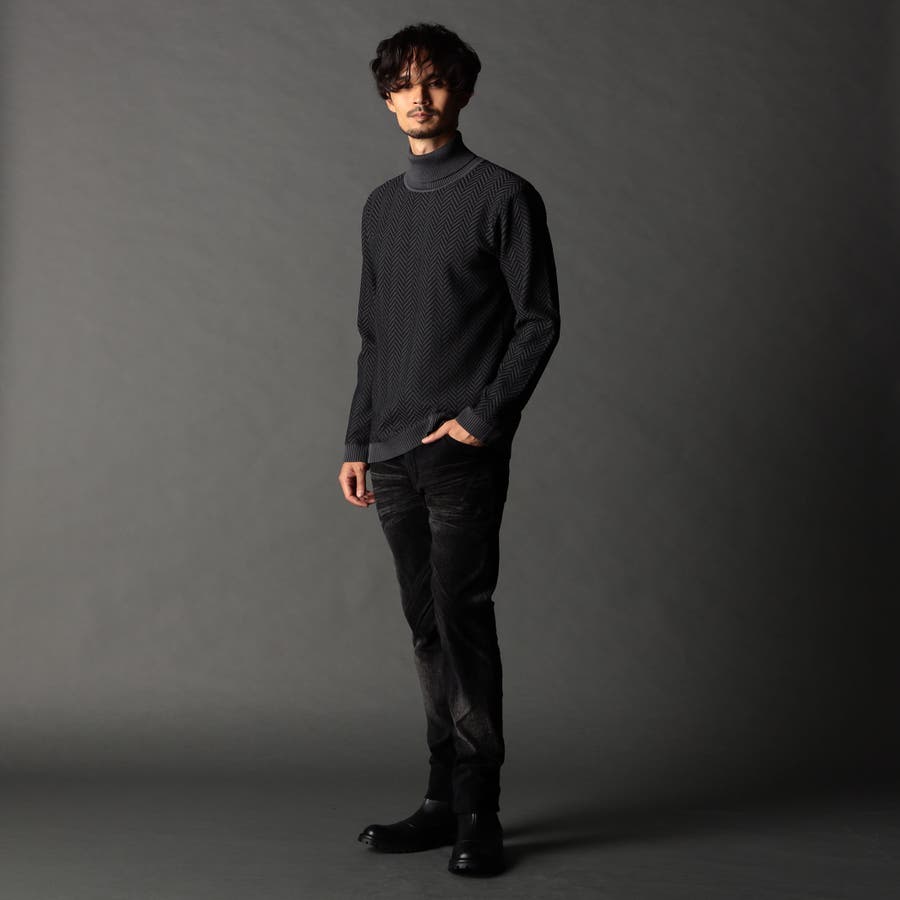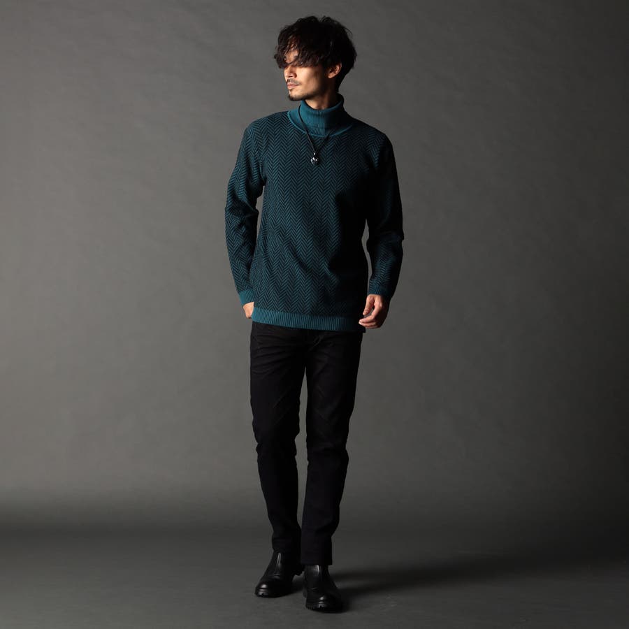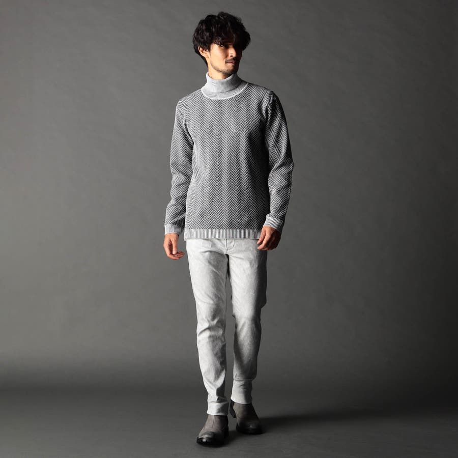 身頃部分の大き目なヘリンボン柄がインパクトのあるタートルネックニット。カフス、衿部分を総針リブにする事で全体の印象を引き締めています。