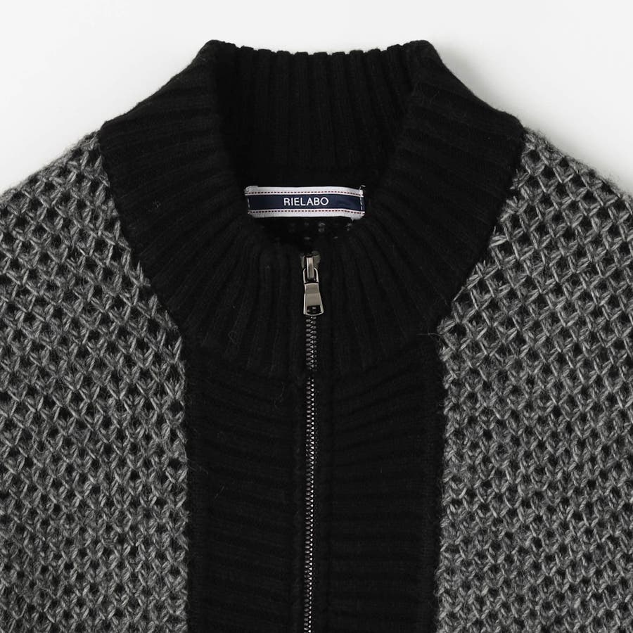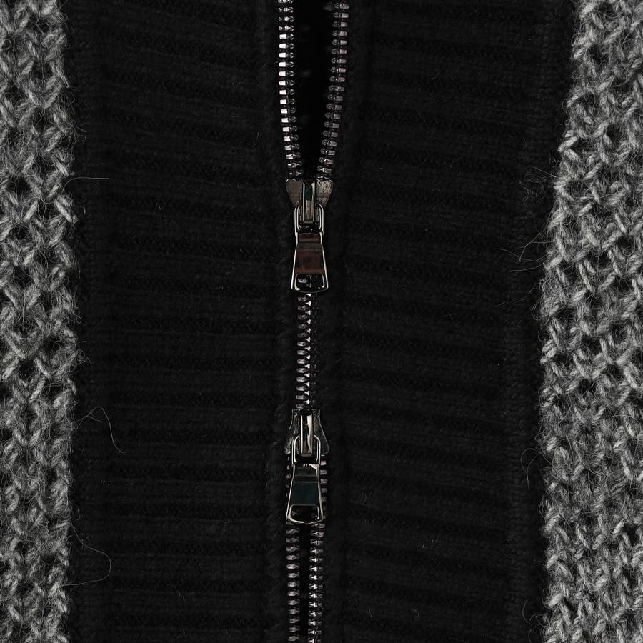 身頃を凹凸感のあるタックステッチで編み立てたドライバーズニット。杢調の色の出方と程よい毛足の長さでシーズン感たっぷりな1着です。フロントの箔転写ファスナーをアクセントポイントに、ラグジュアリーかつモードな印象に仕上げました。部分的に編地を切り替え着用感を高めながらシャープなシルエットを演出。脇前の切替部分にはスラッシュポケットを設け、脇下の縫代部分にはデオドラントテープを叩きつけて機能性もプラスしています。