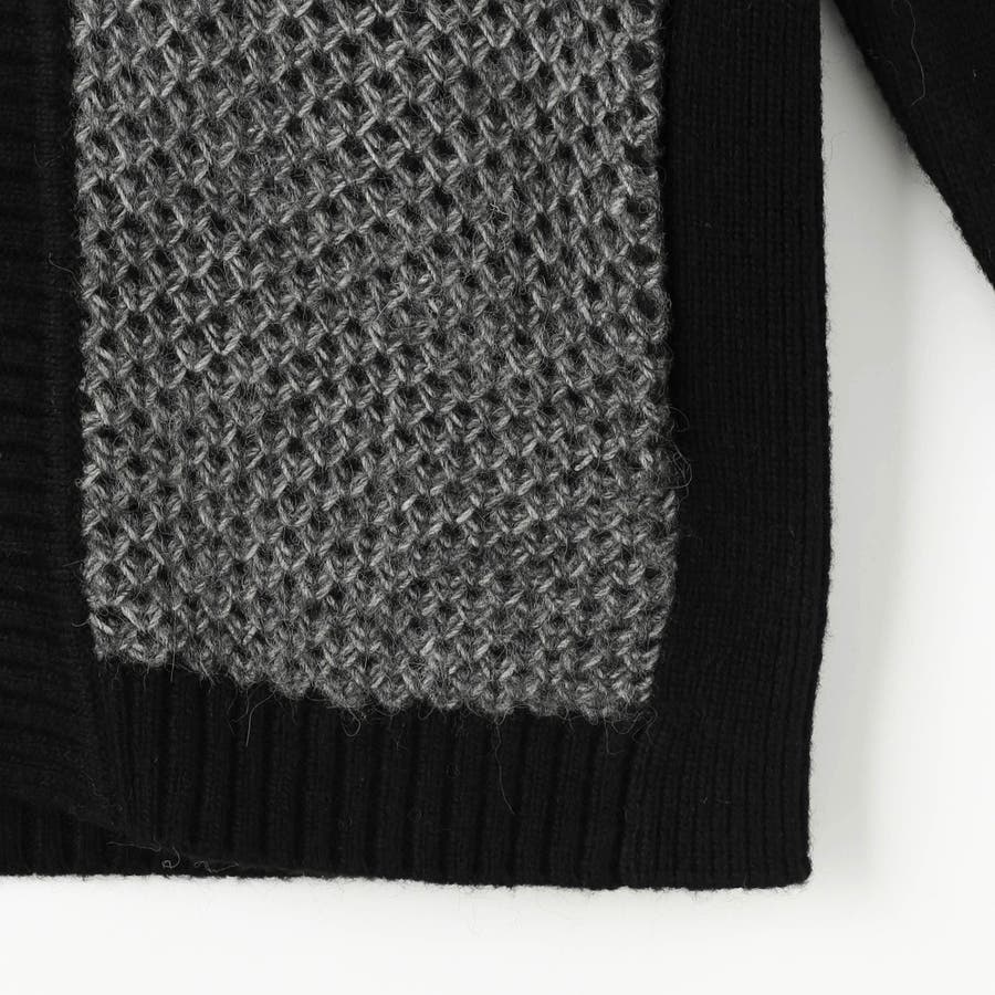 身頃には表に杢調糸、裏に単色糸が出るように引き上げ編みの技法で編み立てたタックステッチ編地。ポコポコとしたふくらみのある編地を程よい毛足の長さがある4者混糸で編み立てることでウォーム感を演出しています。袖は天竺編み、前立てと細腹はリブ編みにすることでメリハリを付けました。ニットならではのストレッチ性は保ちつつ、しっかりめに目付を持たせて保温性も確保した秋冬にピッタリの素材です。