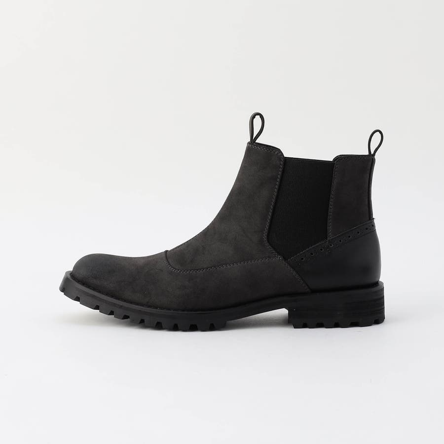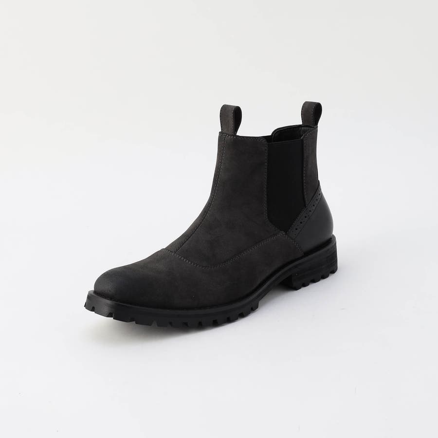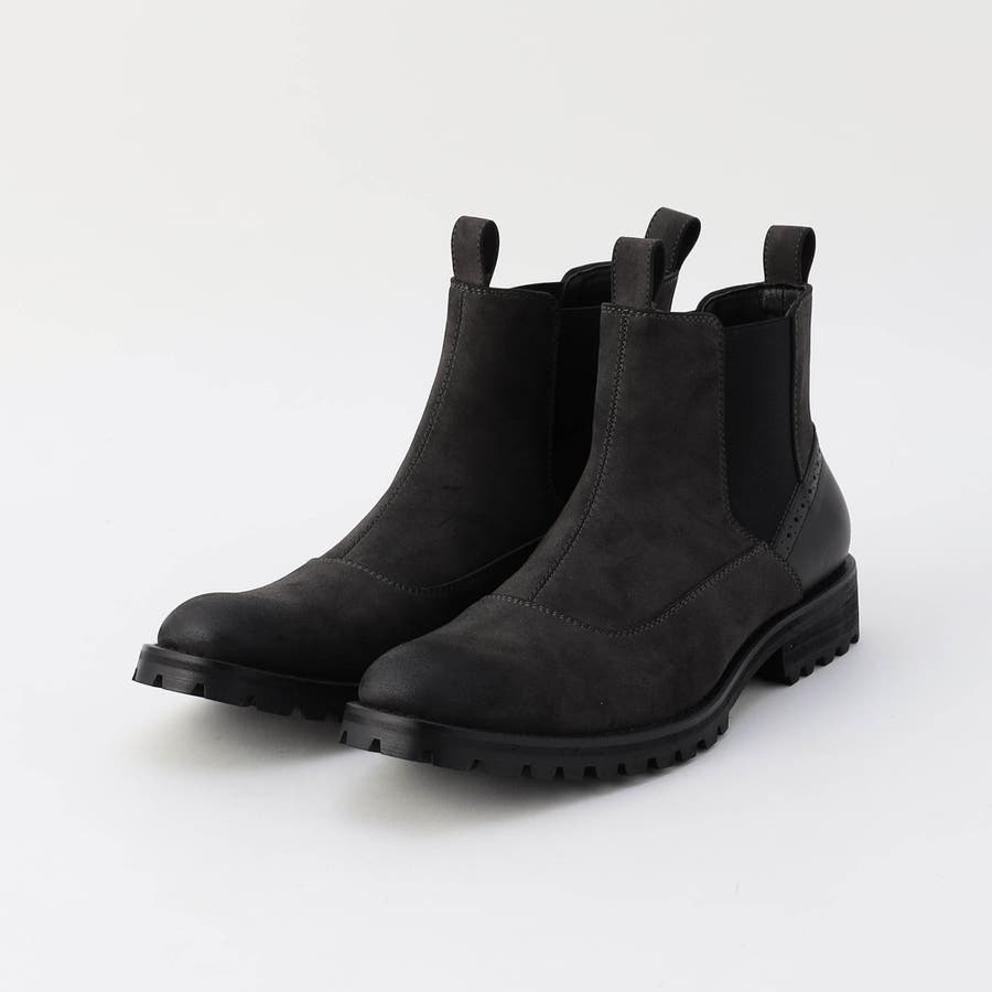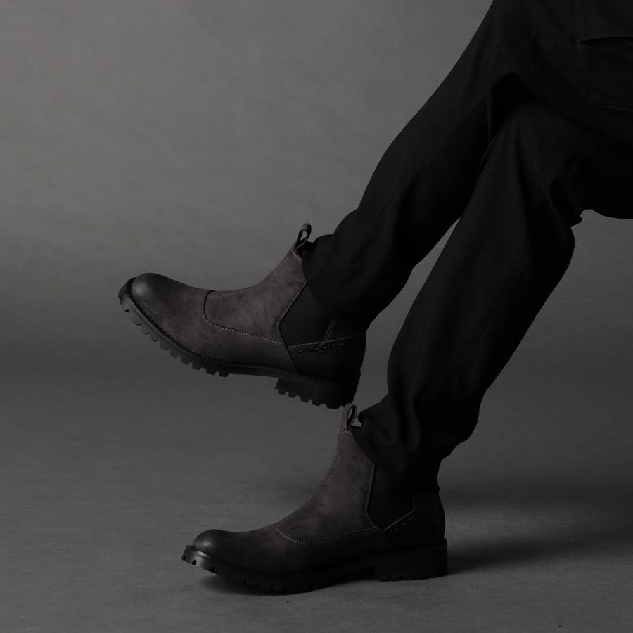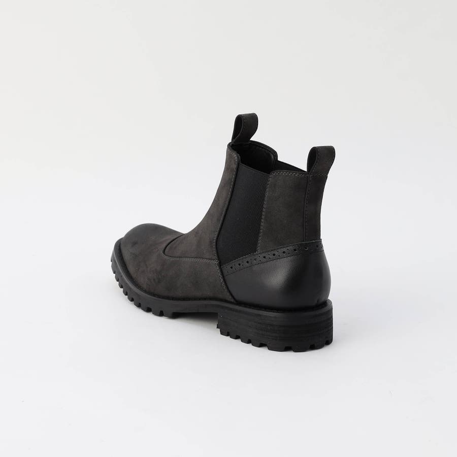 少し厚みのあるタンクソールのサイドゴアブーツ。トゥスプリングの効いたシャープなシルエットで少し細長いの綺麗なラスト(木型)を採用しています。履き口の形状や切り替えデザインなど曲線を意識した綺麗なラインが特徴的で、メダリオンを入れた牛革のヒールカウンターがアクセントです。インソールはフィット感の高いソフトなタイプを採用、タンクソールはコバを張り出し、中間に5mm程のEVAを挟み、厚みのあるボリューム感を出しながら軽量感・クッション性を高めています。ブランドストーンなど機能性を重視したブランドに多い、履き口の前後にストラップを付けていますので履きやすいです。トゥ部分には手作業による仕上げ加工を強めに入れて重厚感のある雰囲気を出しました。綺麗めからカジュアルな組み合わせの相性も良いので冬のコーディネートの幅を広げてくれます。(※EVAとは、エチレンビニールアセテートの頭文字をとったソール素材の頭文字です。 EVA は自然に伸縮性のあるエラストマー ポリマー素材で、並外れた柔らかさと柔軟性を提供します。)