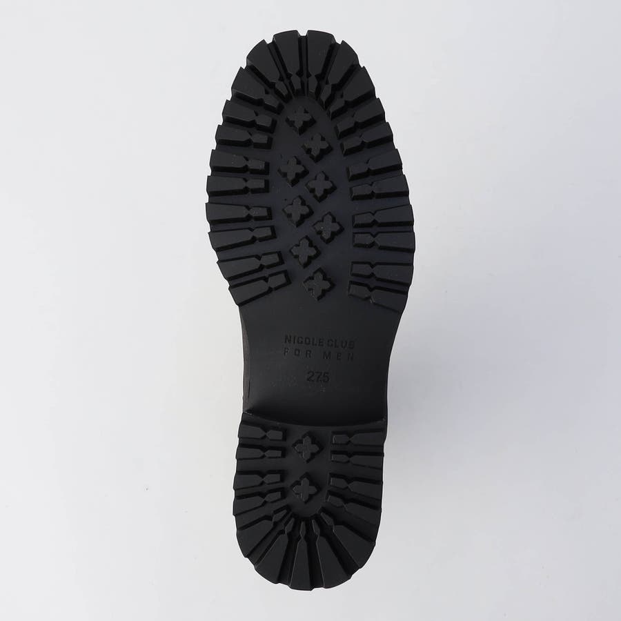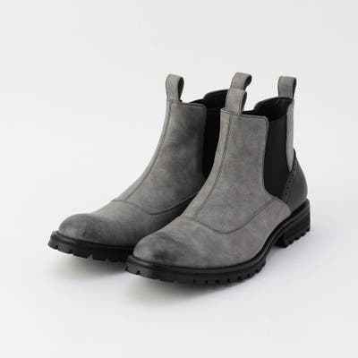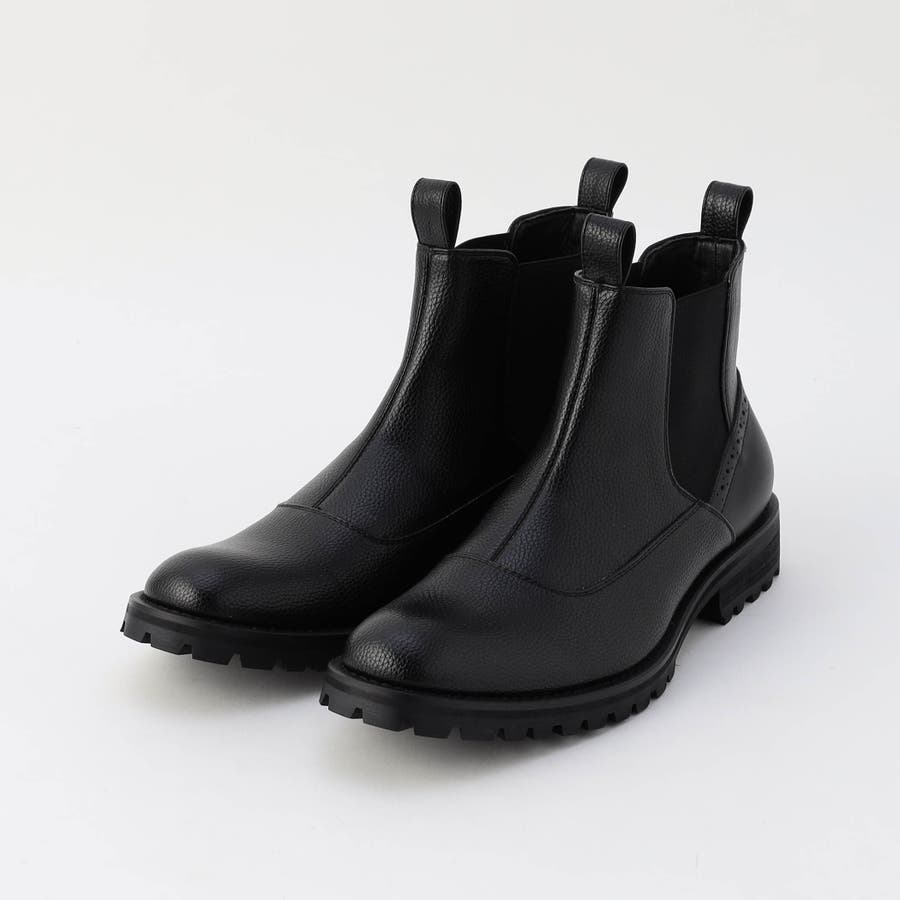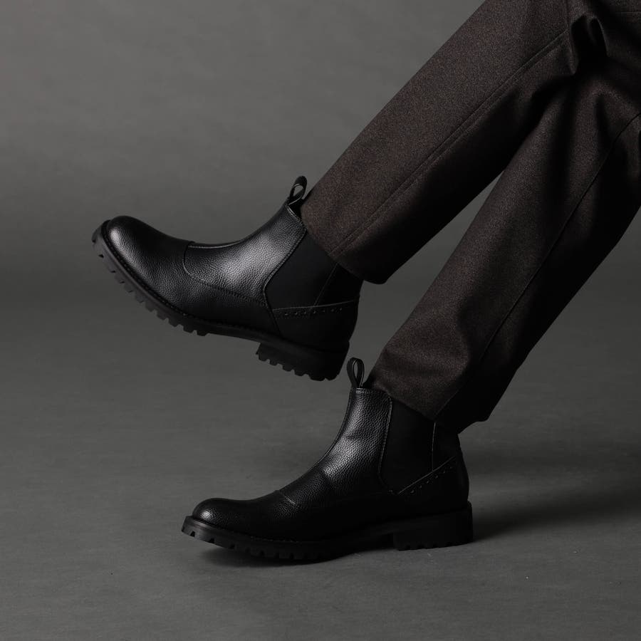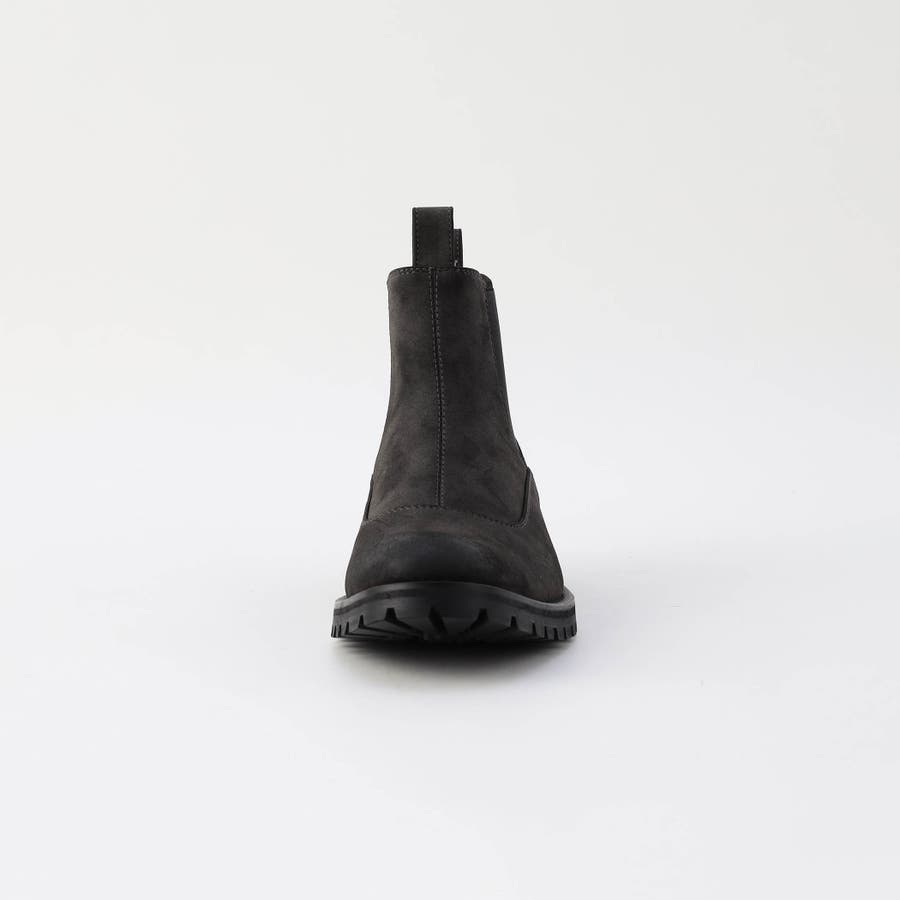少し厚みのあるタンクソールのサイドゴアブーツ。トゥスプリングの効いたシャープなシルエットで少し細長いの綺麗なラスト(木型)を採用しています。履き口の形状や切り替えデザインなど曲線を意識した綺麗なラインが特徴的で、メダリオンを入れた牛革のヒールカウンターがアクセントです。インソールはフィット感の高いソフトなタイプを採用、タンクソールはコバを張り出し、中間に5mm程のEVAを挟み、厚みのあるボリューム感を出しながら軽量感・クッション性を高めています。ブランドストーンなど機能性を重視したブランドに多い、履き口の前後にストラップを付けていますので履きやすいです。トゥ部分には手作業による仕上げ加工を強めに入れて重厚感のある雰囲気を出しました。綺麗めからカジュアルな組み合わせの相性も良いので冬のコーディネートの幅を広げてくれます。(※EVAとは、エチレンビニールアセテートの頭文字をとったソール素材の頭文字です。 EVA は自然に伸縮性のあるエラストマー ポリマー素材で、並外れた柔らかさと柔軟性を提供します。)
