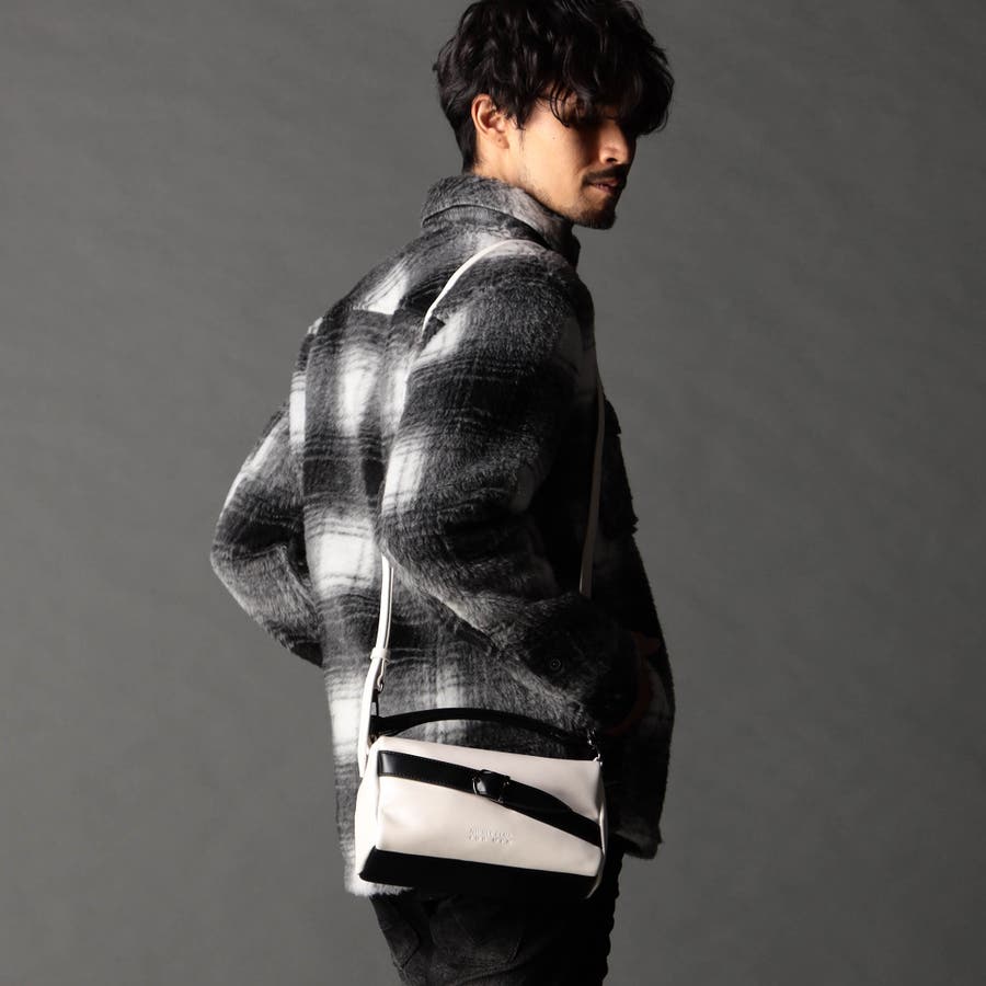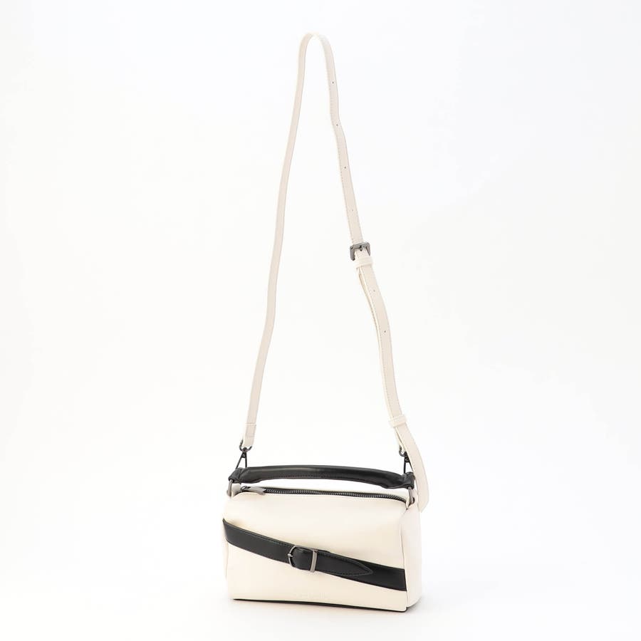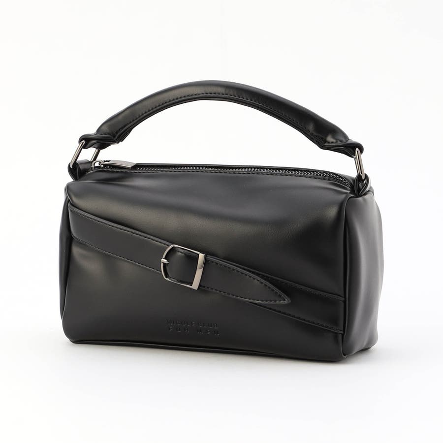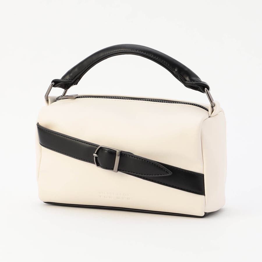 手持ち用のハンドルに加えて付属のショルダーベルトを取り付けて肩掛けも可能な2WAYバッグ。フロントのベルトデザインとブランドロゴがモードな印象を演出します。背面のセパレートポケットには小物やカード類を収納できるようにしました。更に内装にはファスナーポケットとパッチポケットを設けることでコンパクトながら物の仕分けも容易です。ブランドロゴ刻印入りのオリジナルファスナー引手をはじめ、金具類はブラックニッケルに統一して引き締めました。ジャケットスタイルにも合わせやすいシックな印象のバッグです。