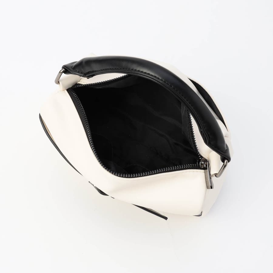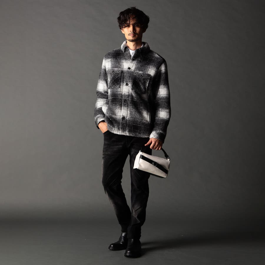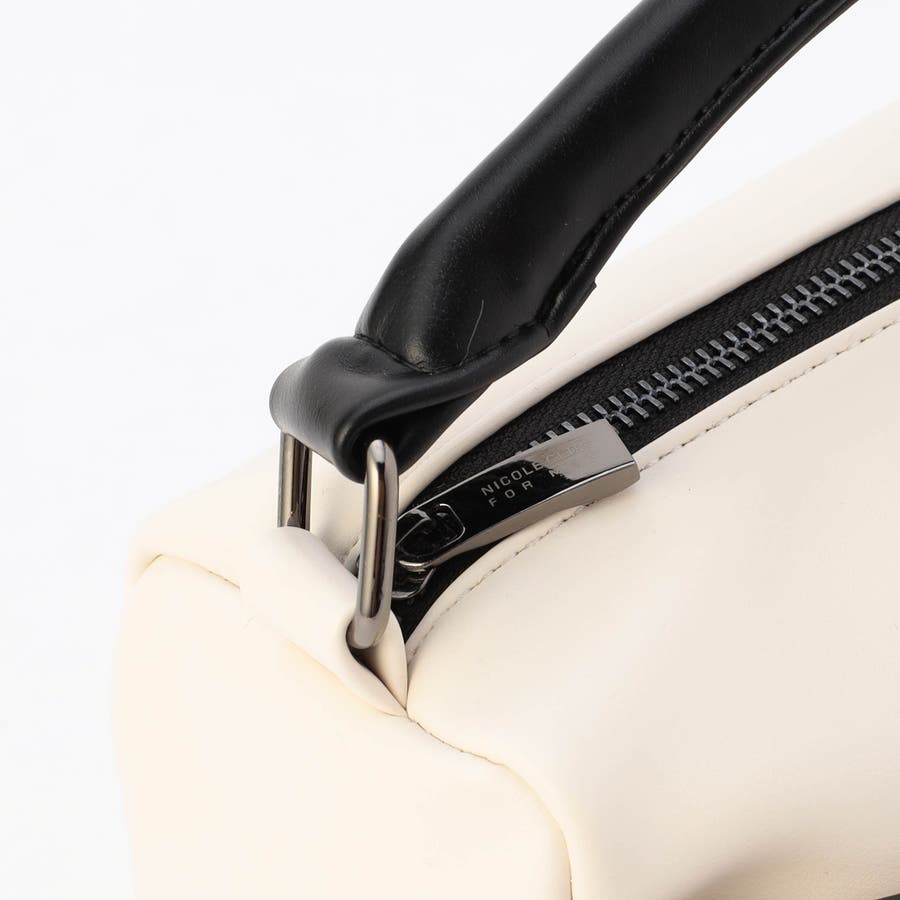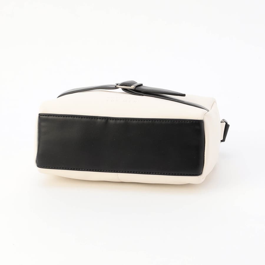 手持ち用のハンドルに加えて付属のショルダーベルトを取り付けて肩掛けも可能な2WAYバッグ。フロントのベルトデザインとブランドロゴがモードな印象を演出します。背面のセパレートポケットには小物やカード類を収納できるようにしました。更に内装にはファスナーポケットとパッチポケットを設けることでコンパクトながら物の仕分けも容易です。ブランドロゴ刻印入りのオリジナルファスナー引手をはじめ、金具類はブラックニッケルに統一して引き締めました。ジャケットスタイルにも合わせやすいシックな印象のバッグです。