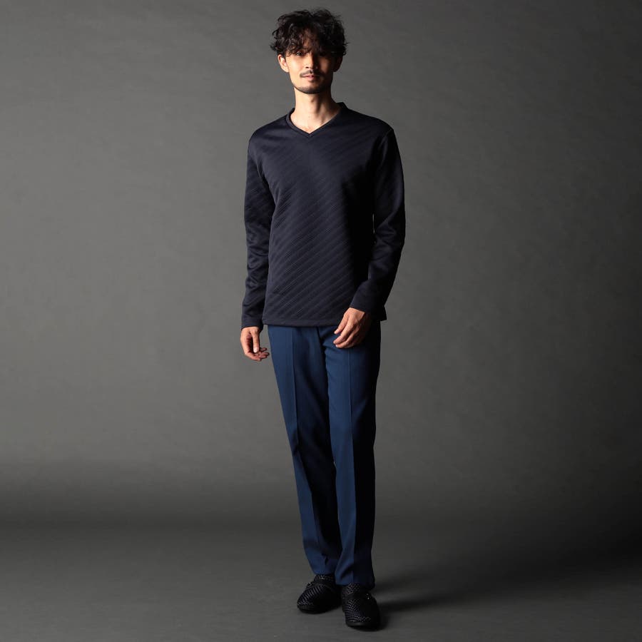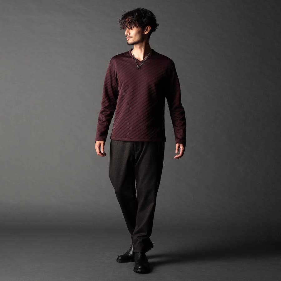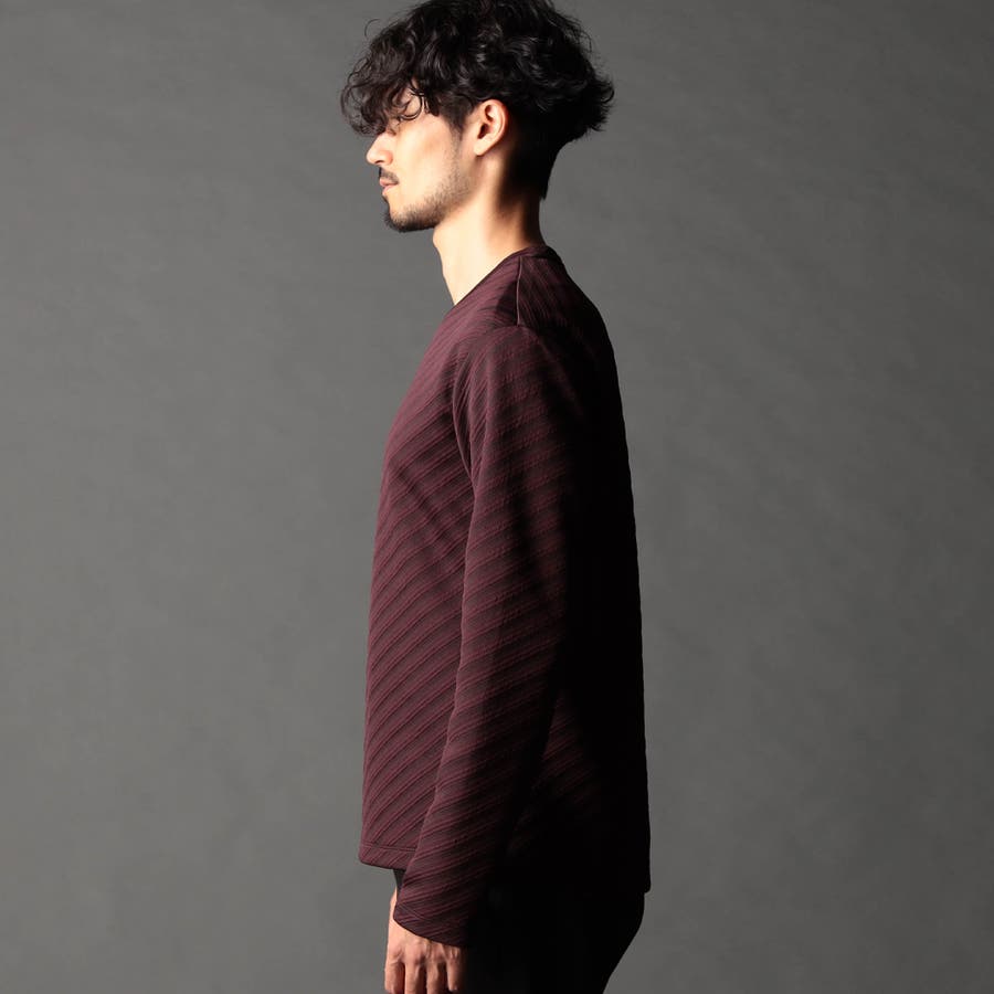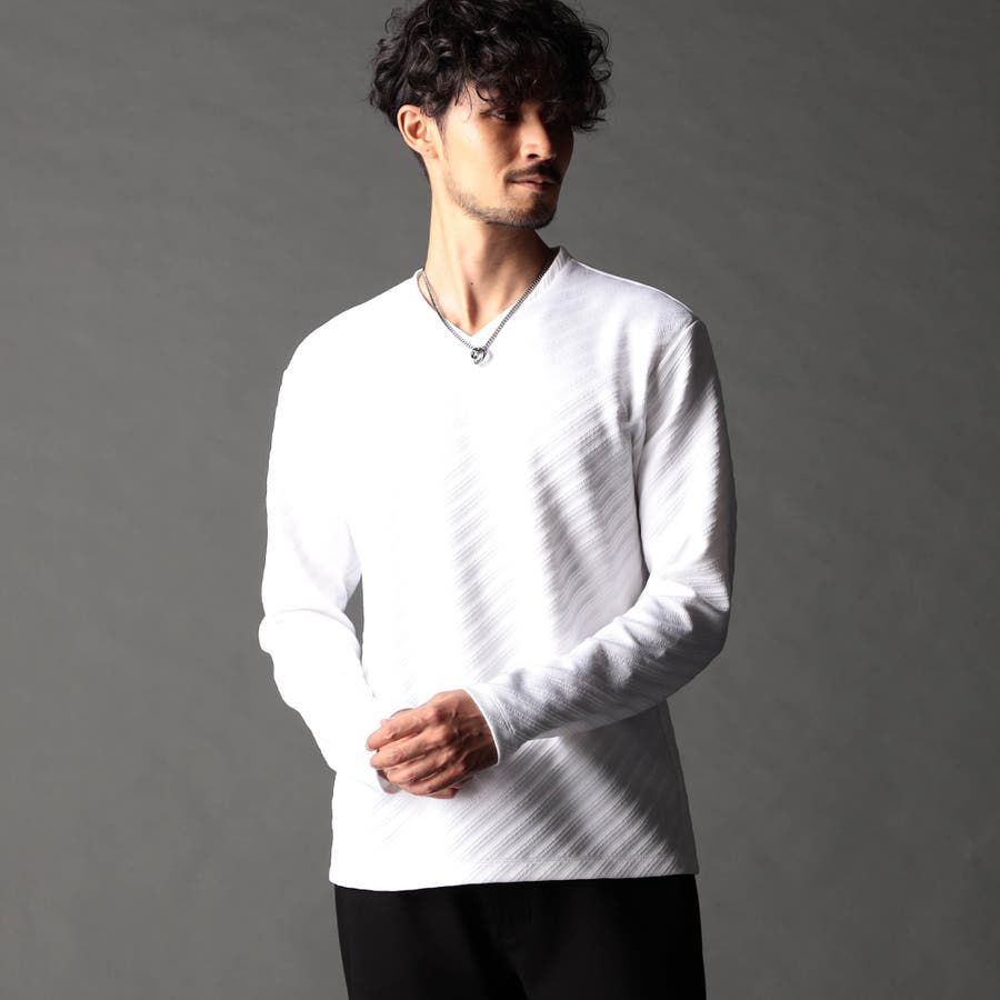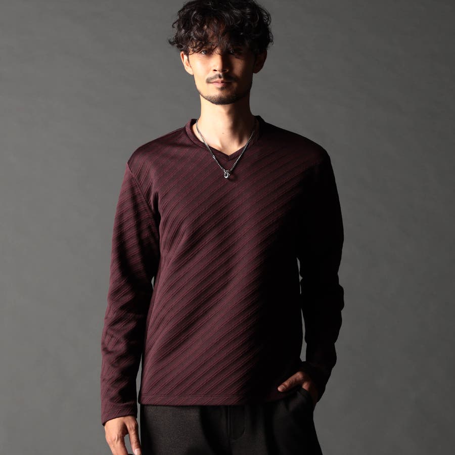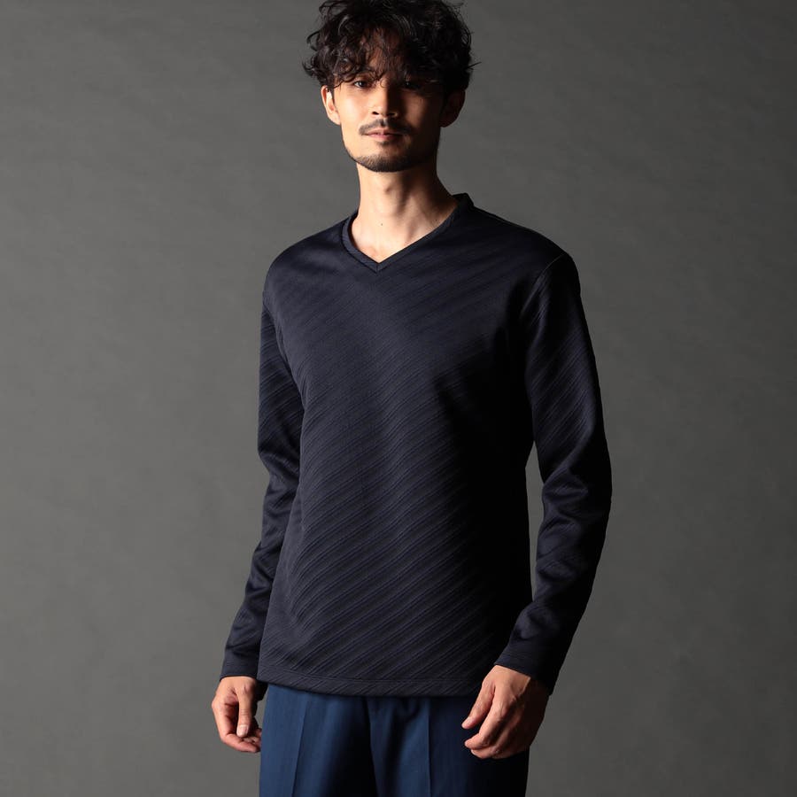 ブリスター(膨れ)編みにより凹凸感のあるバイヤス柄を表現し シャープな印象とウォーム感を持たせたシンプルな浅VネックロンT。