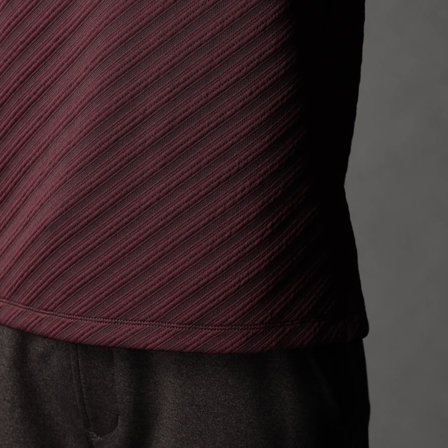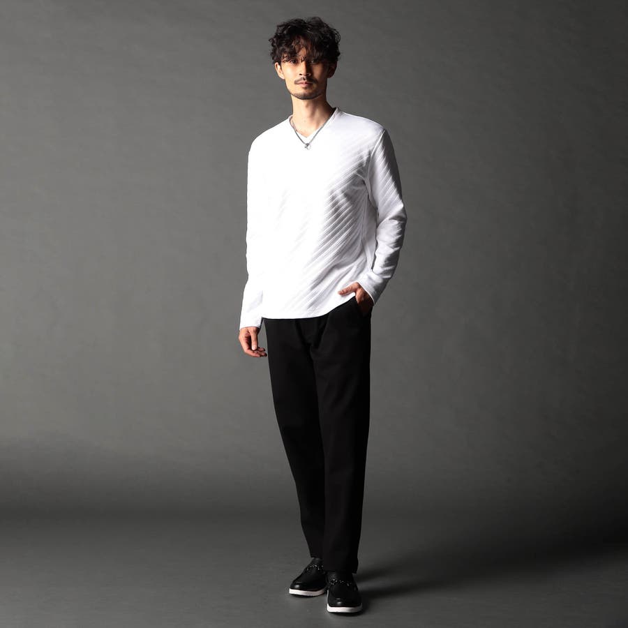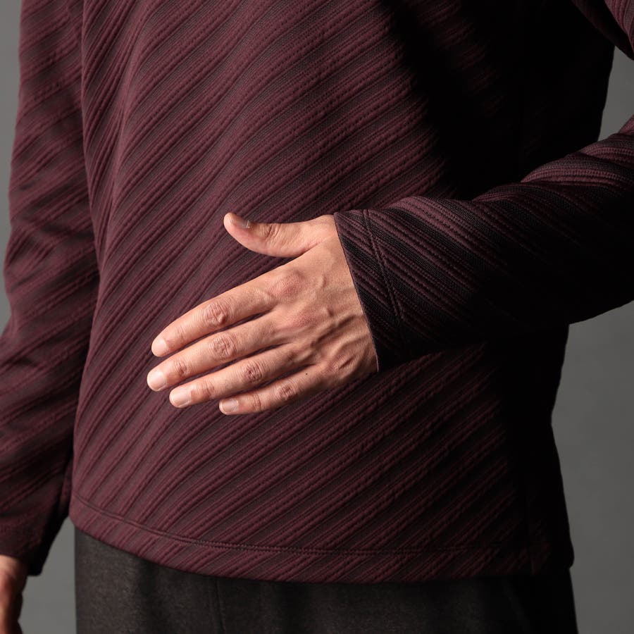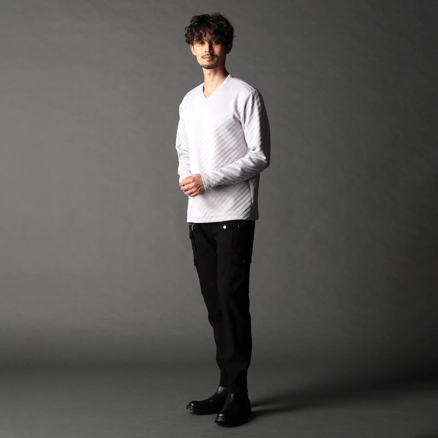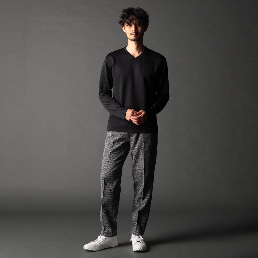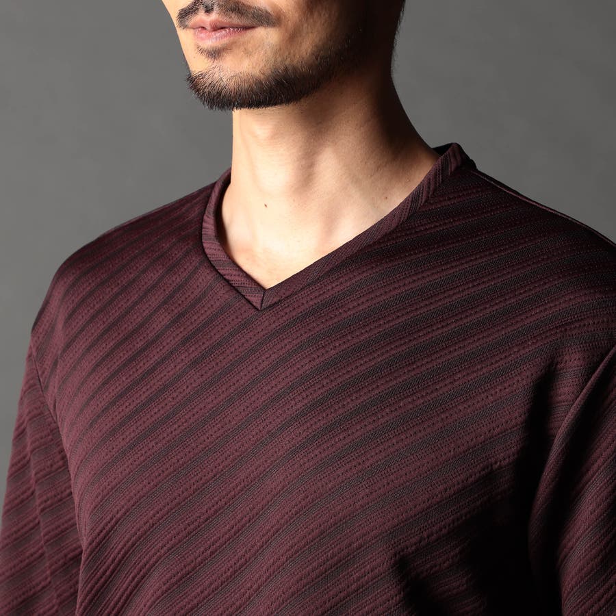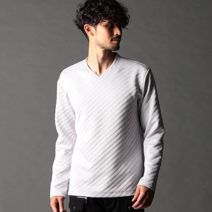 ブリスター(膨れ)編みにより凹凸感のあるバイヤス柄を表現し シャープな印象とウォーム感を持たせたシンプルな浅VネックロンT。