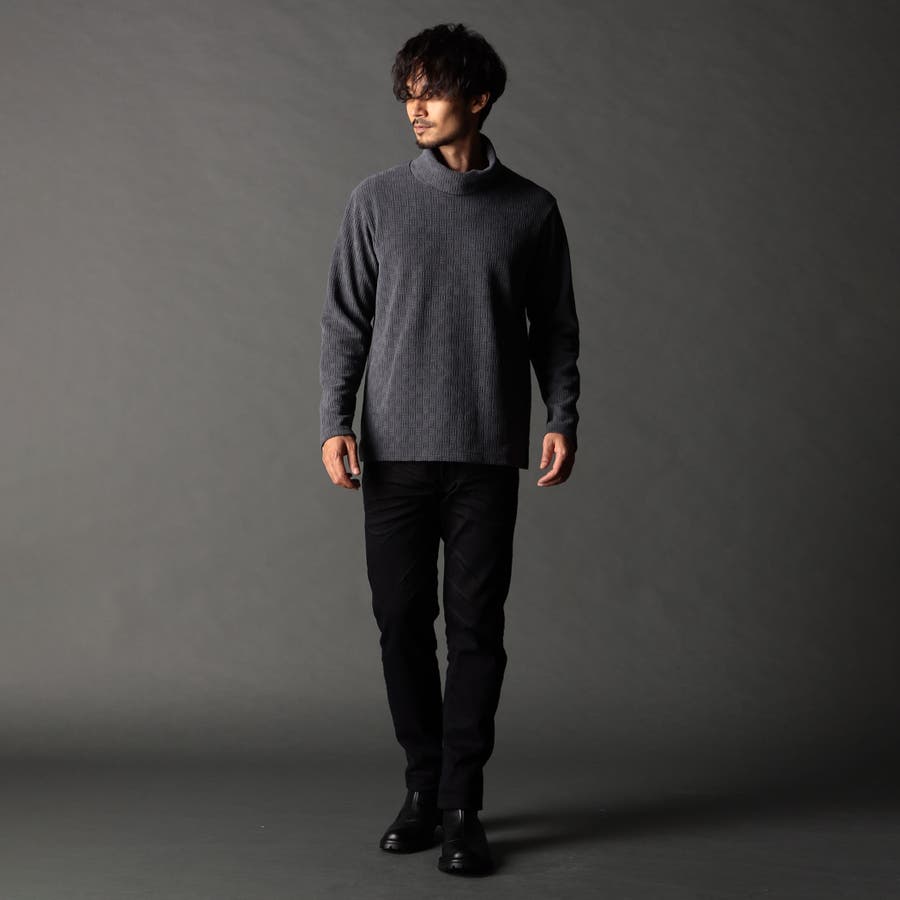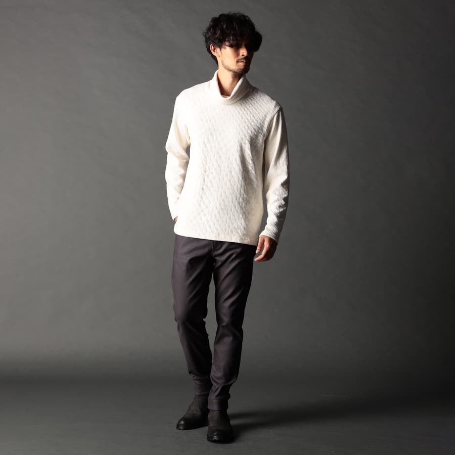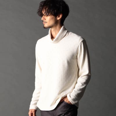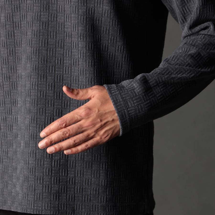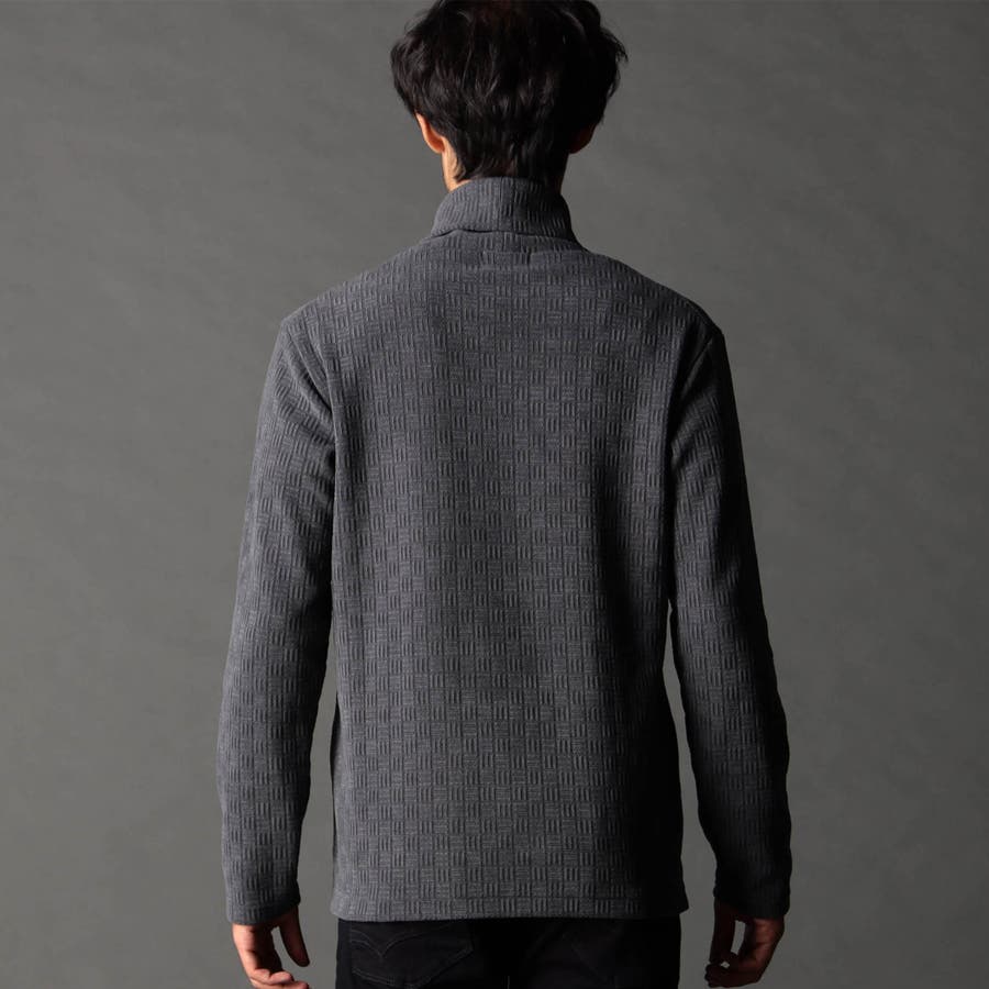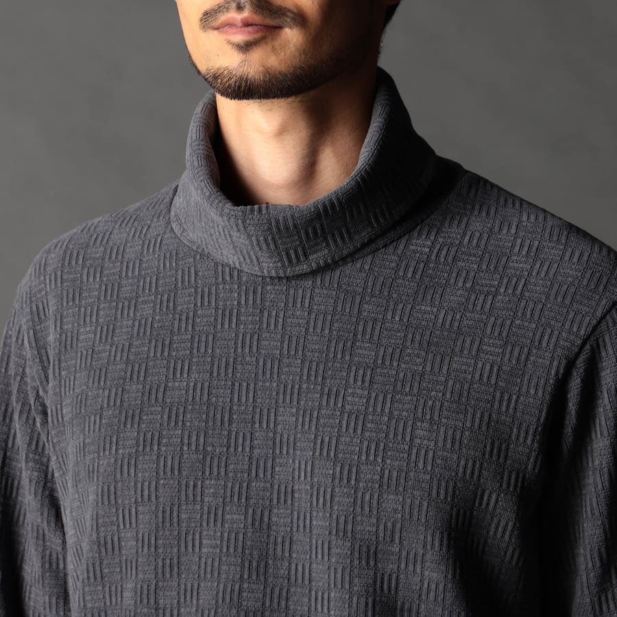 編地の凹凸で奥行きのあるブロックチェック柄をジャカードで表現したオフタートルプルオーバー。衿元の前下がりを深めにとることで首周りの締め付けが気にならず程よい抜け感も演出してくれるデザインです。薄すぎず厚すぎない肉厚感で、一枚でトレーナー感覚でも、冬場のインナーとしても活躍します。裾脇のスリット仕様がアクセントになっています。