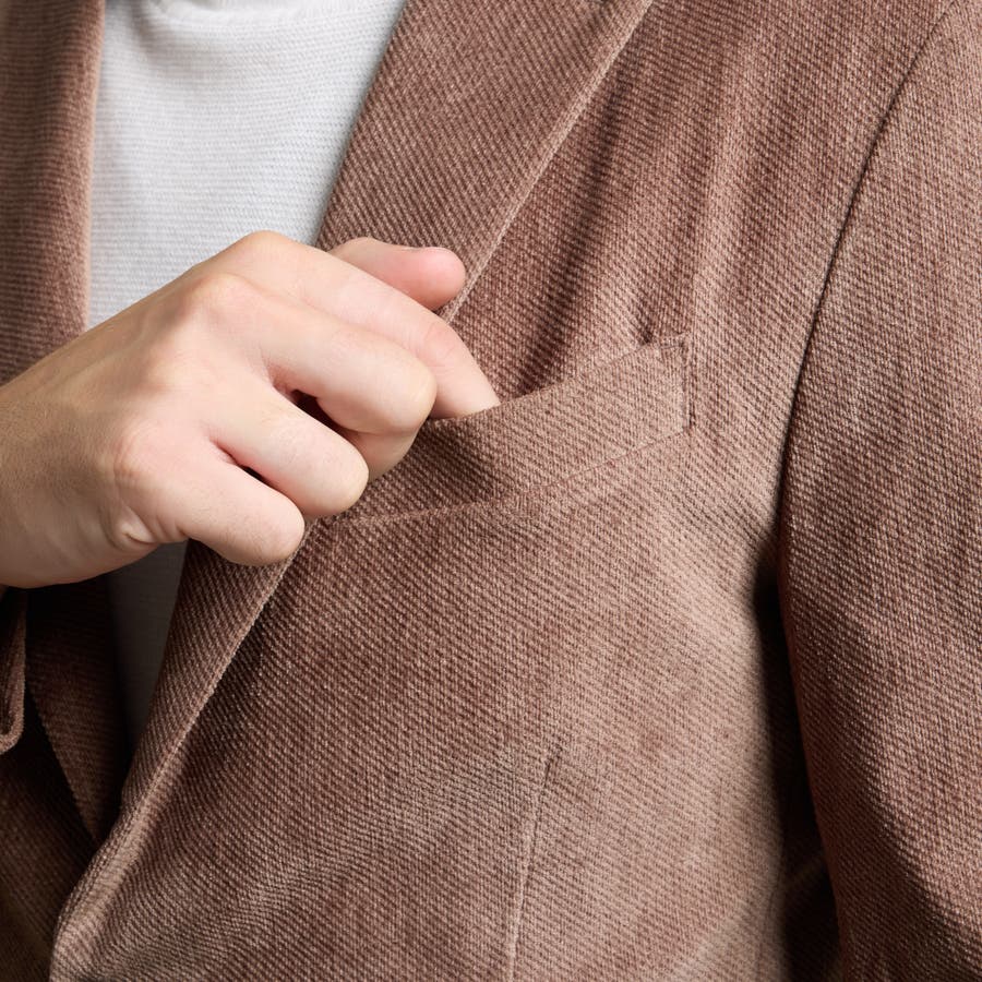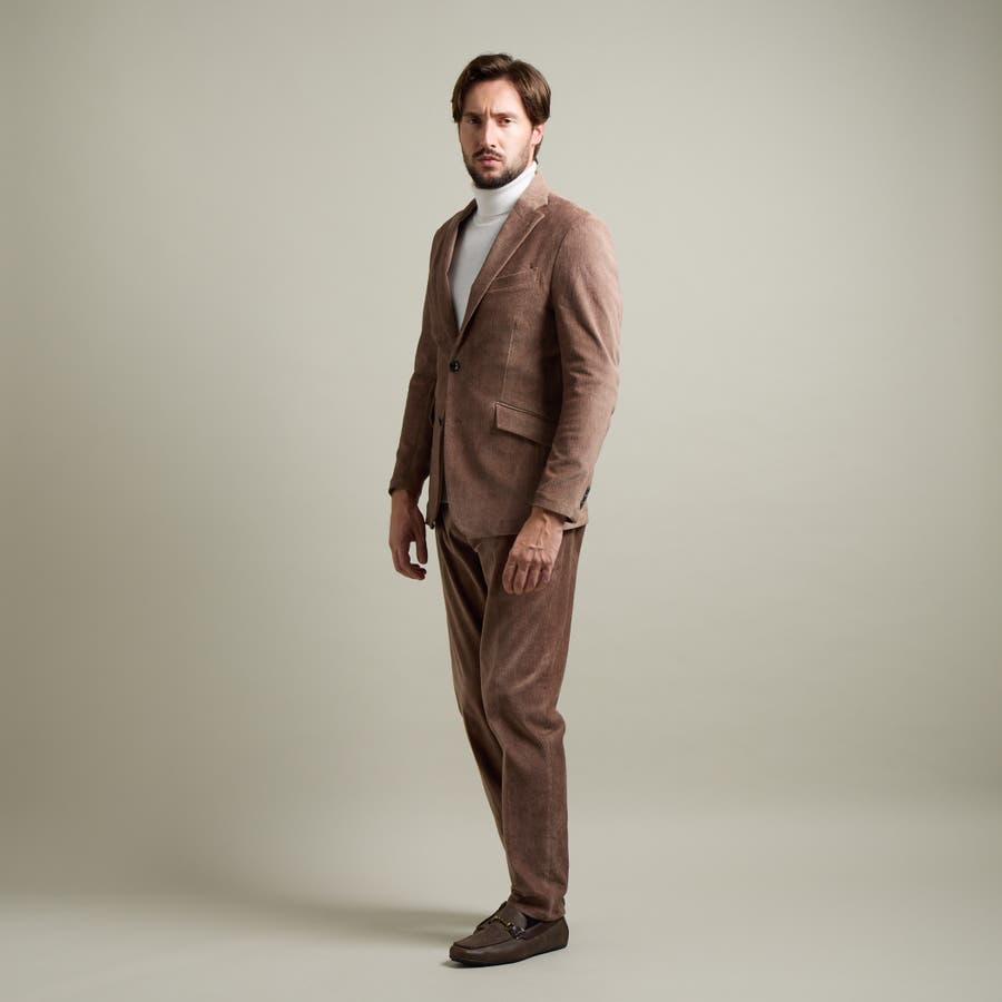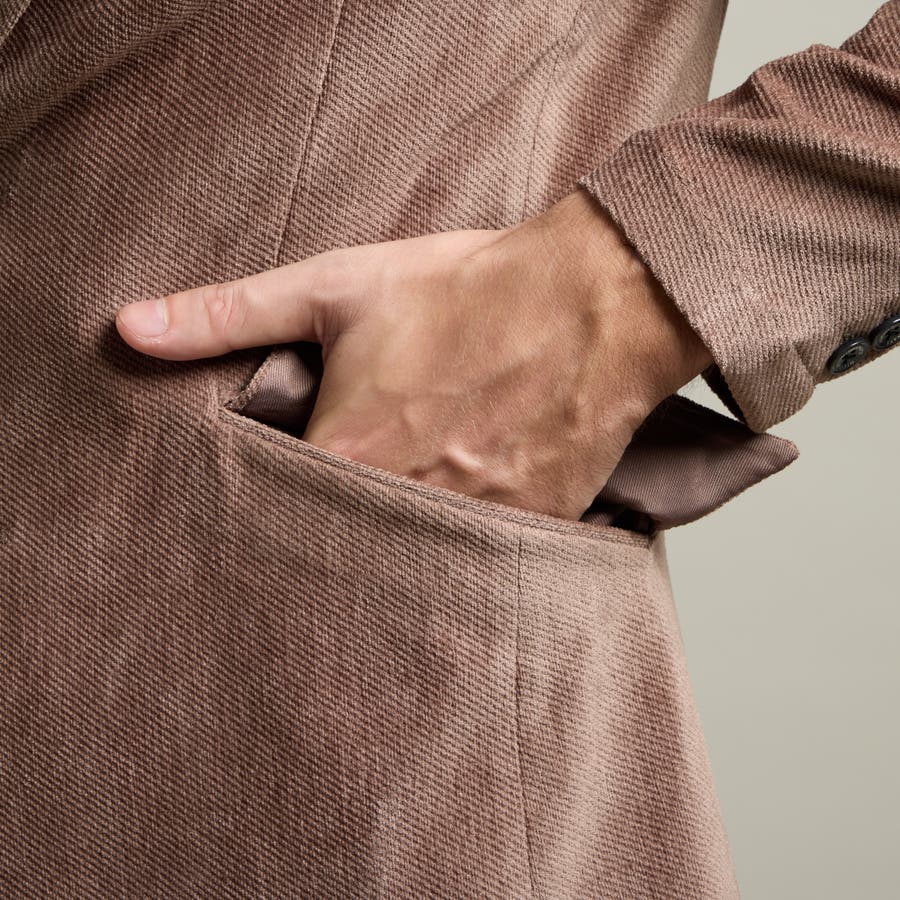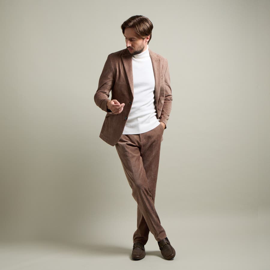 縦畝(ウネ)のコーデュロイとは違う、斜めの組織感が特長のカルゼ柄が上品さをかもし出します。