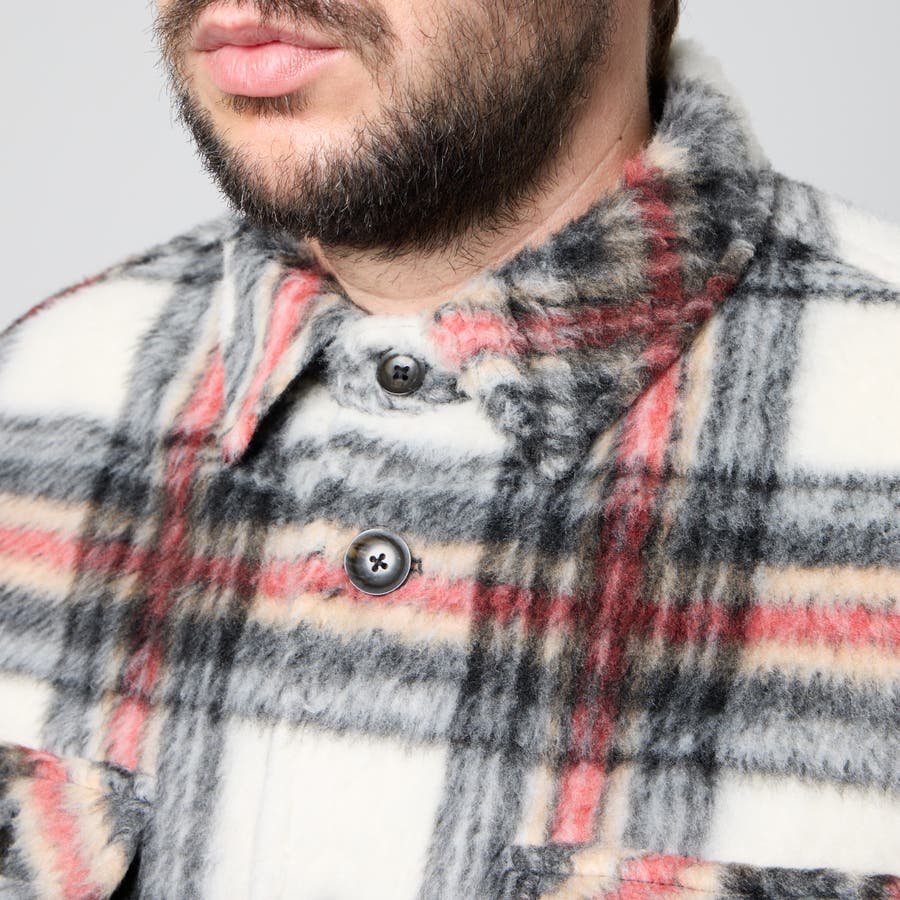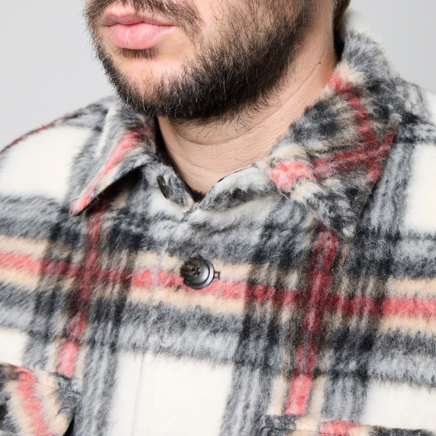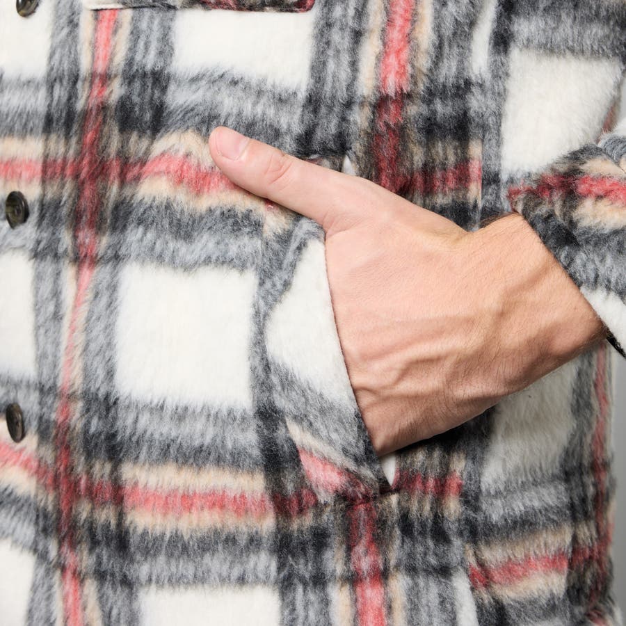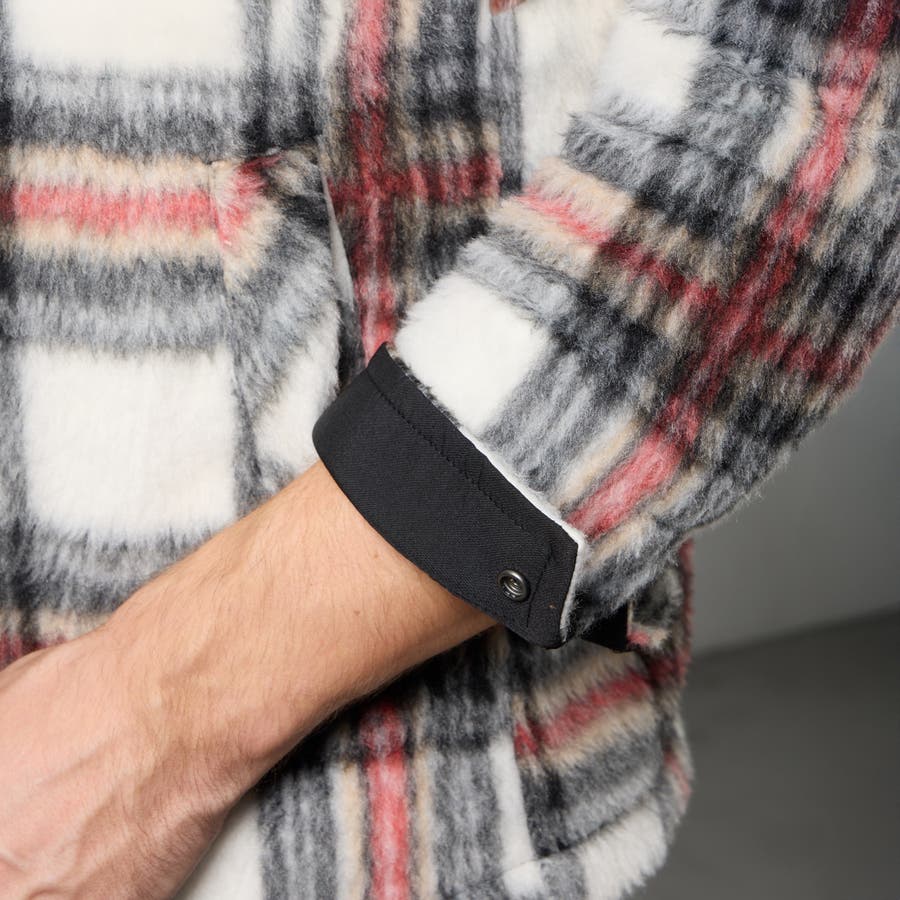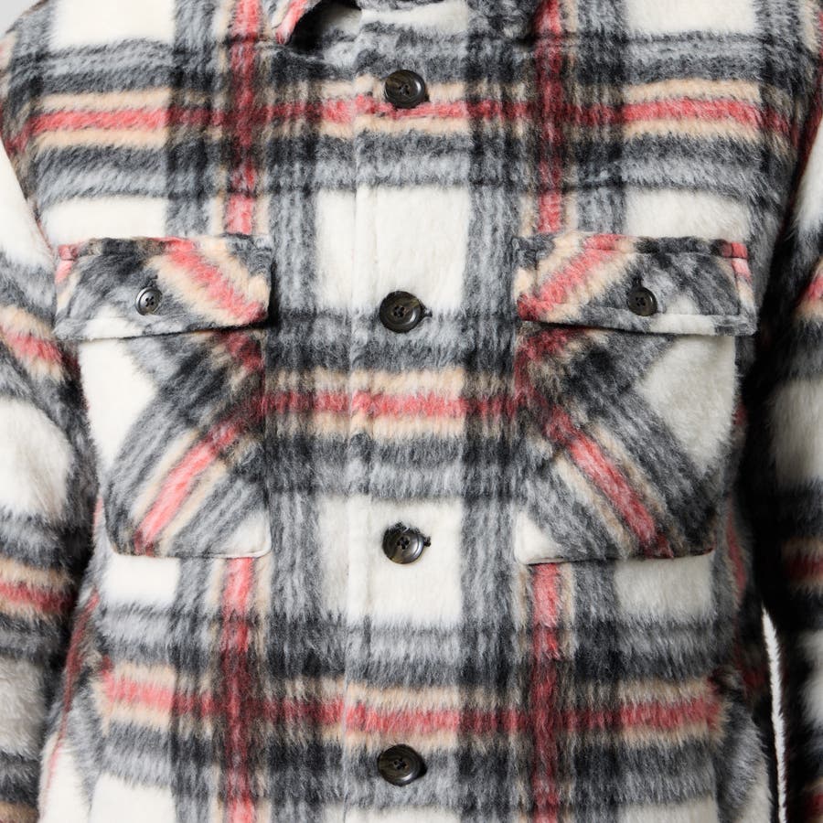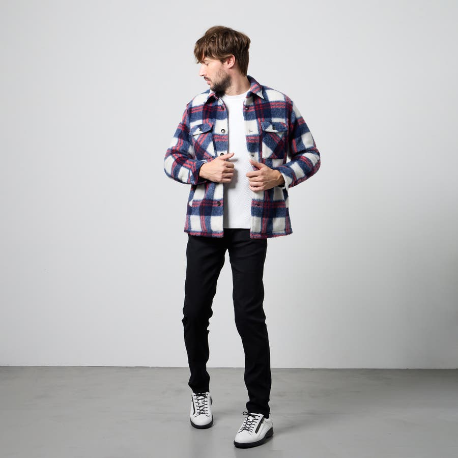ポリエステルのジャージ素材にシャギー起毛をかけた先染めのシャギーチェックニット。