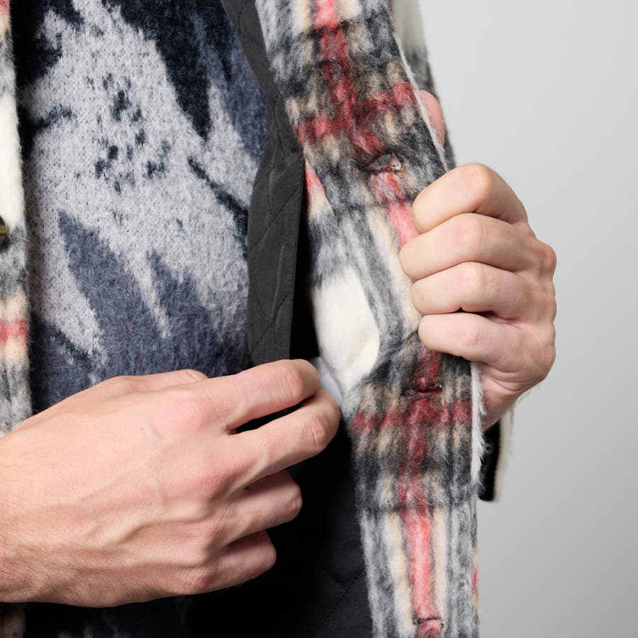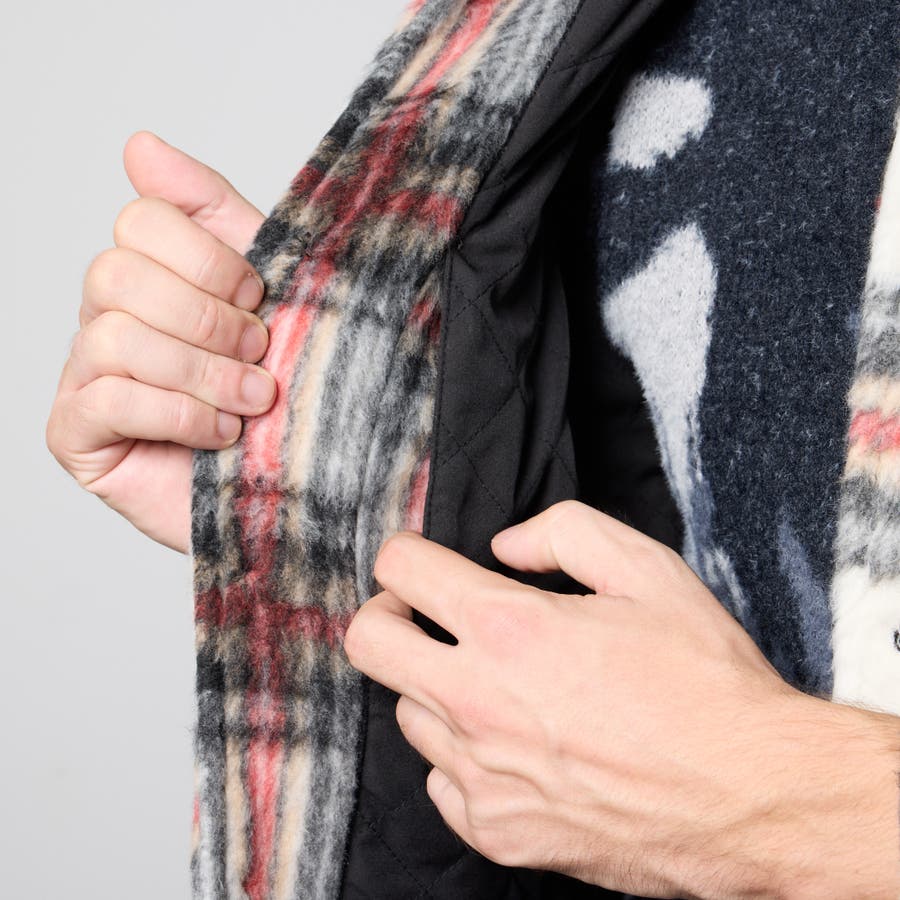 身頃裏には中綿をキルティングした裏地を使用して保温性を高め、袖裏はキルティングなしのストレッチ裏地を使用することで、すっきりとしたシルエットを作りながら動きやすい作りになっております。