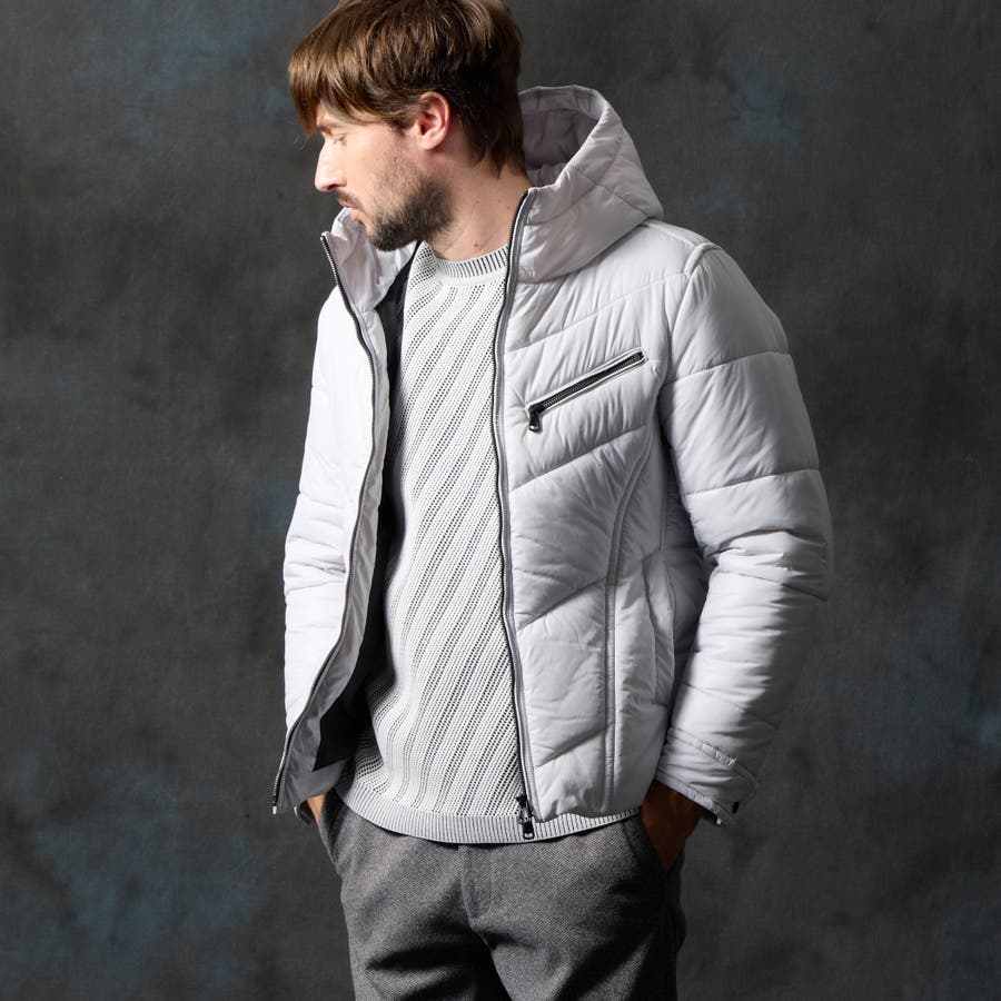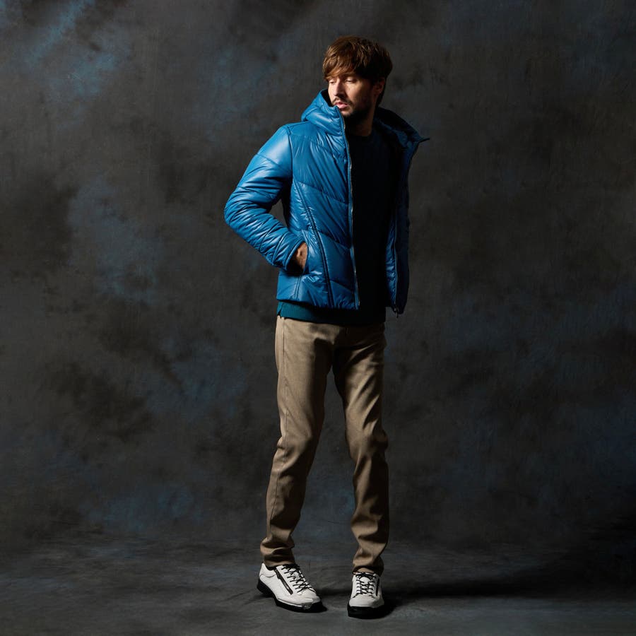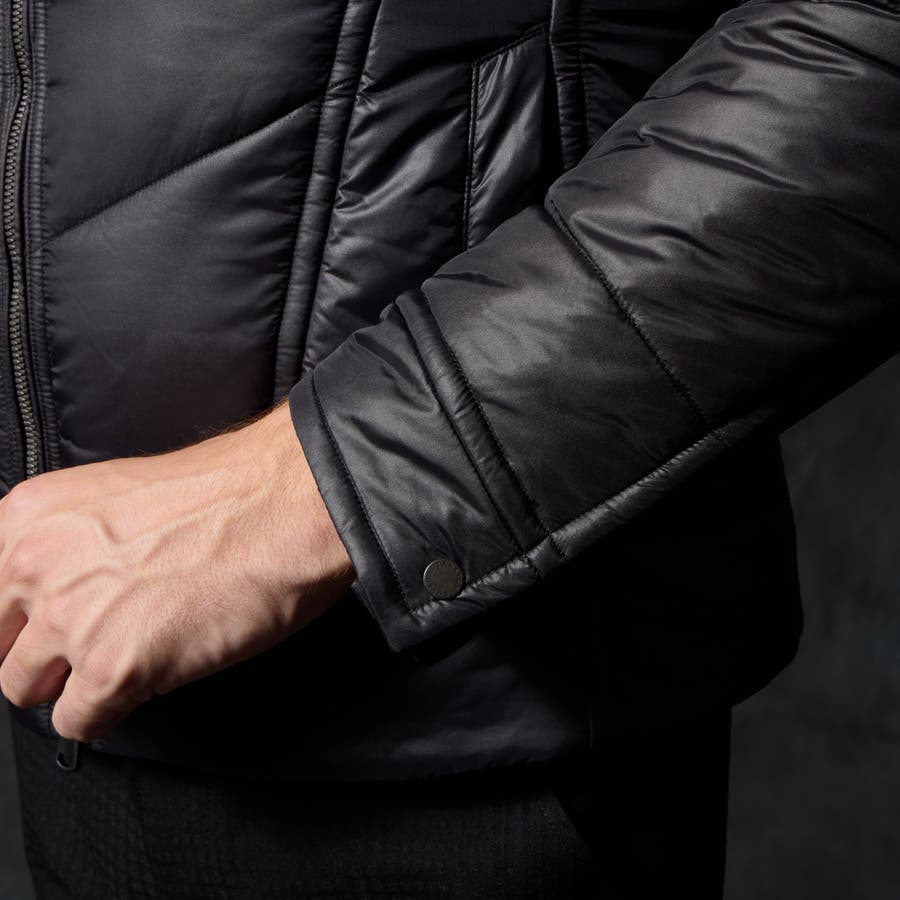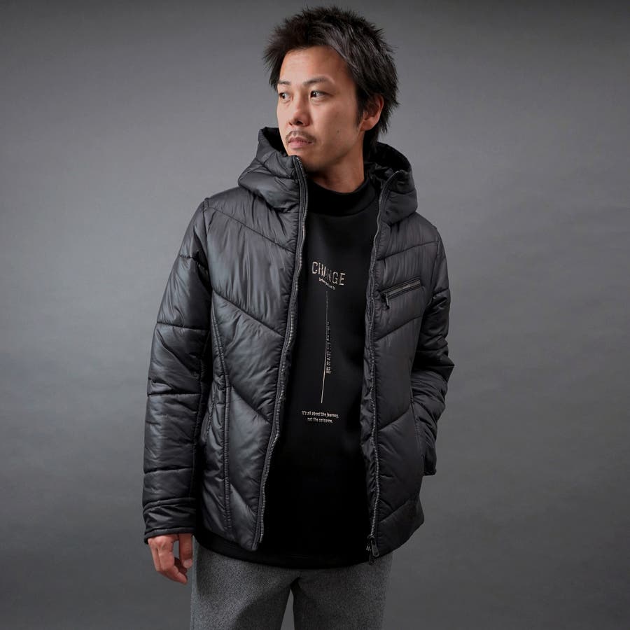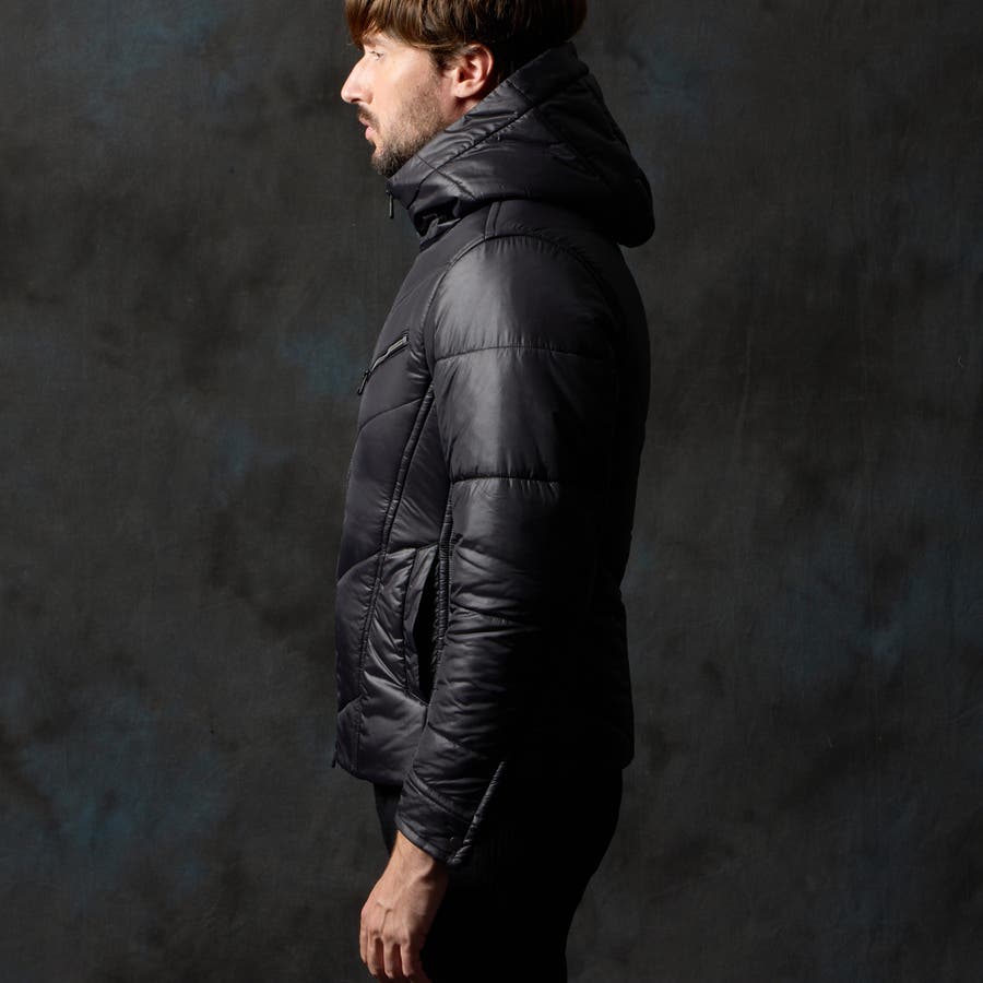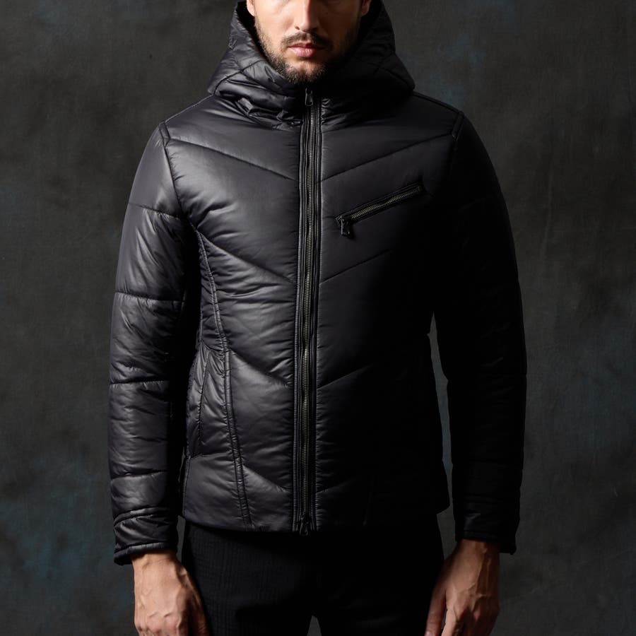 シャープなシルエットに仕立てたボリュームネックフードの中綿ブルゾン。