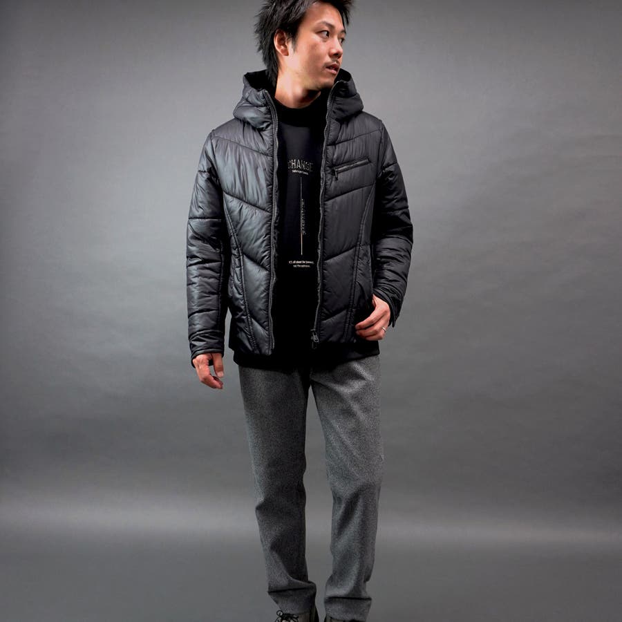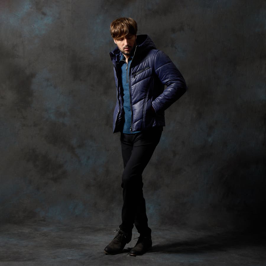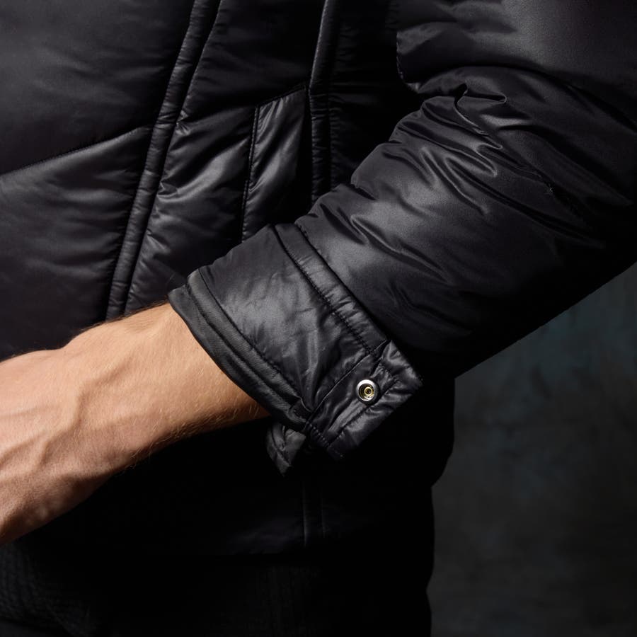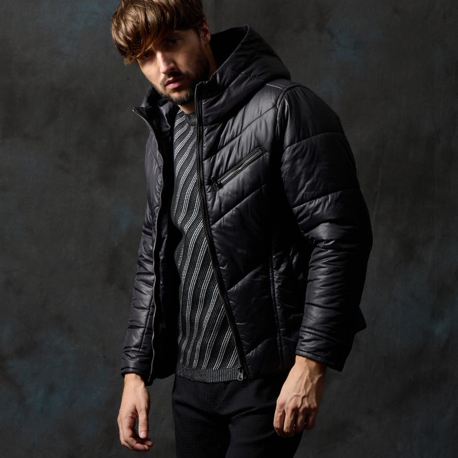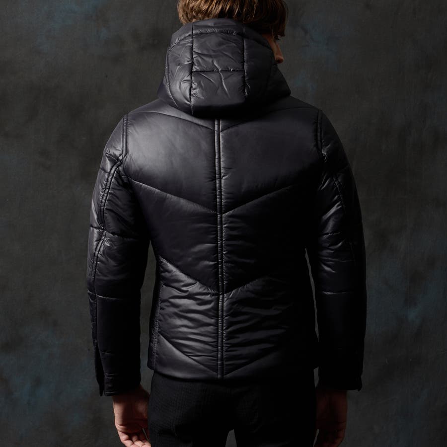 シャープなシルエットに仕立てたボリュームネックフードの中綿ブルゾン。