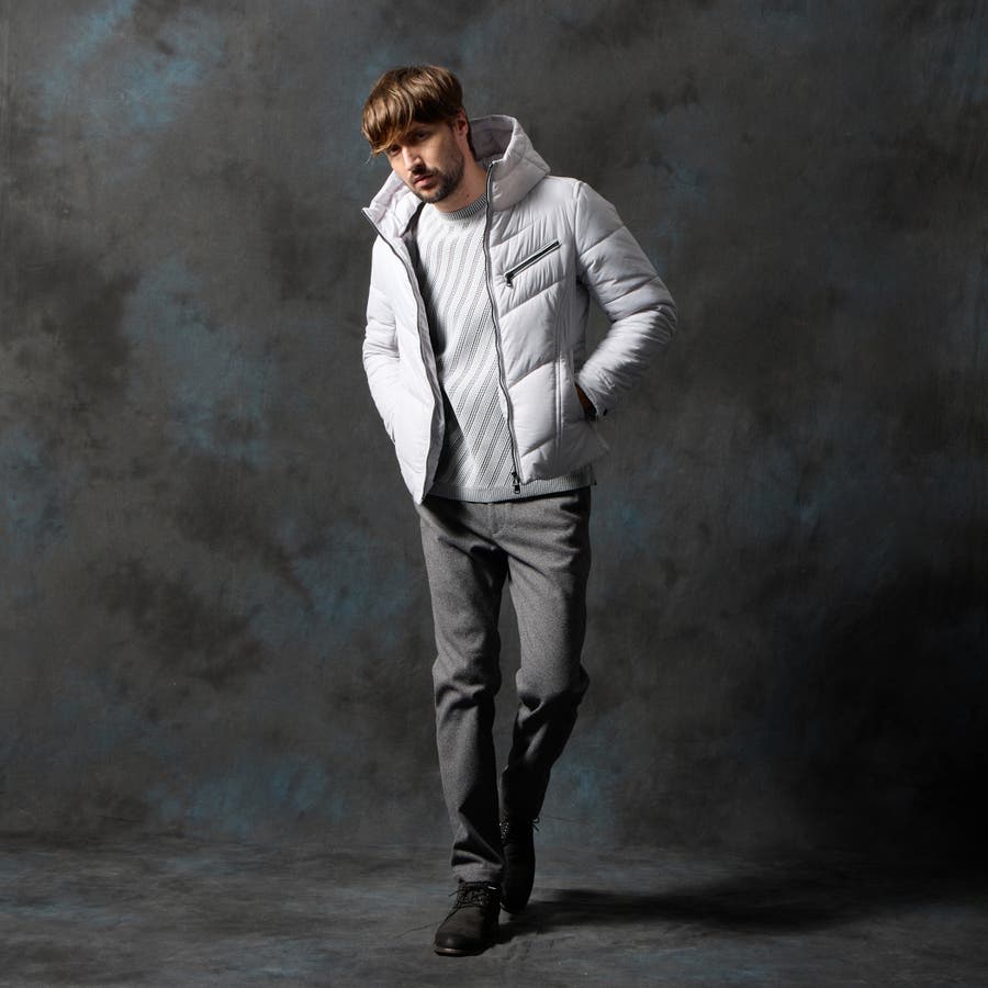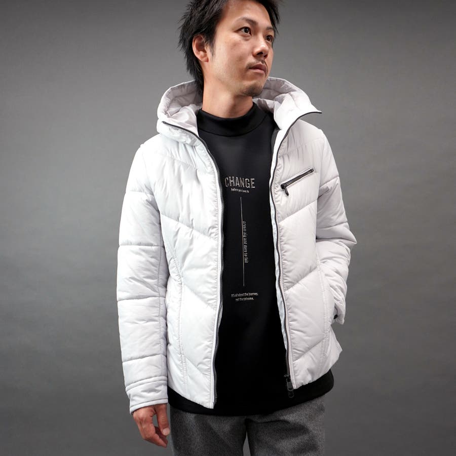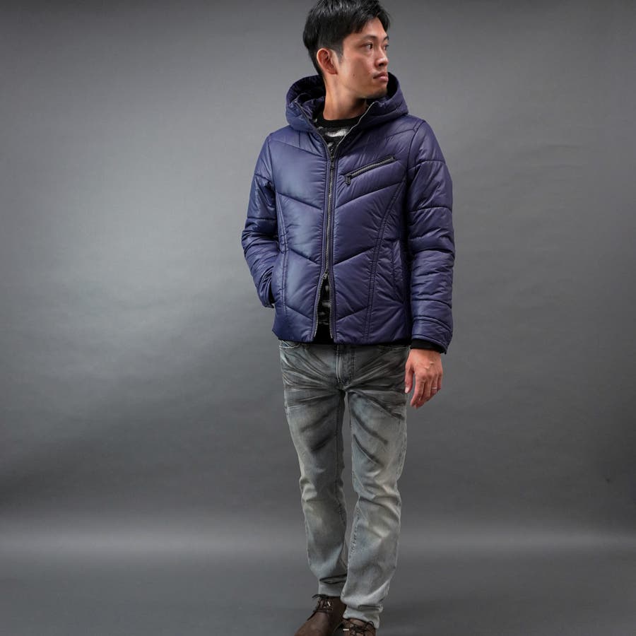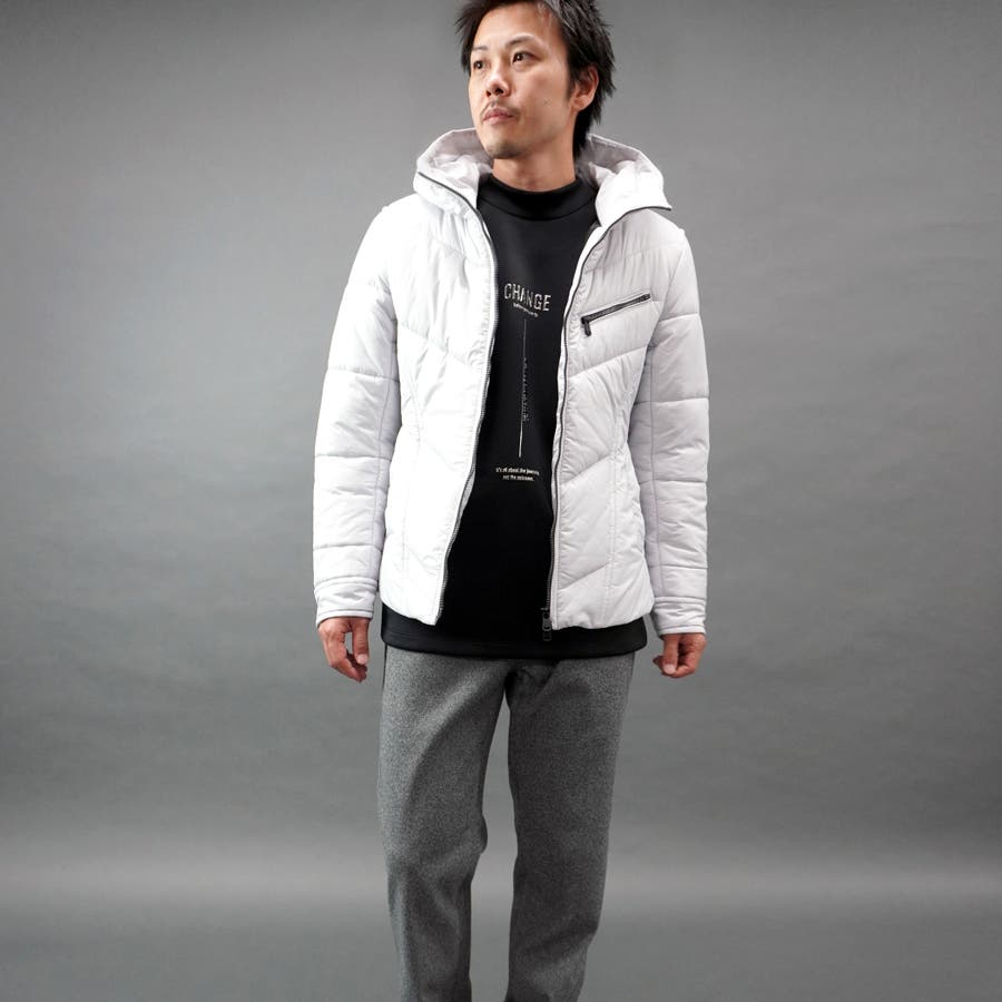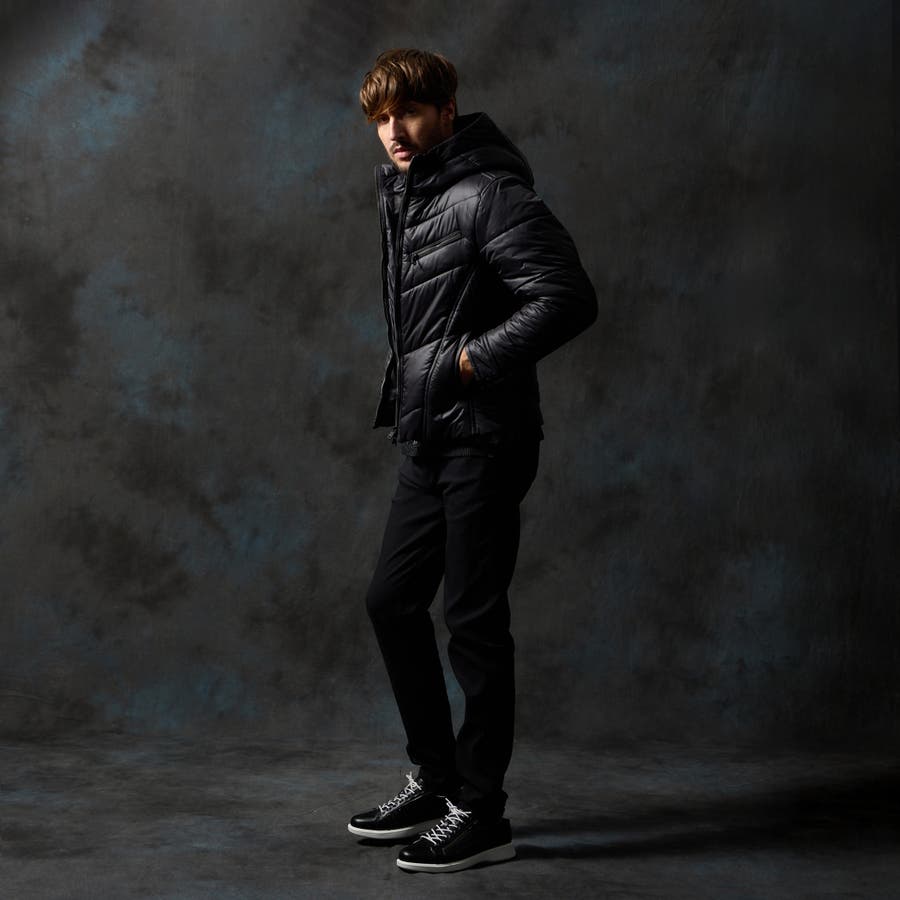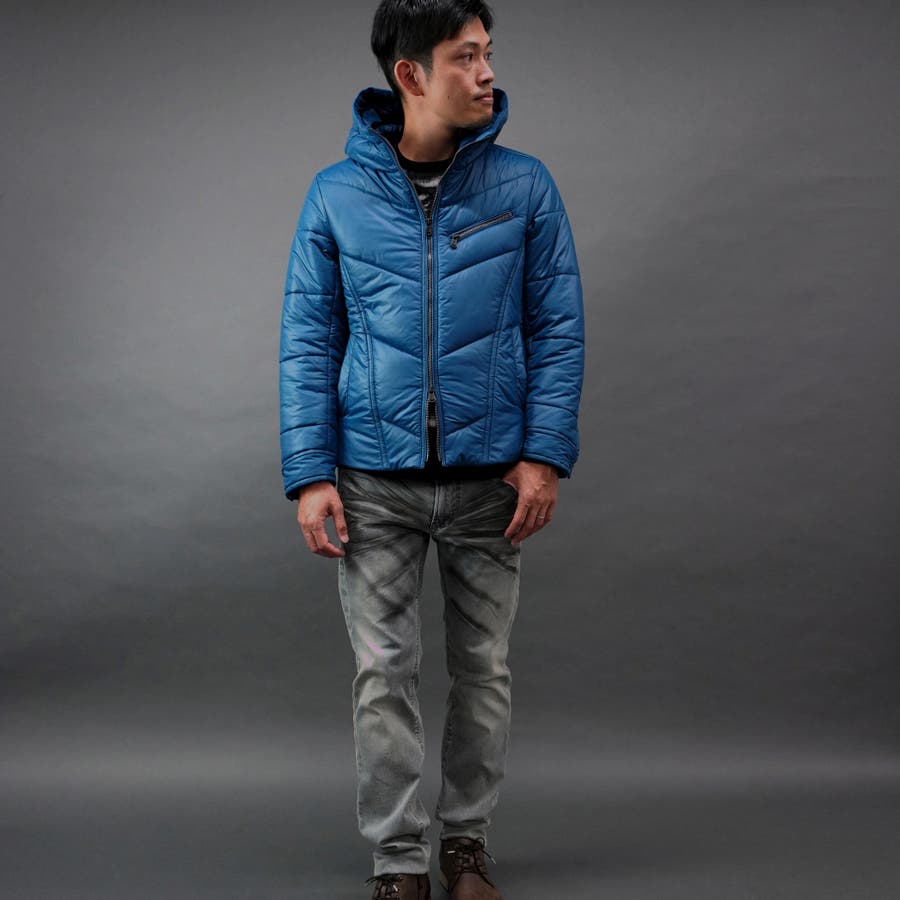 シャープなシルエットに仕立てたボリュームネックフードの中綿ブルゾン。