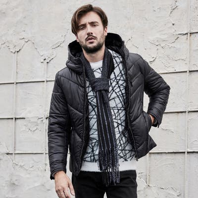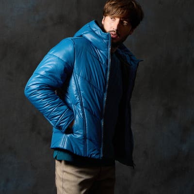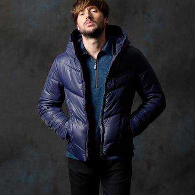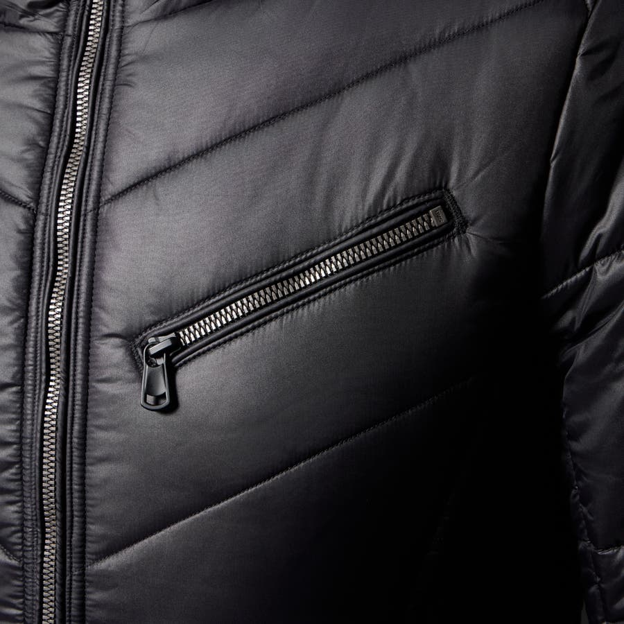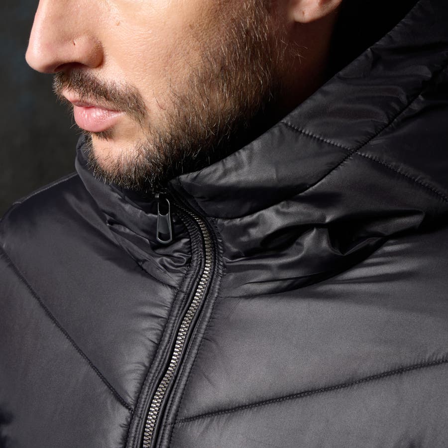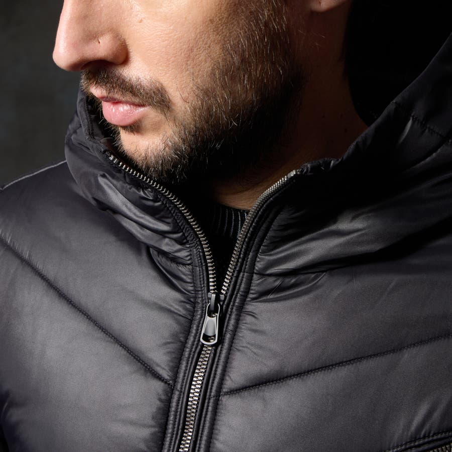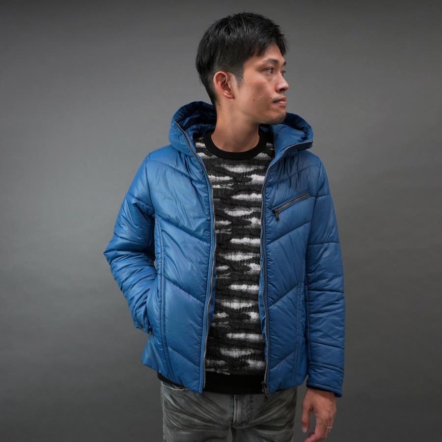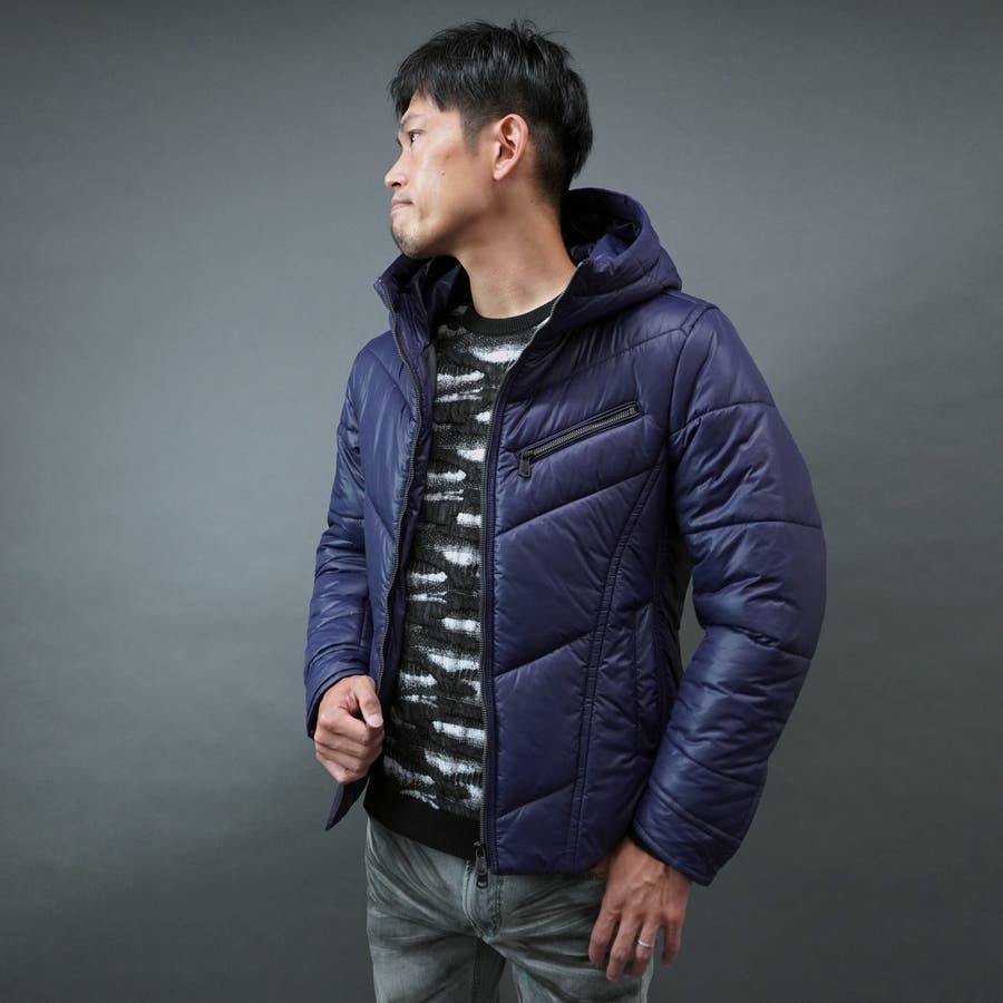 シャープなシルエットに仕立てたボリュームネックフードの中綿ブルゾン。
