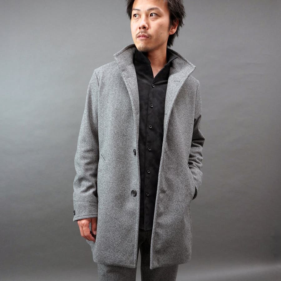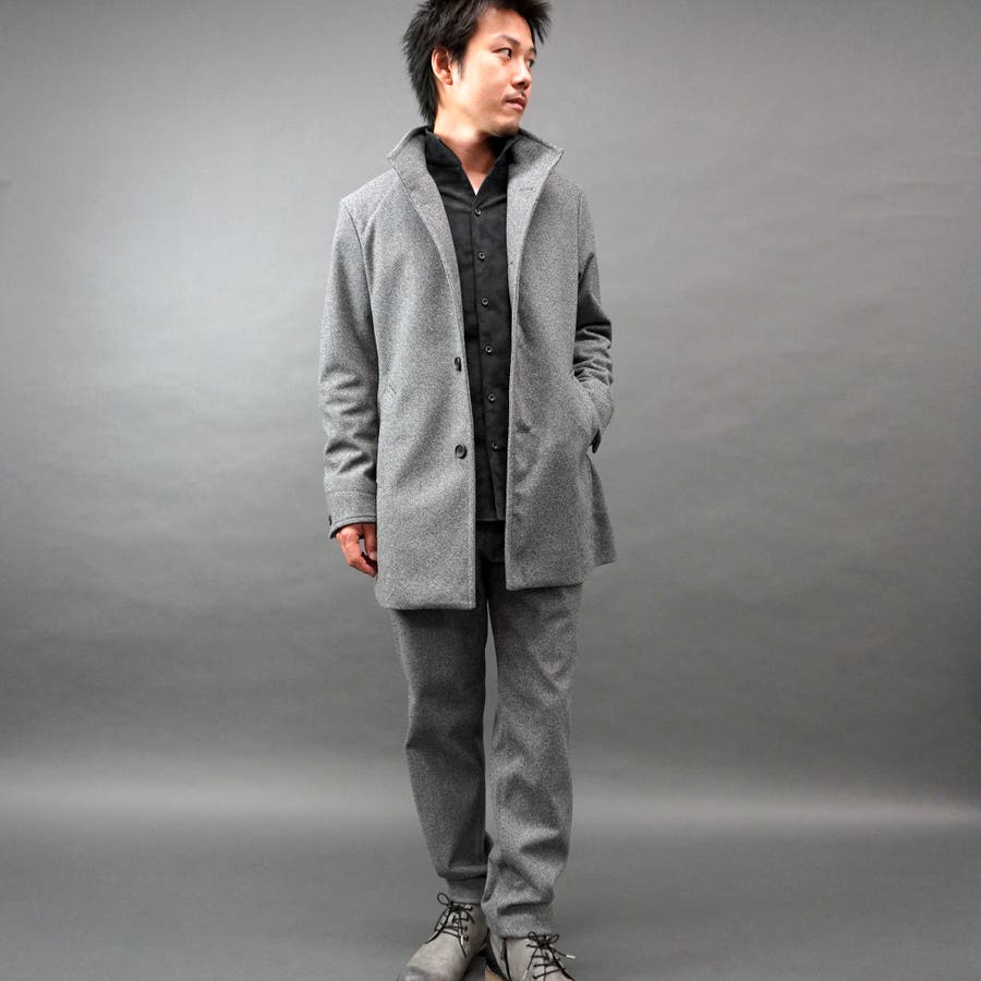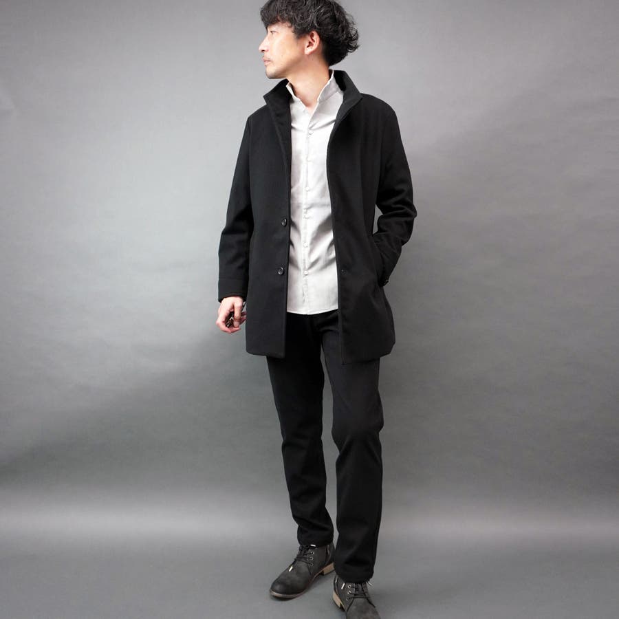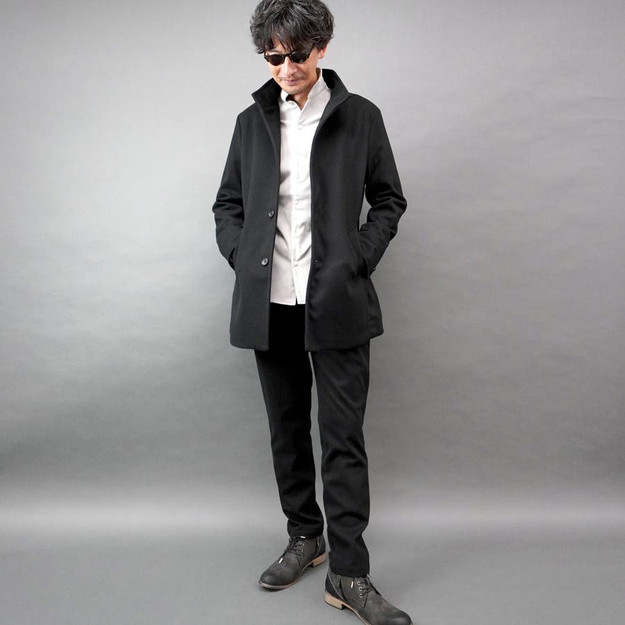 シンプルなデザインのミドル丈スタンドコート(48サイズで着丈80cm)。