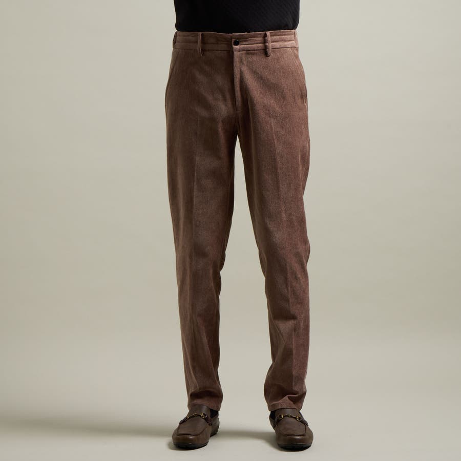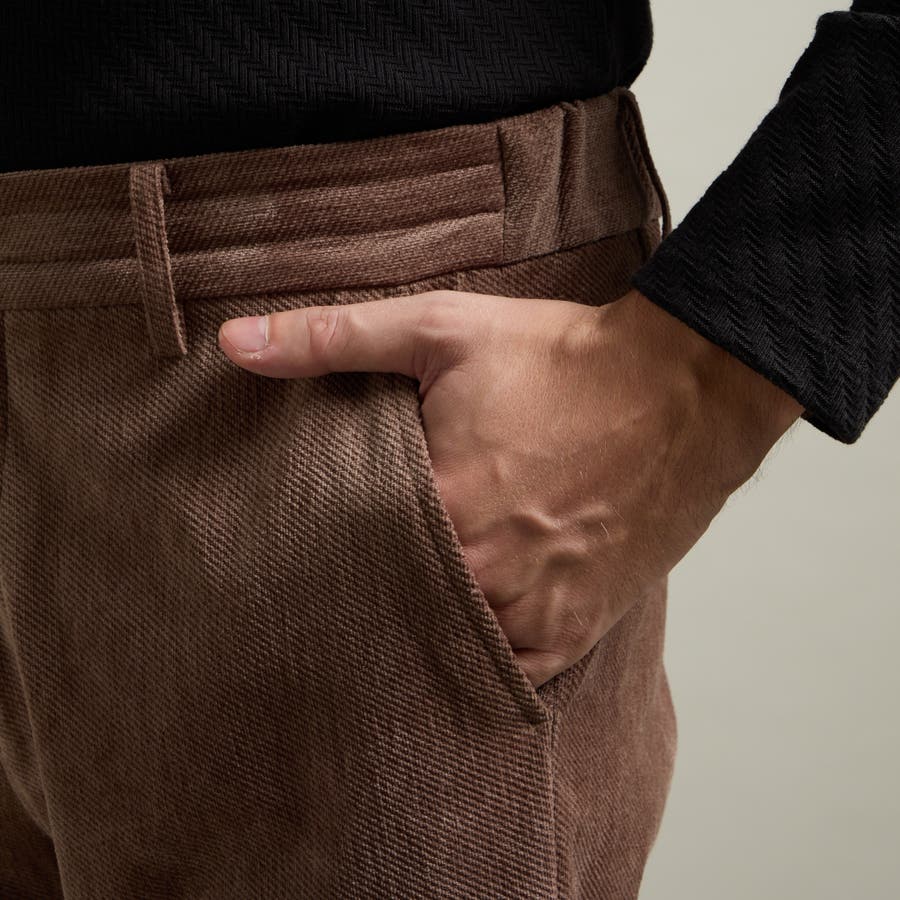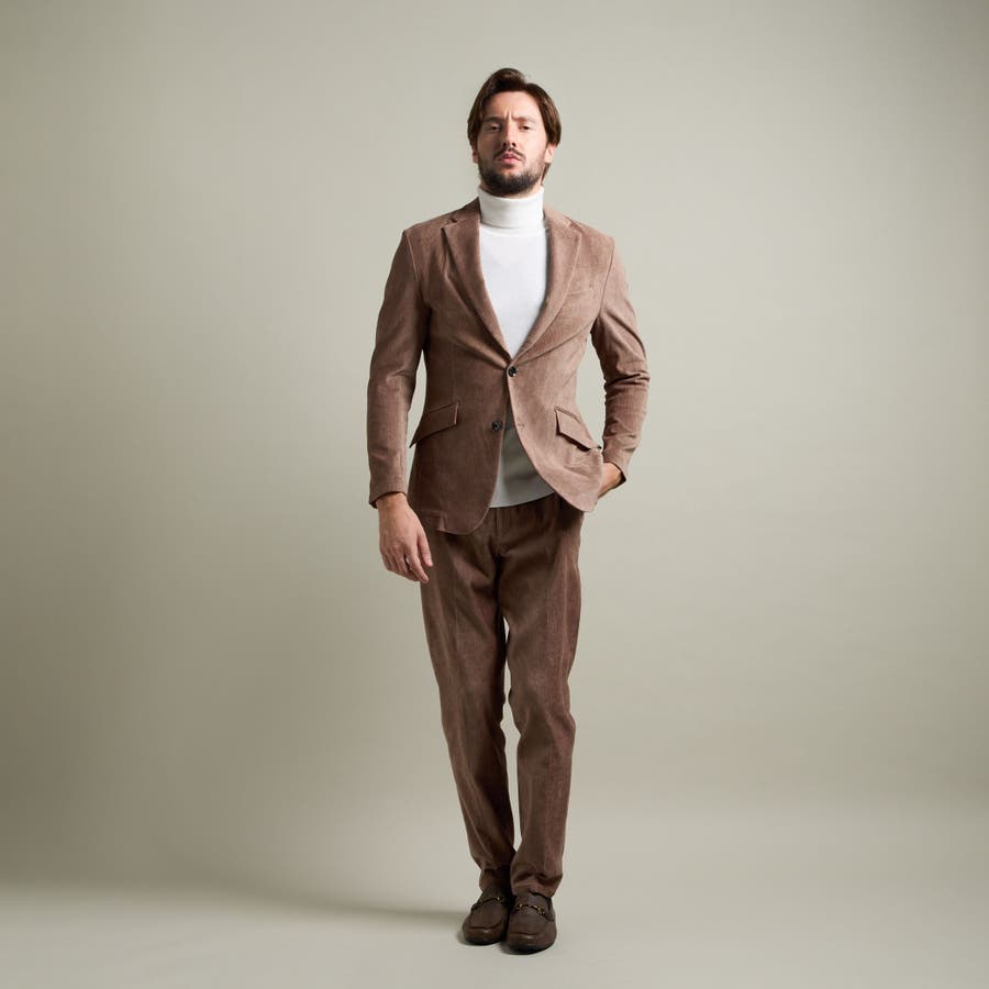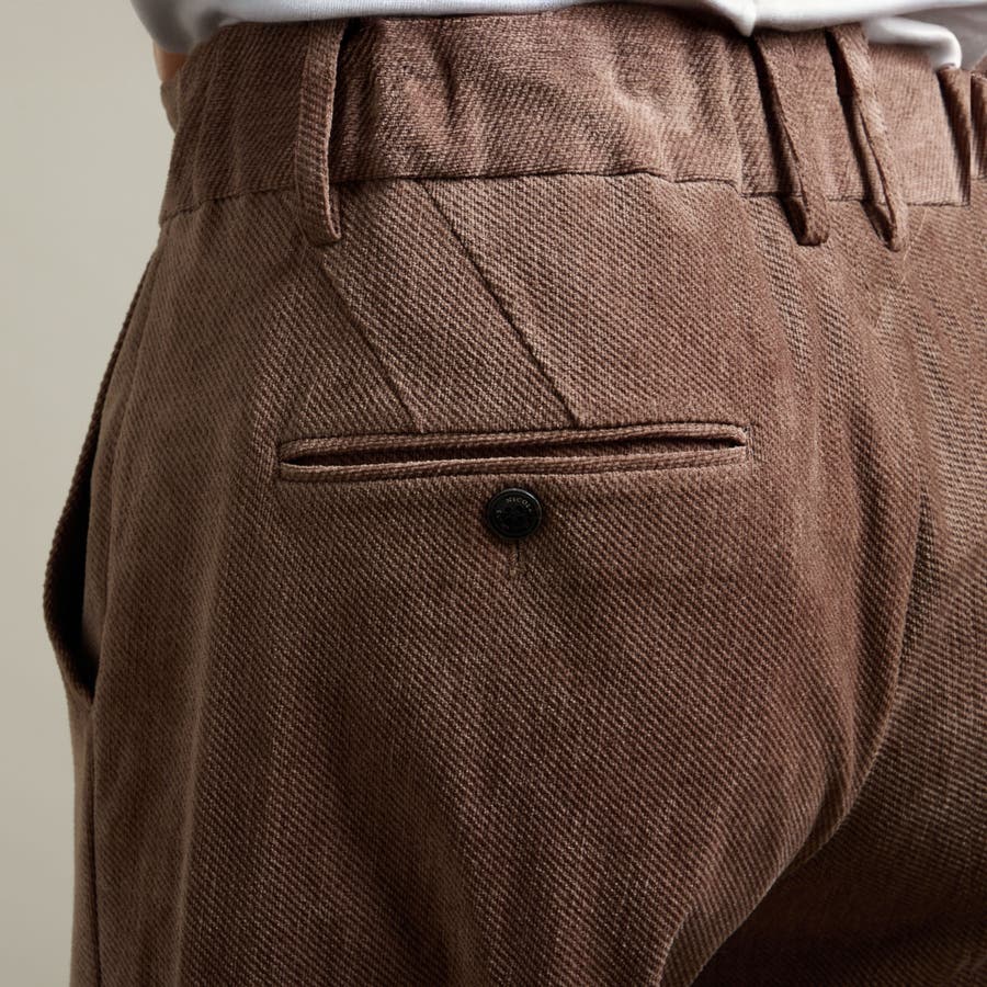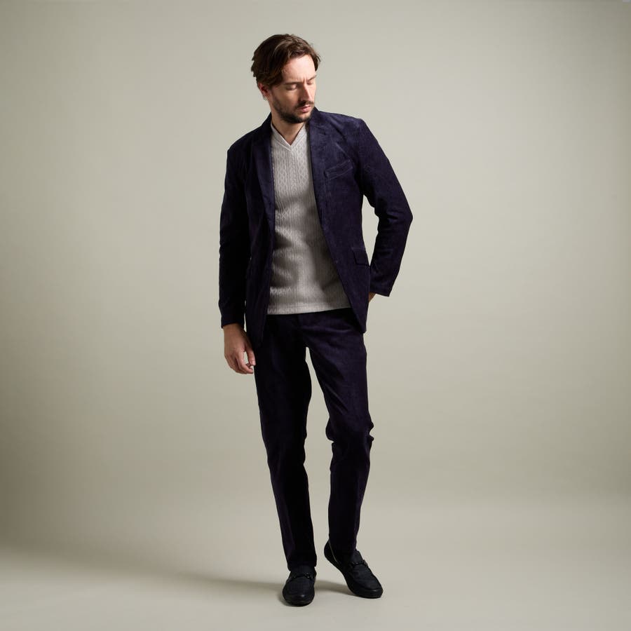 縦畝(ウネ)のコーデュロイとは違う、斜めの組織感が特長のカルゼ柄が上品さをかもし出します。