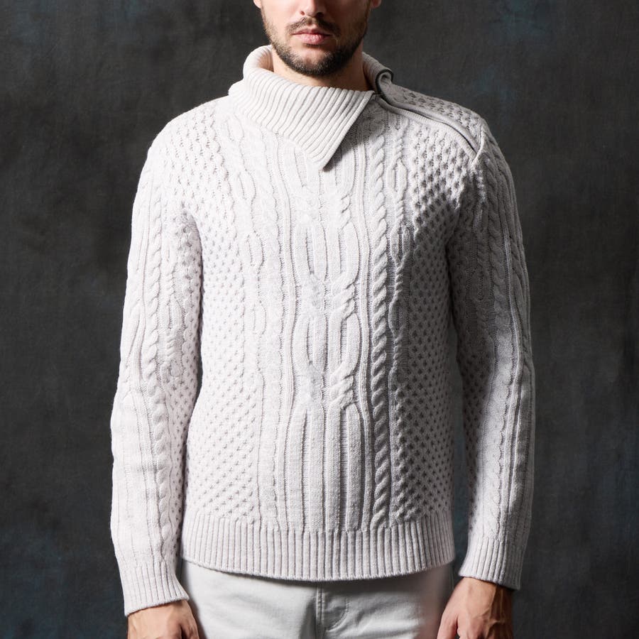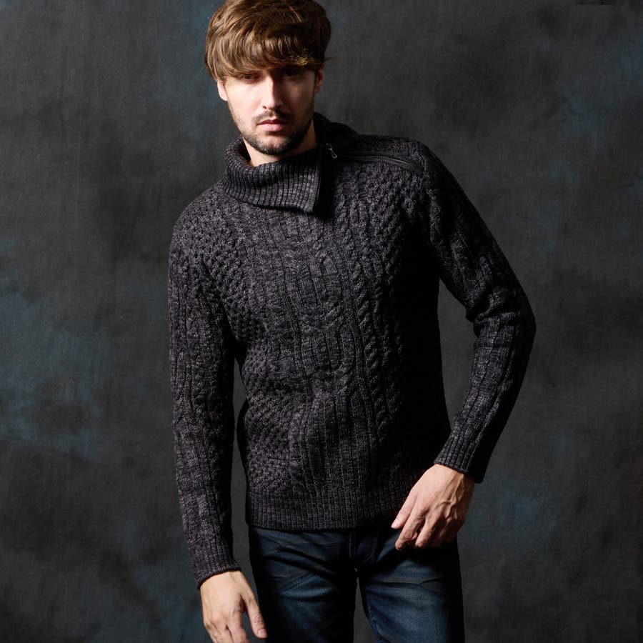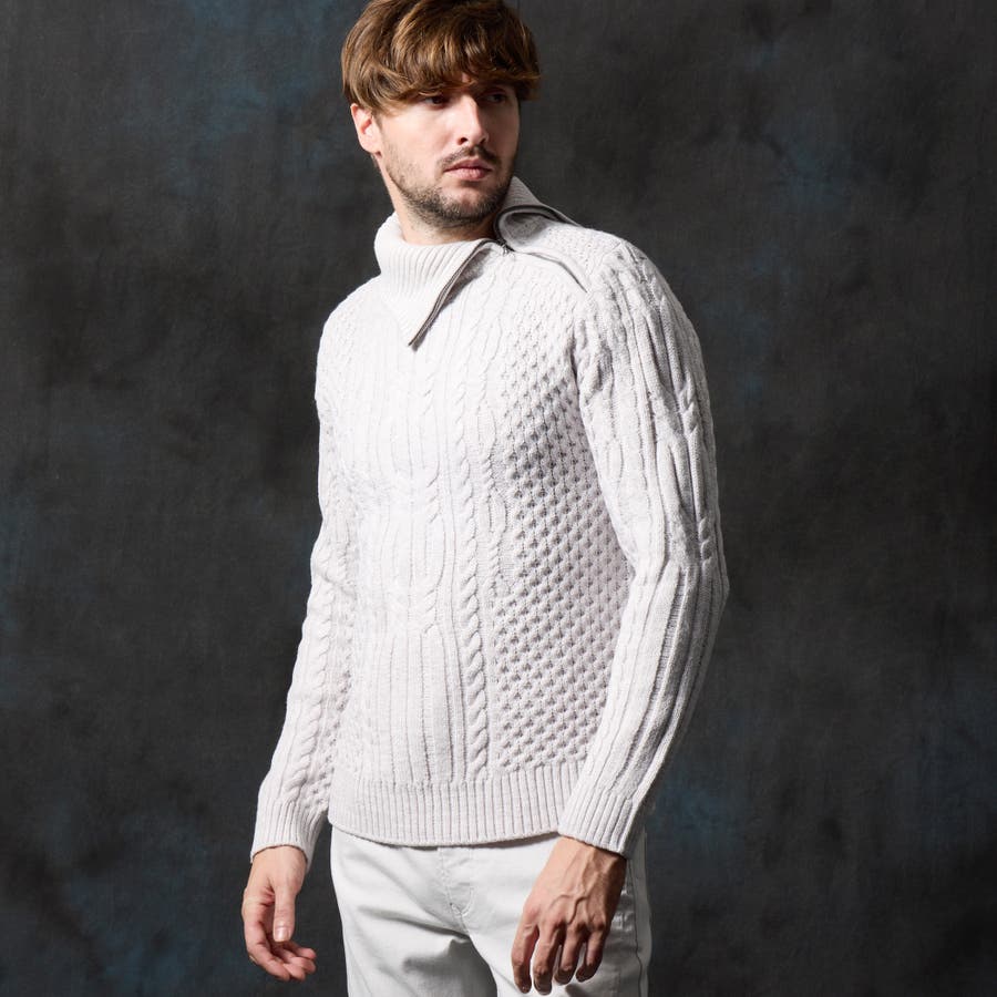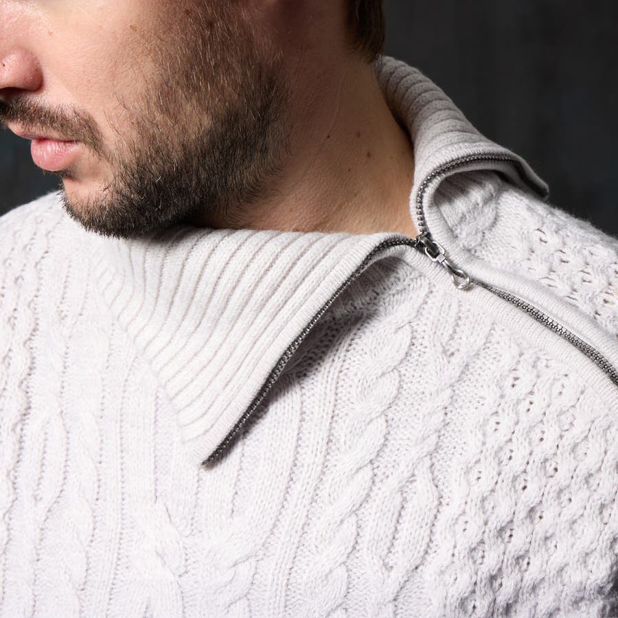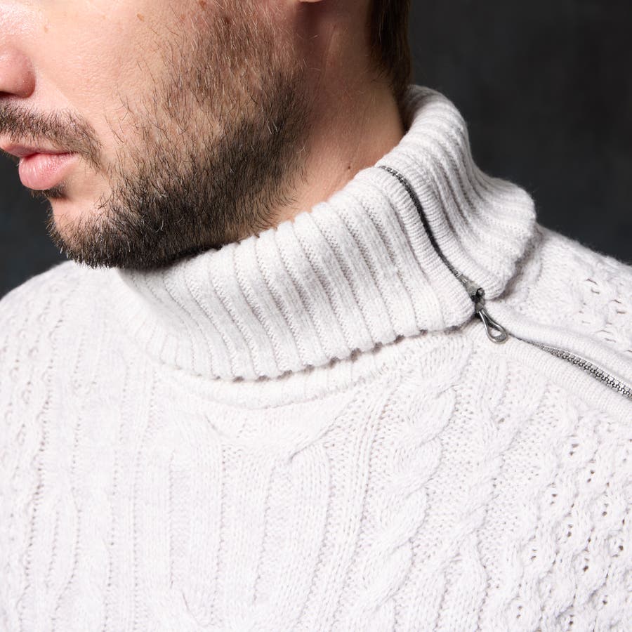 ケーブル編み衿ファスナータートルネックニット