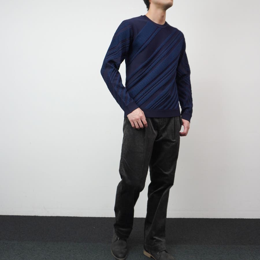 ボーダー編地をバイヤス方向に裁断をすることでバイヤス柄を表現した贅沢なニットになります。