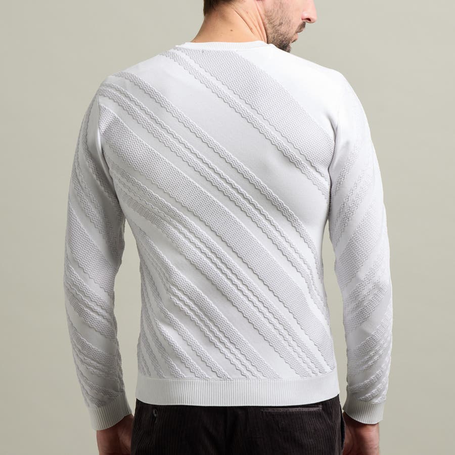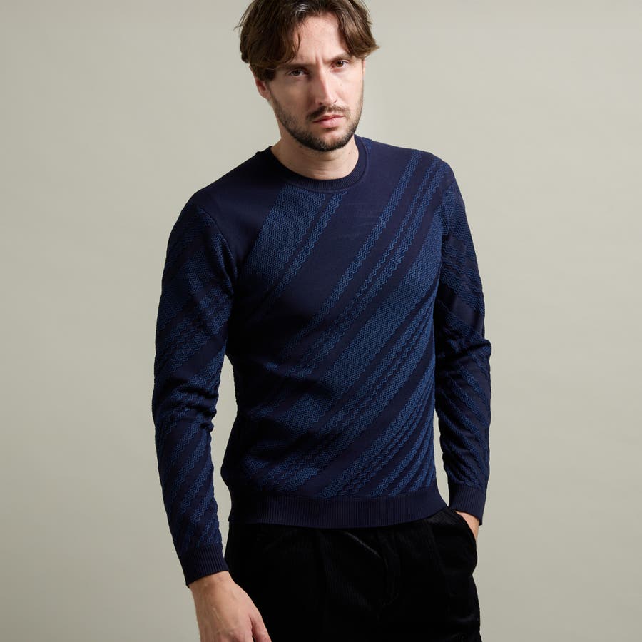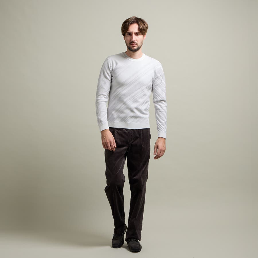 インパクトのあるバイヤス柄が目を惹く、リンクスジャカードクルーネックニットになります。