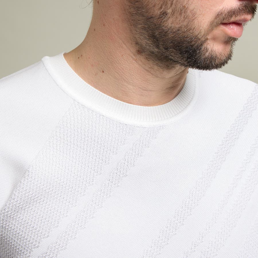 糸と編地の縮率差から凹凸ができるヘリンボーン編地とフラットな天竺編地とのコントラストが際立ちます。