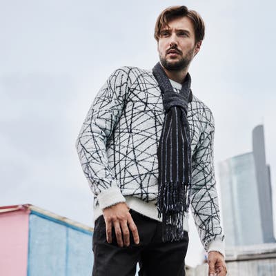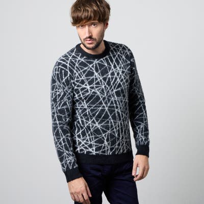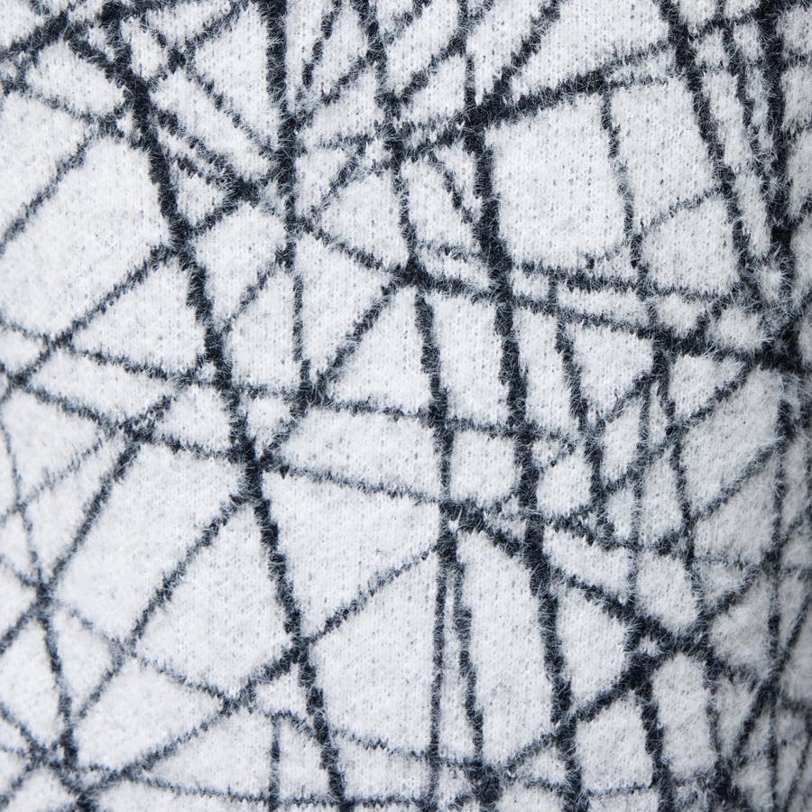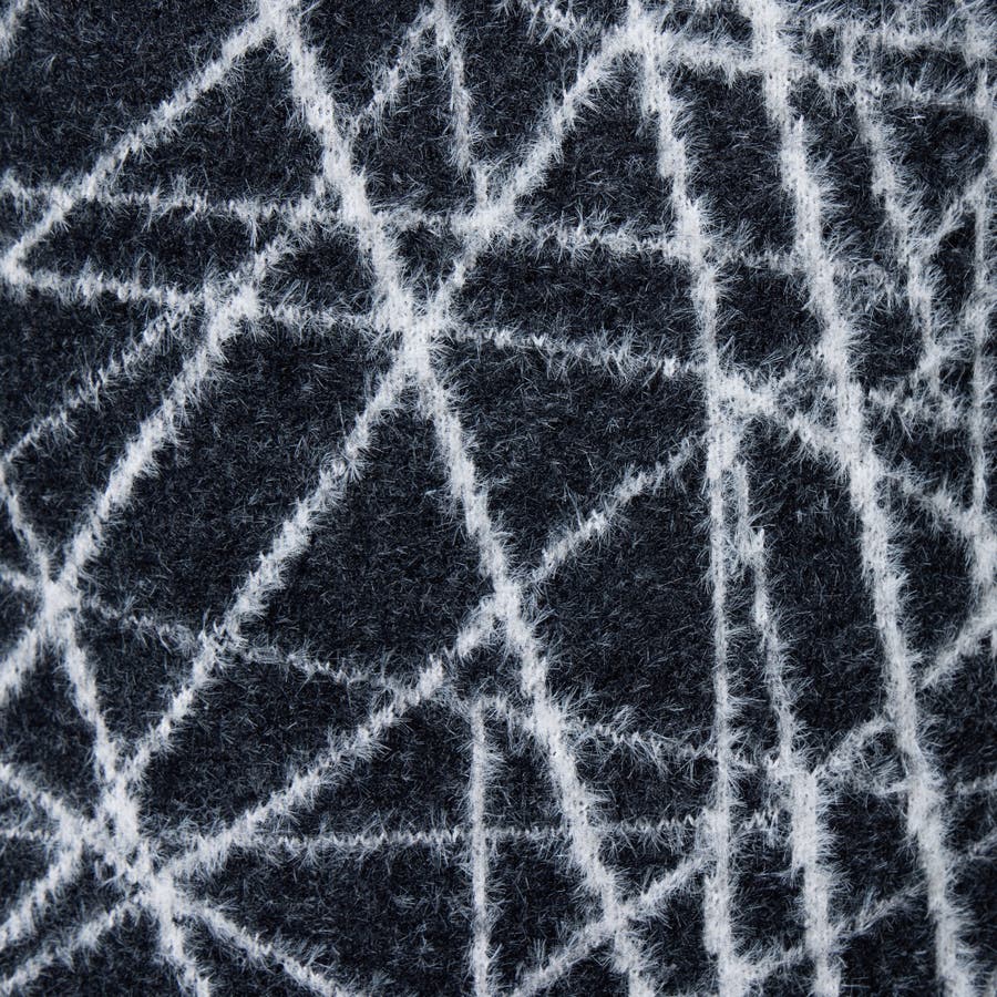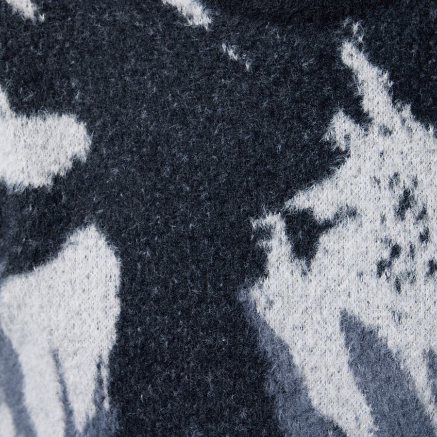 しなやかで柔らかい肌触りのポリエステルナイロンシャギー糸をジャカード゛編みで大胆な柄を表現しました。