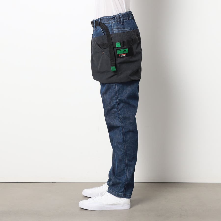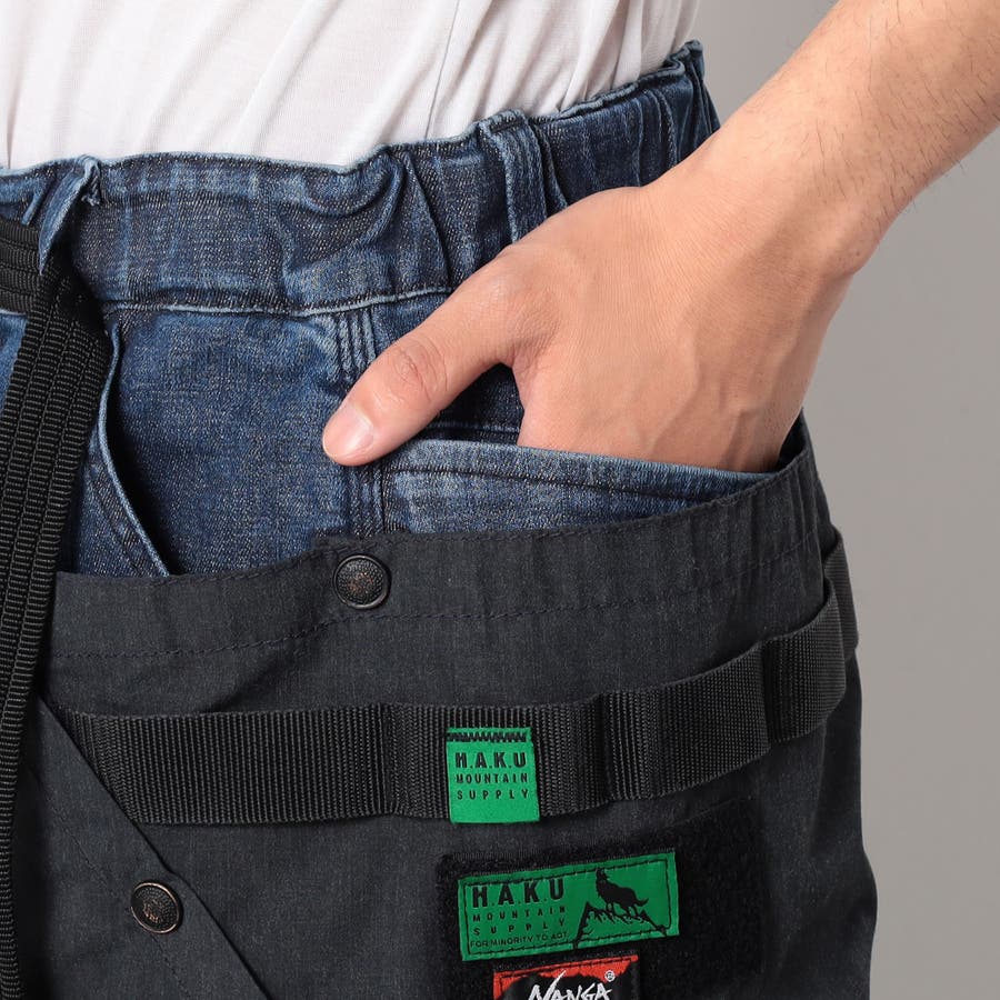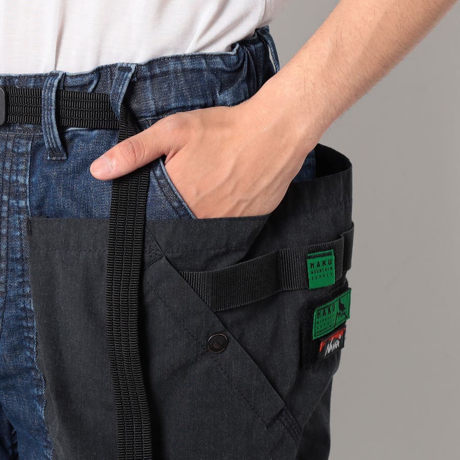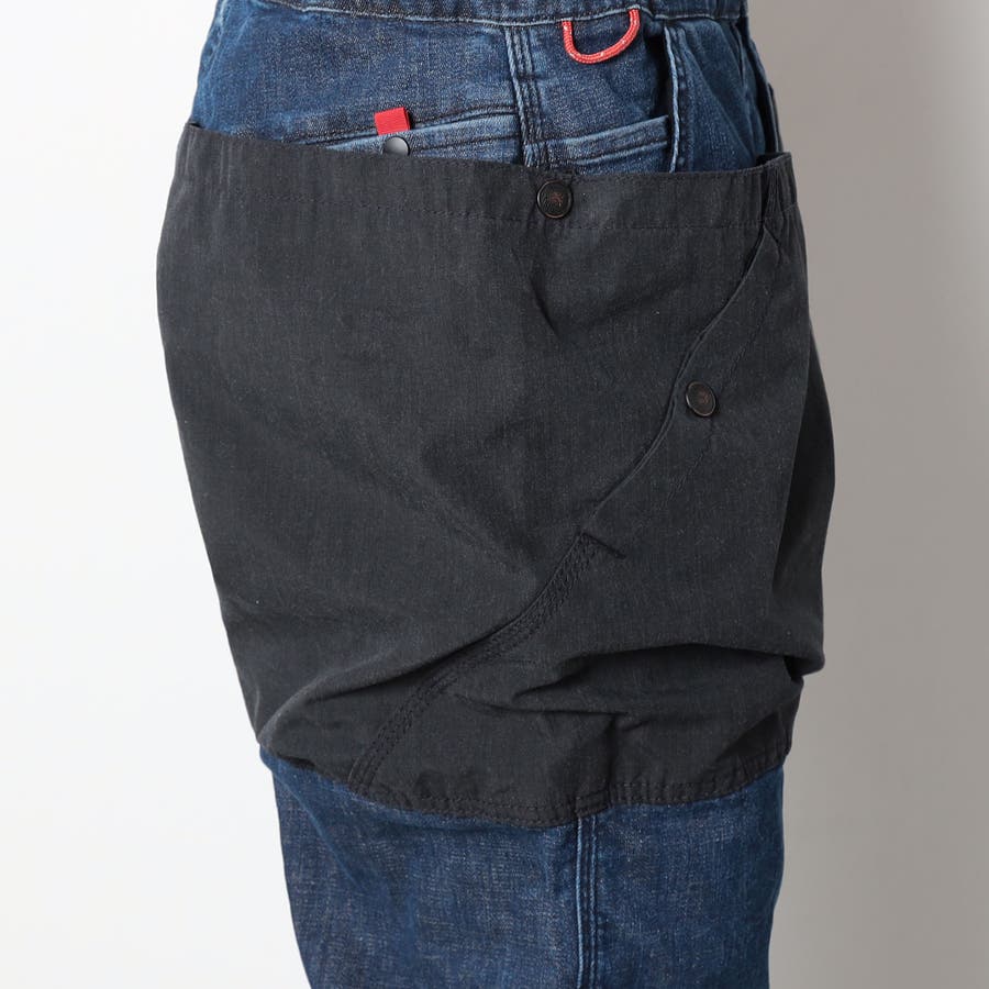 大きなIPADの様なデバイスや、農作業中の収穫した野菜や道具だってガシガシ入れられる。もちろん釣り上げた獲物だって入れられる。濡れたり泥で汚れたりしても気にしない。 左側にはデイジー チェーン なんでも引っ掛けてガシガシ使える。まるでウェアラブルバッグ=「カバンを穿いているかの様な収納力」そんなオーバースペック を楽しむディテールです。