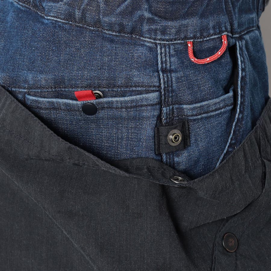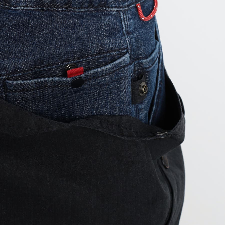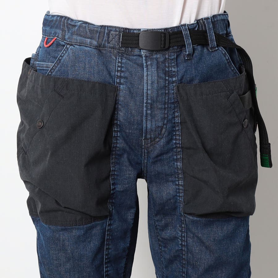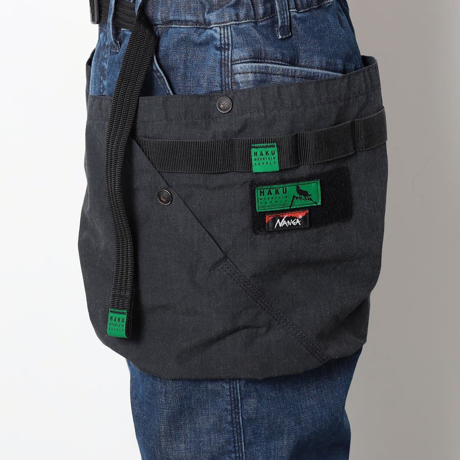 大きなIPADの様なデバイスや、農作業中の収穫した野菜や道具だってガシガシ入れられる。もちろん釣り上げた獲物だって入れられる。濡れたり泥で汚れたりしても気にしない。 左側にはデイジー チェーン なんでも引っ掛けてガシガシ使える。まるでウェアラブルバッグ=「カバンを穿いているかの様な収納力」そんなオーバースペック を楽しむディテールです。