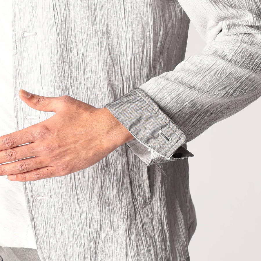 定番スタンドデザインのカヴァーオールジャケット。衿端にワイヤーを入れています。ねかしてラペルにしても収まる設定にしていますので、Vゾーンを綺麗に作れます。一重仕様の軽い仕上がりでシャツ感覚で着用出来ます。前身裏のみ付け、内ポケットを作っています。フロントの一番下の釦は止める設定していませんのでご注意ください。