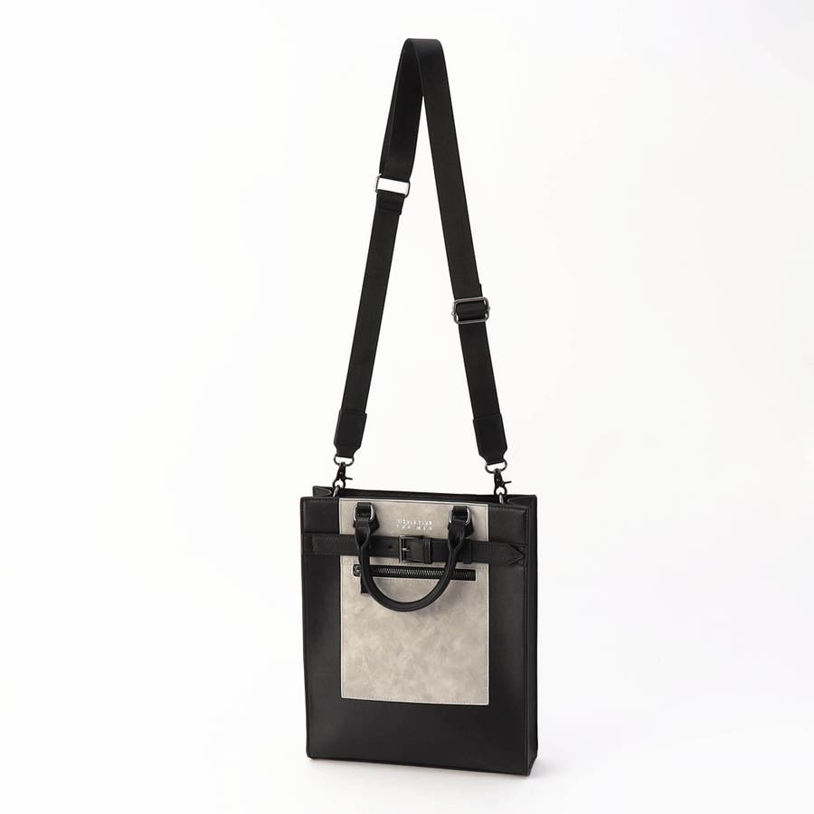 ソリッドな素材感が特徴のスクエア型ショルダーバッグ。手持ち用のハンドルと脱着式のショルダーベルトが付属した2WAY仕様です。フロントのファスナーポケットと異素材合皮切り替えに加え、今季はメタルバックルを使用したベルトデザインをあしらい一層洗練された印象に。内装にはパッチポケットを設けて荷物の仕分けも容易です。モードスタイリングにもピッタリなトレンド感満載のバッグです。