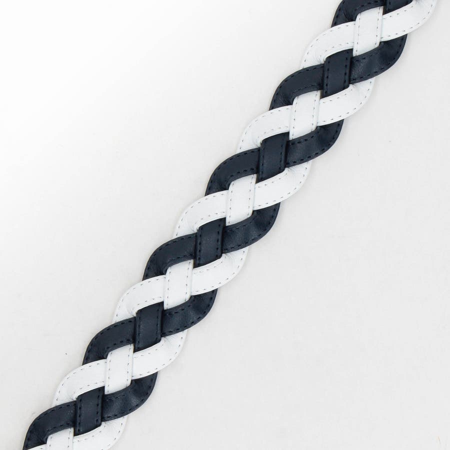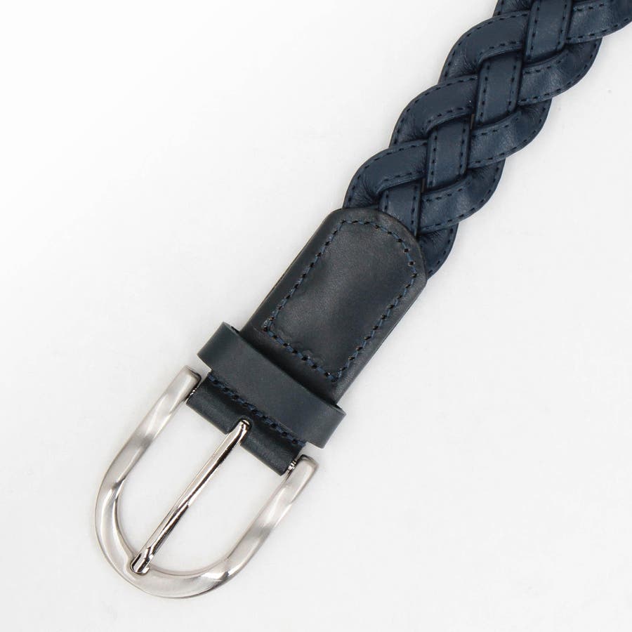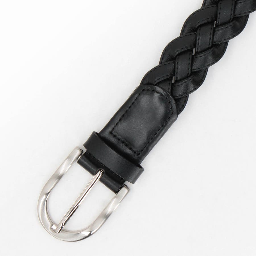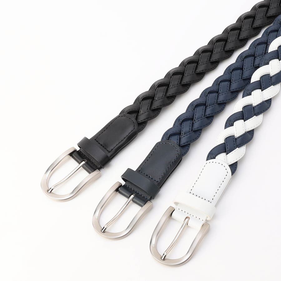 幅広いパンツに合わせやすい設定にしています。サイズ調節不要で、編み込み部分のどこでも留めることができる利便性が特徴です。