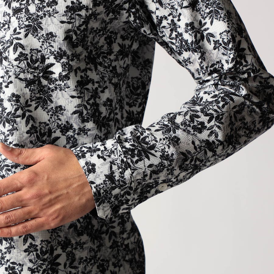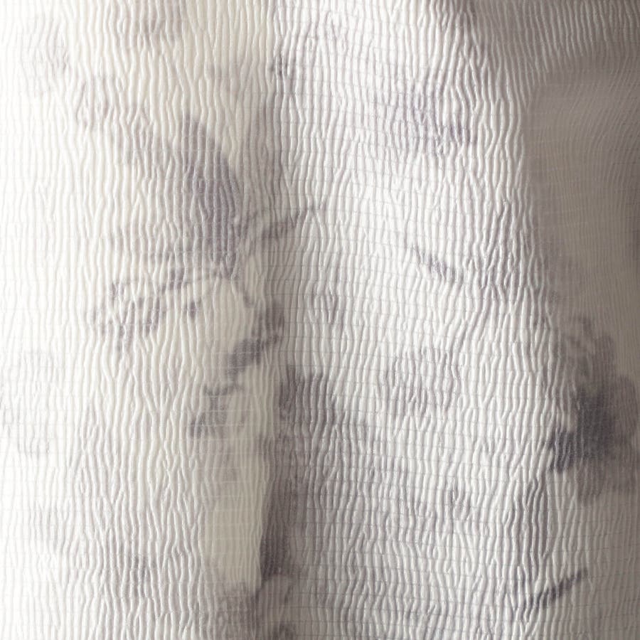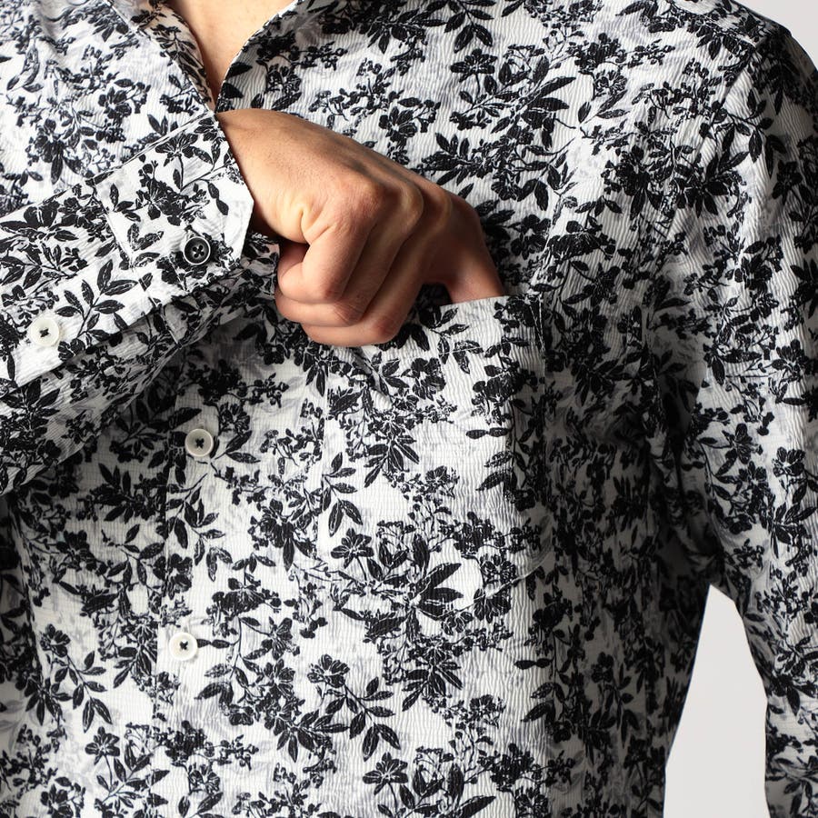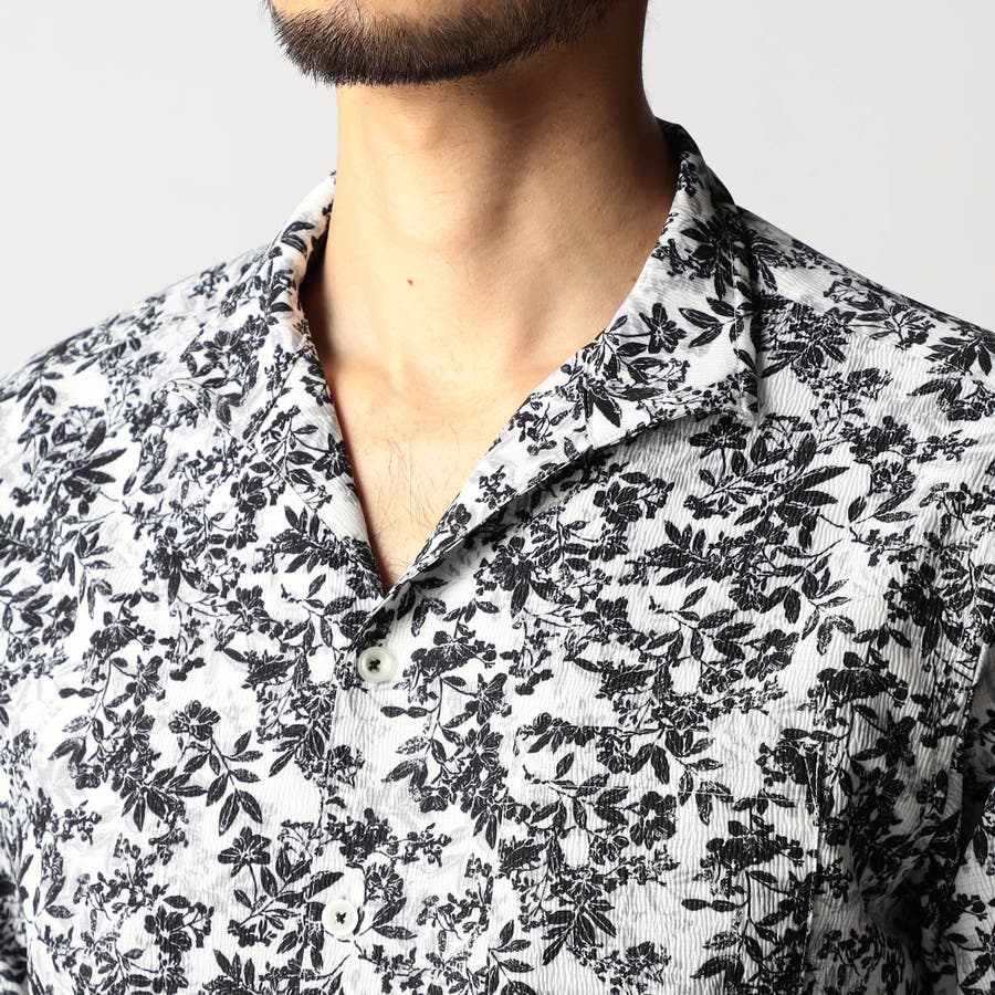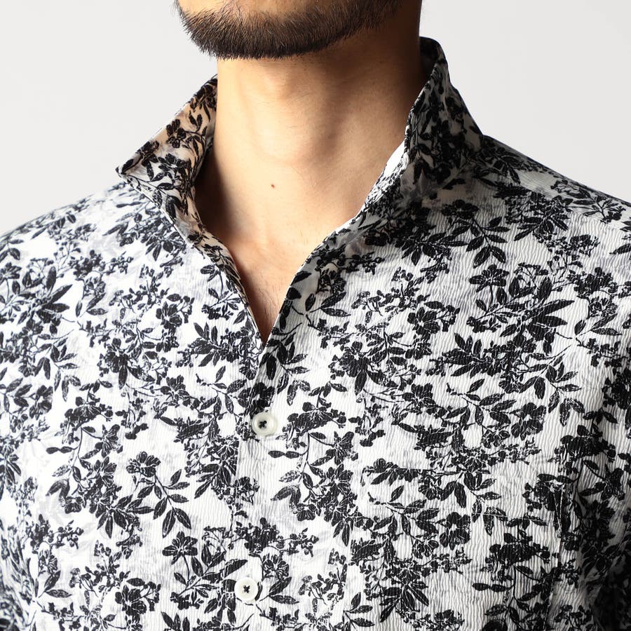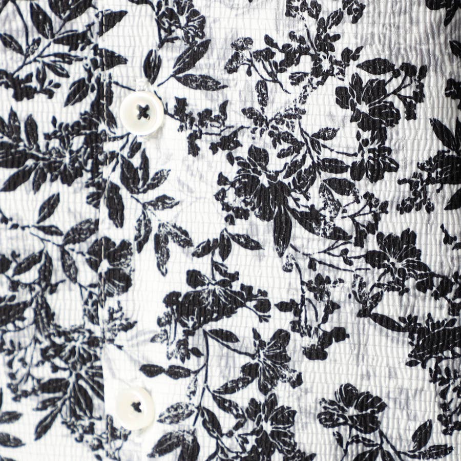 マイクロメッシュのポリエステル素材に細かいリップル(シワ)加工を施した生地がベース。09オフ×グレー/60オフ×ブルーは、掠れさせたボタニカル柄の同色系プリント、91その他2オフ×ブラック/92その他3ブラック×オフは、掠れた小花柄プリント柄の配色展開です。92その他3は、白場を目立たせたいので、柄全体を少し大きくして、見た目にこだわっています。ベース素材のナチュラルなワッシャー感にサラッとした清涼感、程良いマルチストレッチが特徴です。
