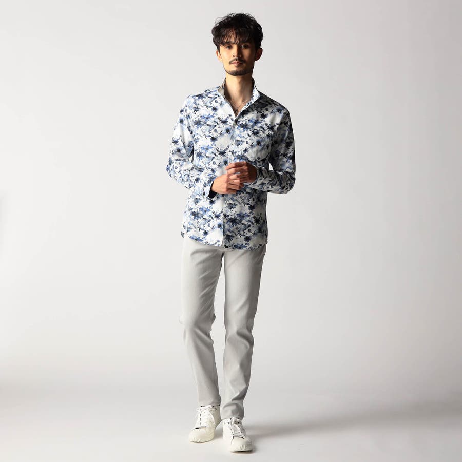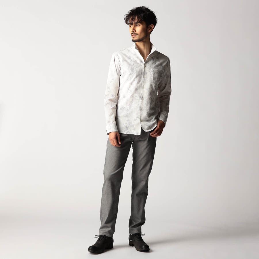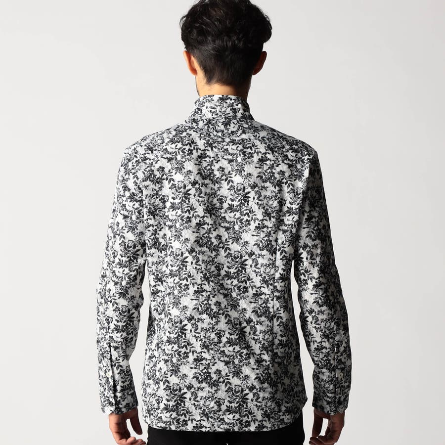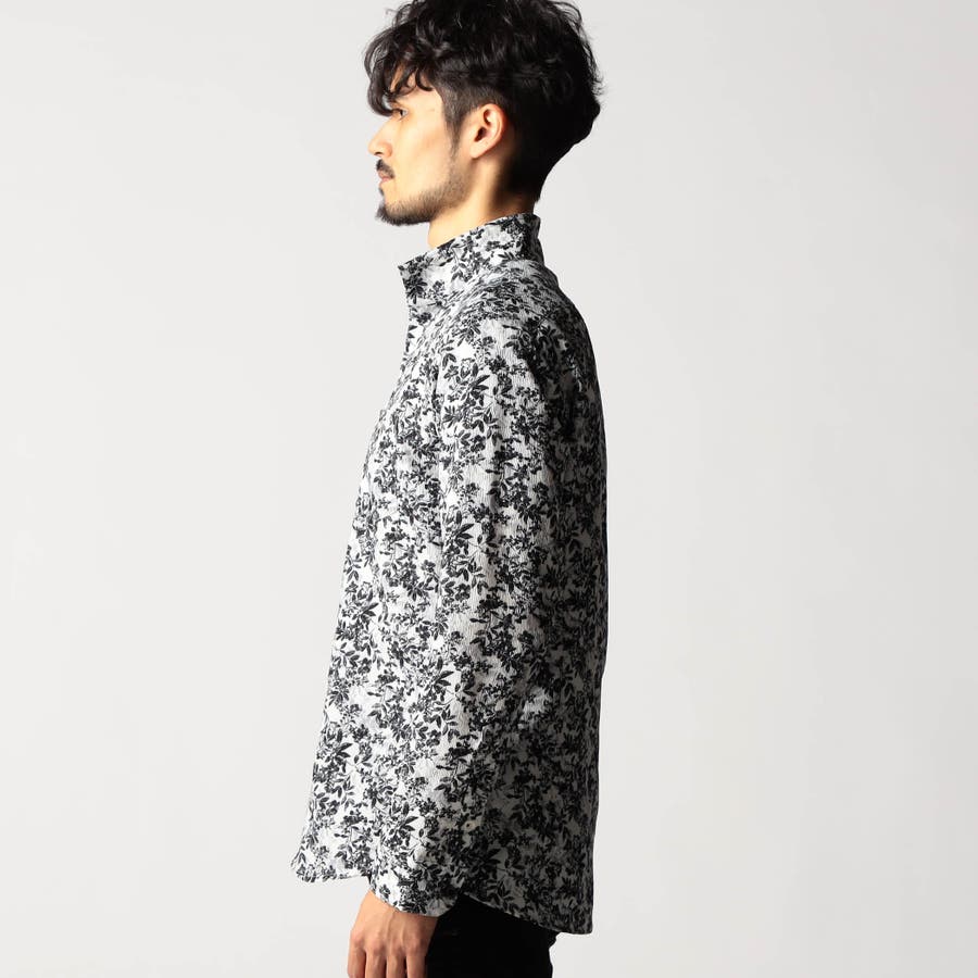 衿端にワイヤ-を仕込んだスタンド・イタリアンカラ-シャツ。ヨーク裏やカフス裏など無地配色のストレッチ裏地を使い、アクセントになる様にしています。生地のプリント配色とリンクした釦や付け糸も、ちょっとしたアクセントになっています。