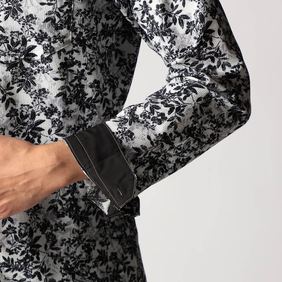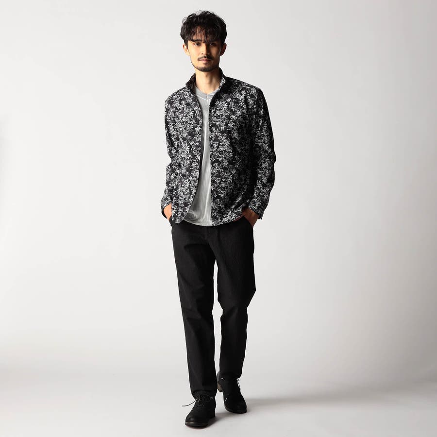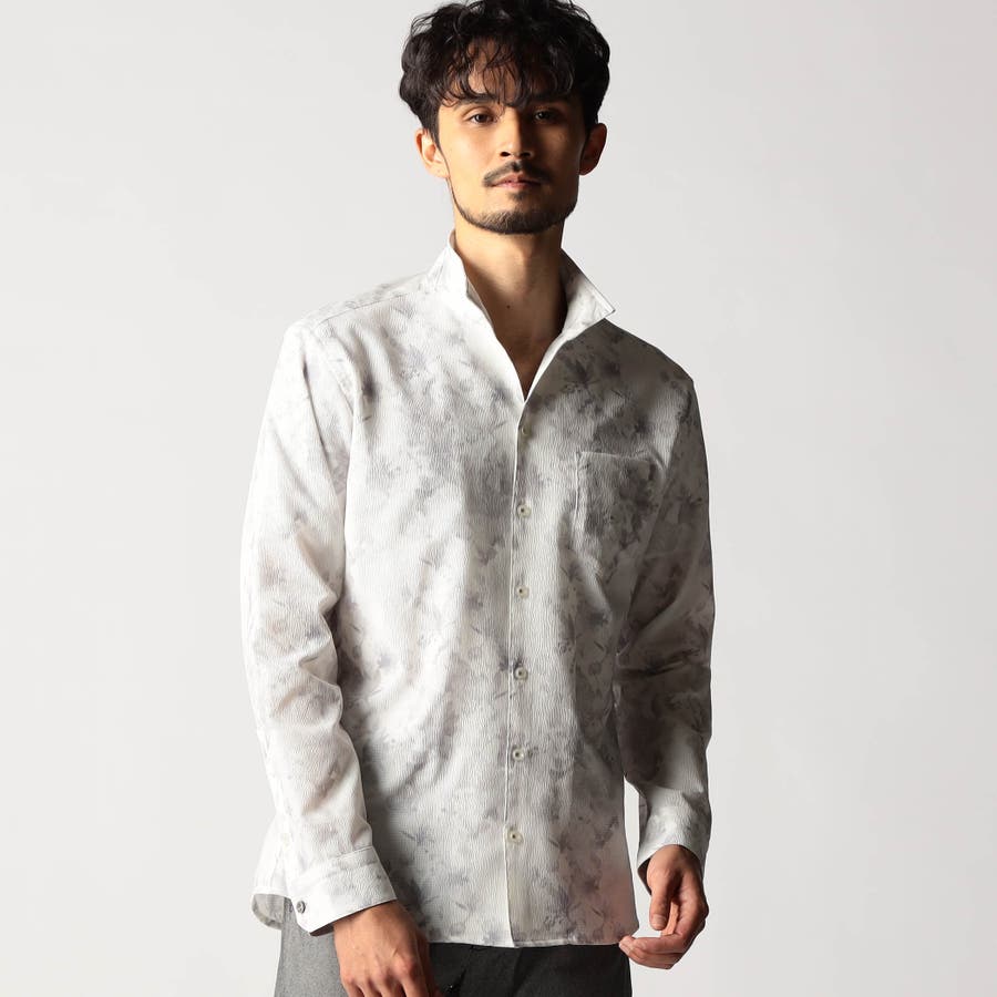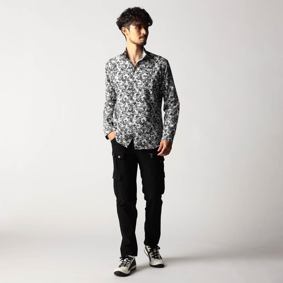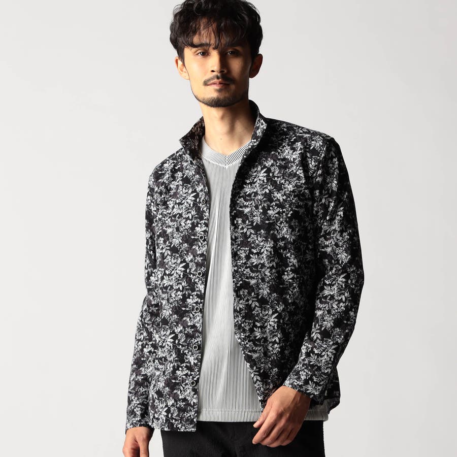 衿端にワイヤ-を仕込んだスタンド・イタリアンカラ-シャツ。ヨーク裏やカフス裏など無地配色のストレッチ裏地を使い、アクセントになる様にしています。生地のプリント配色とリンクした釦や付け糸も、ちょっとしたアクセントになっています。
