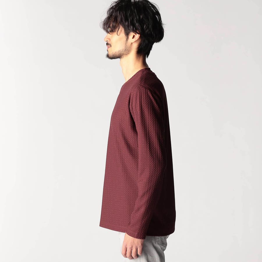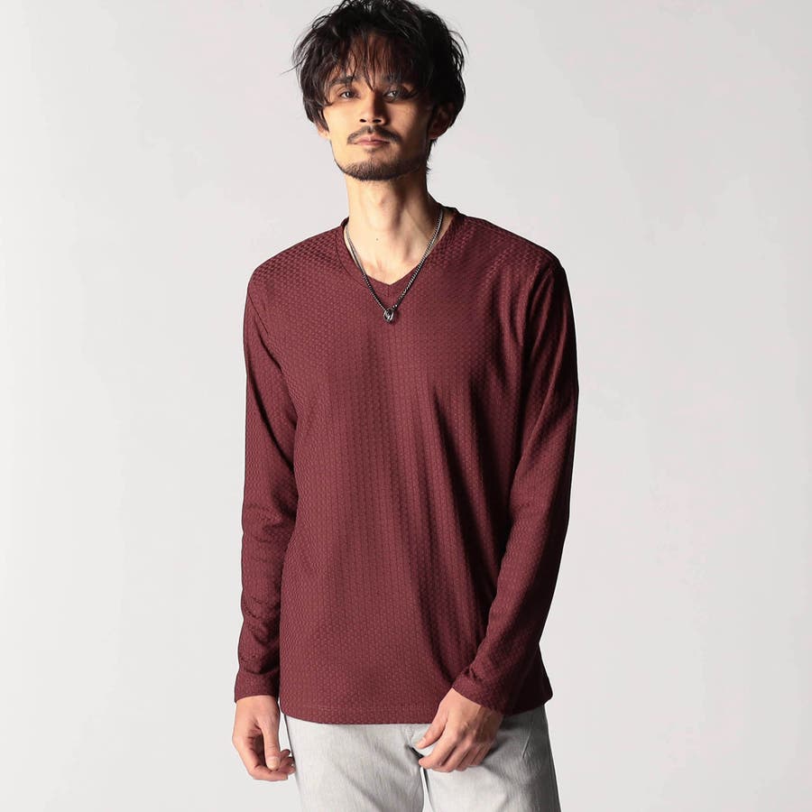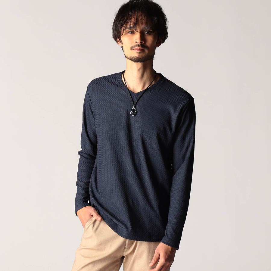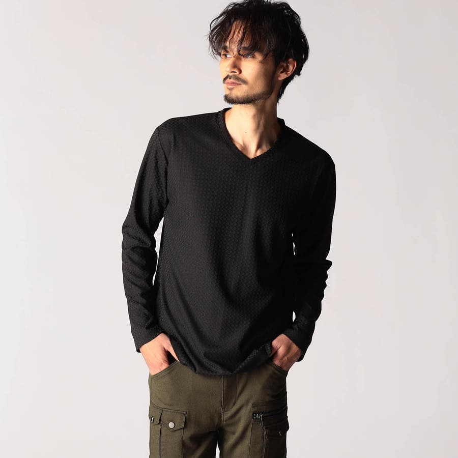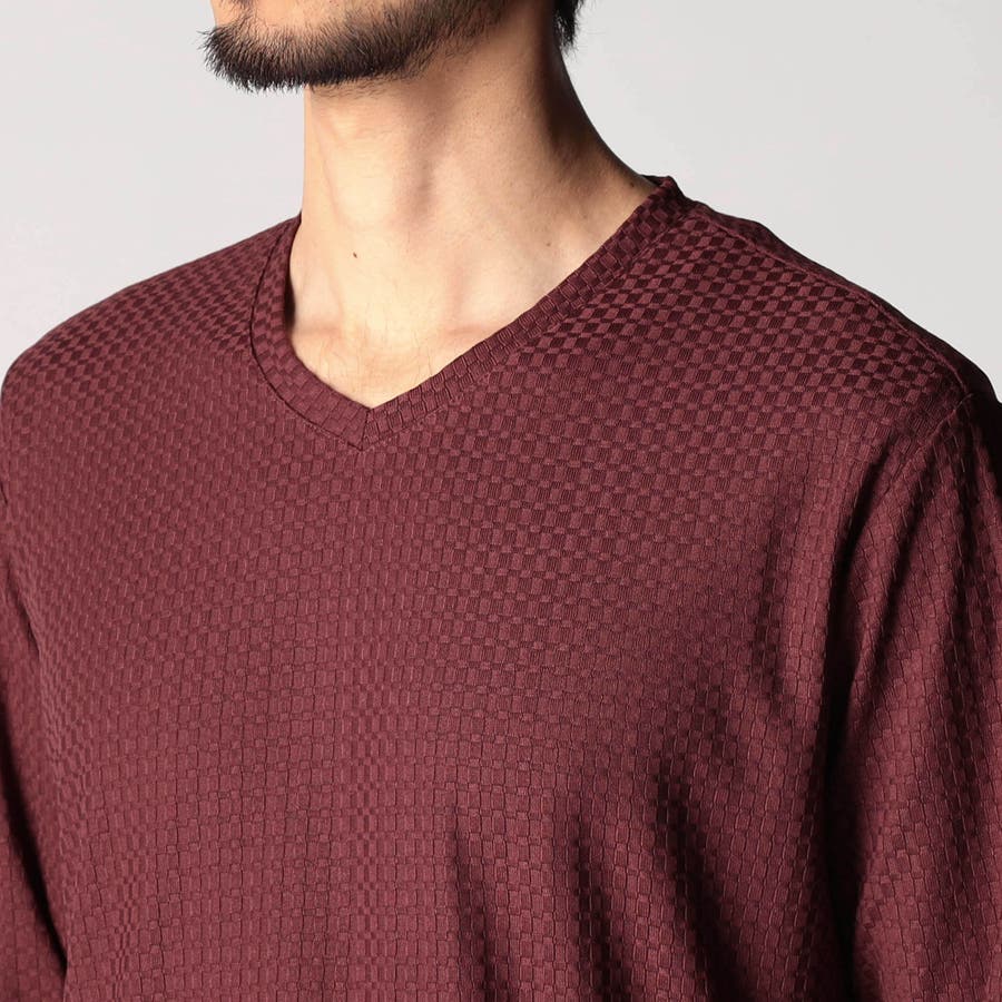 サラッとしたタッチ感と光沢のあるリンクスジャカード生地を使用した浅VネックロンT。凹凸で表現したシックなブロック柄は、セットアップのインナーとしても活躍できる汎用性の高いアイテムです。