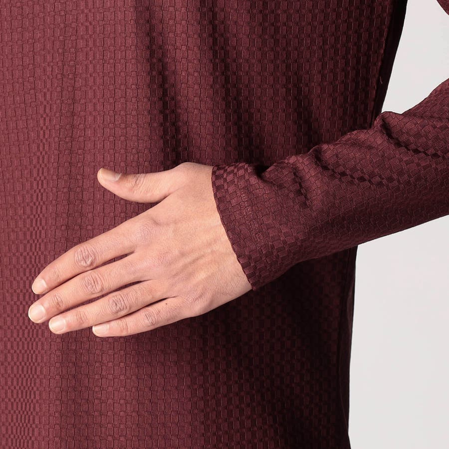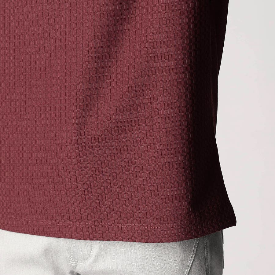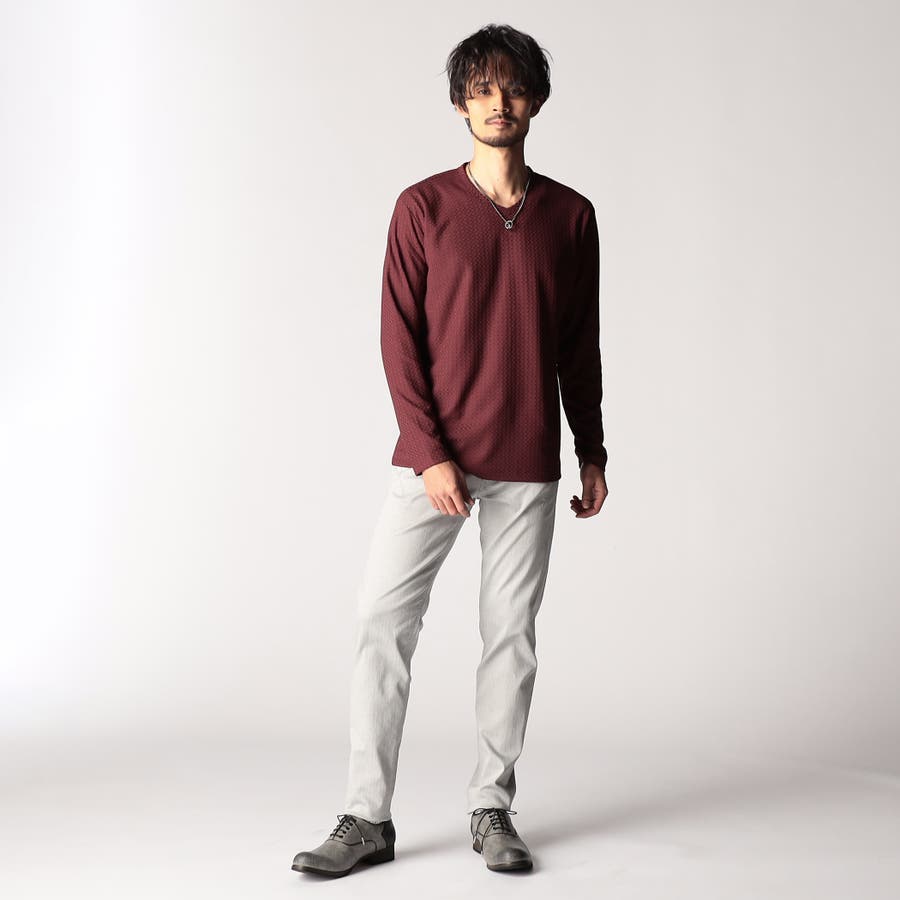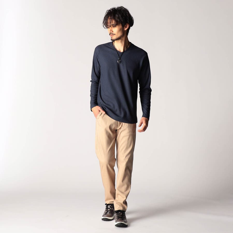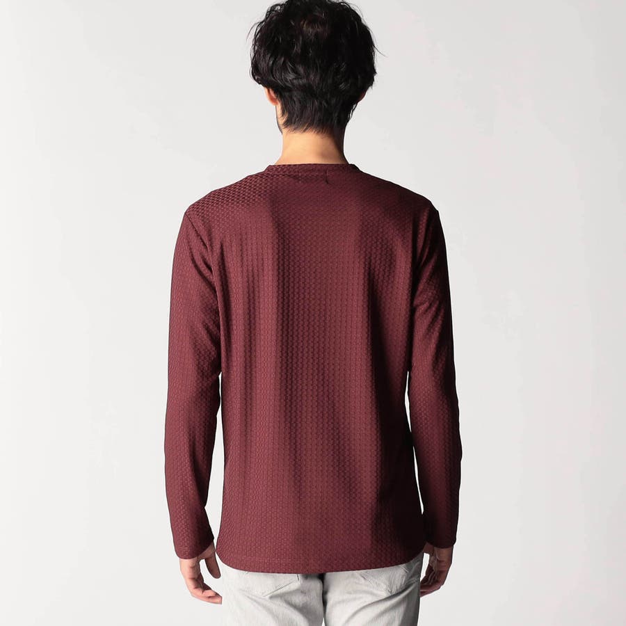 サラッとしたタッチ感と光沢のあるリンクスジャカード生地を使用した浅VネックロンT。凹凸で表現したシックなブロック柄は、セットアップのインナーとしても活躍できる汎用性の高いアイテムです。