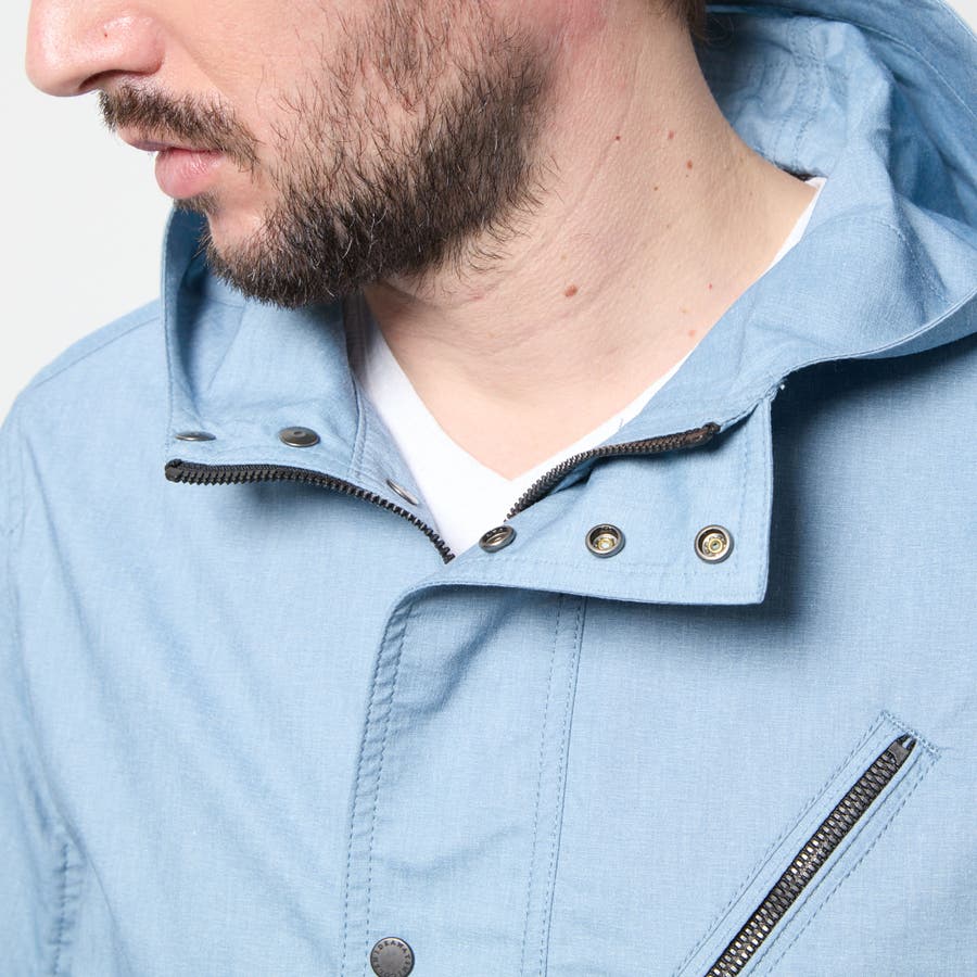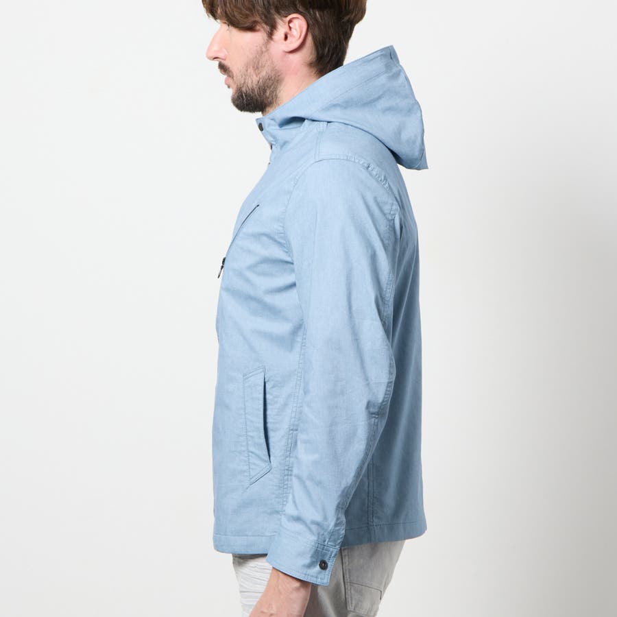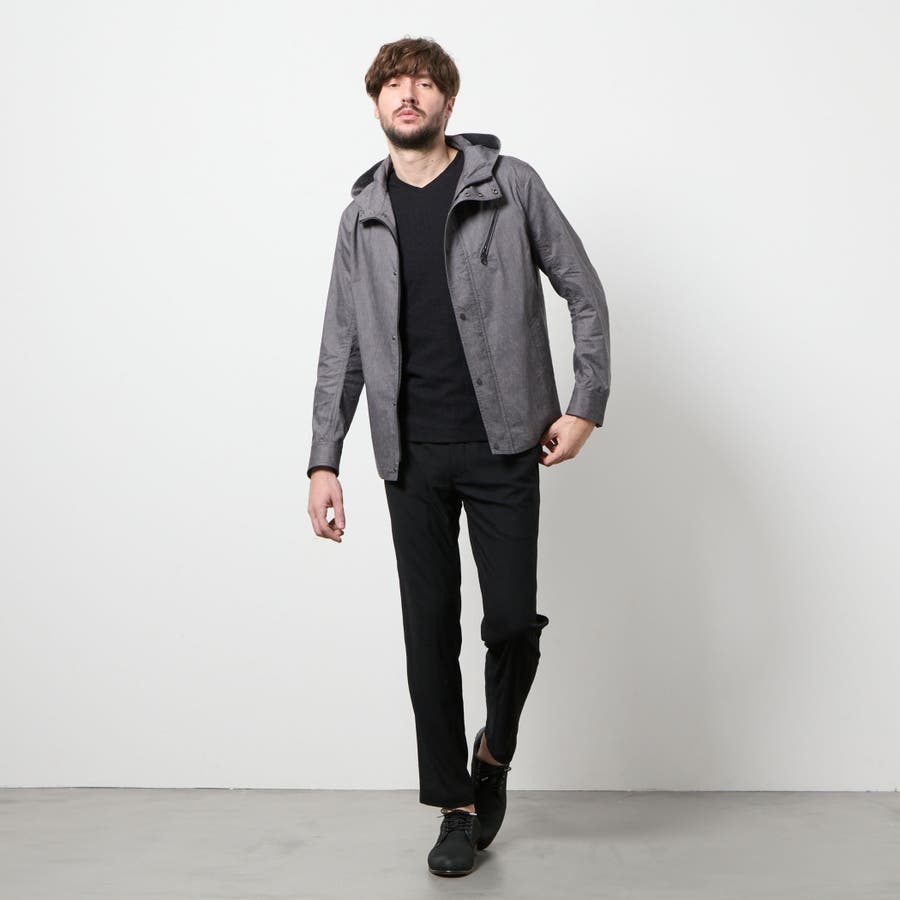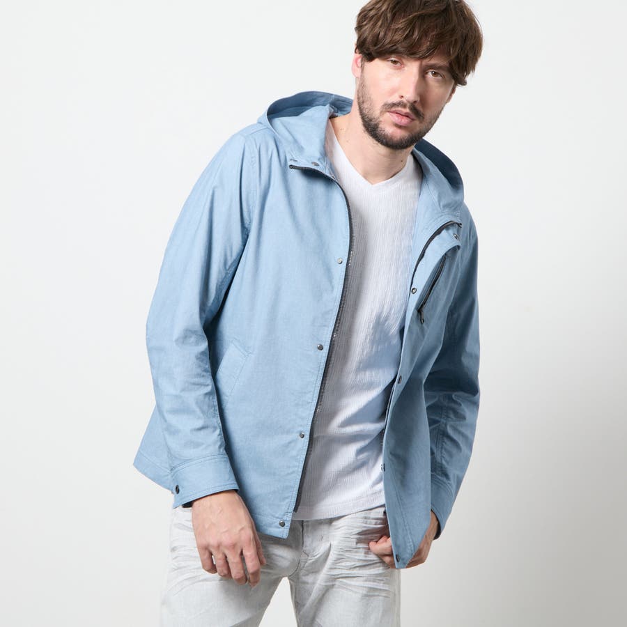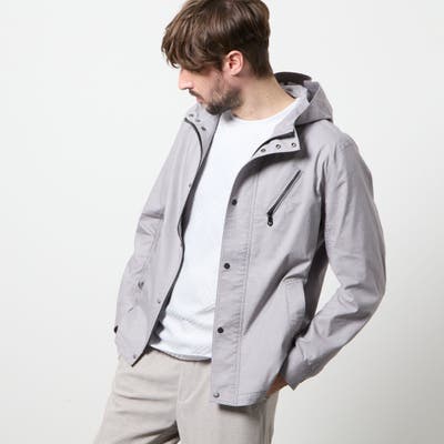 フード一体型のマウンテンパーカーデザイン。胸のファスナーポケットをアクセントにフロント、袖口にはオリジナルのロゴ入りドット釦を使用して高級感をプラスしました。一重の仕様で軽く羽織れるデザインに仕上げています。
