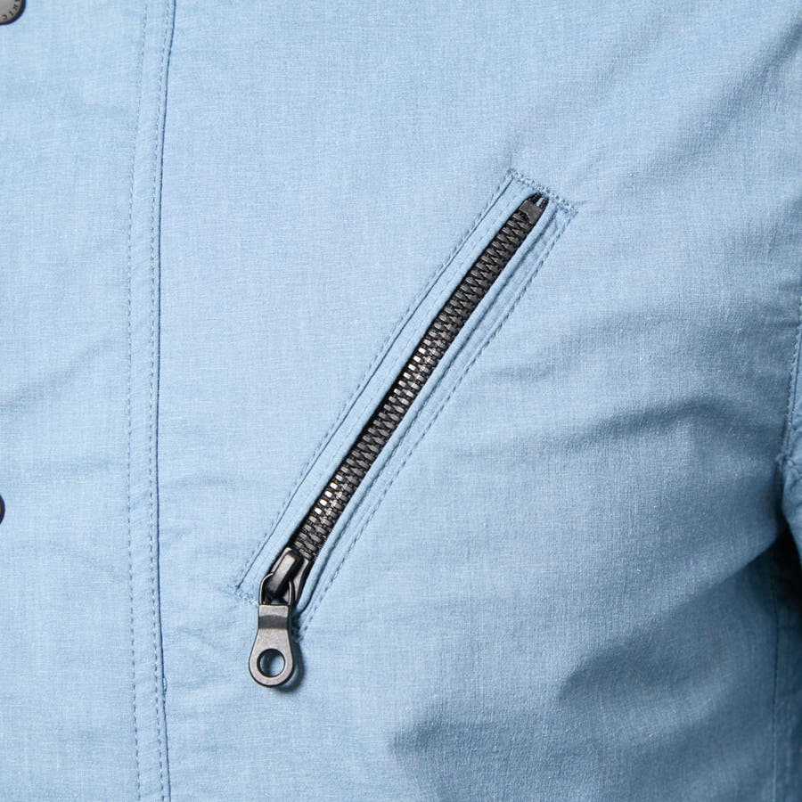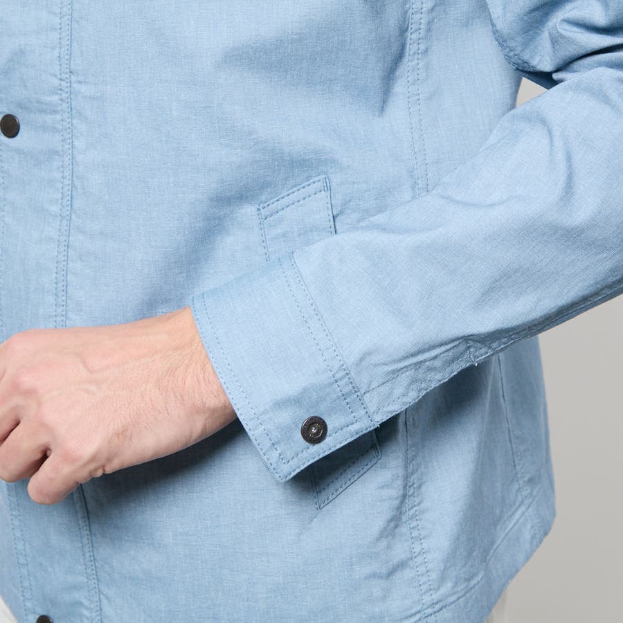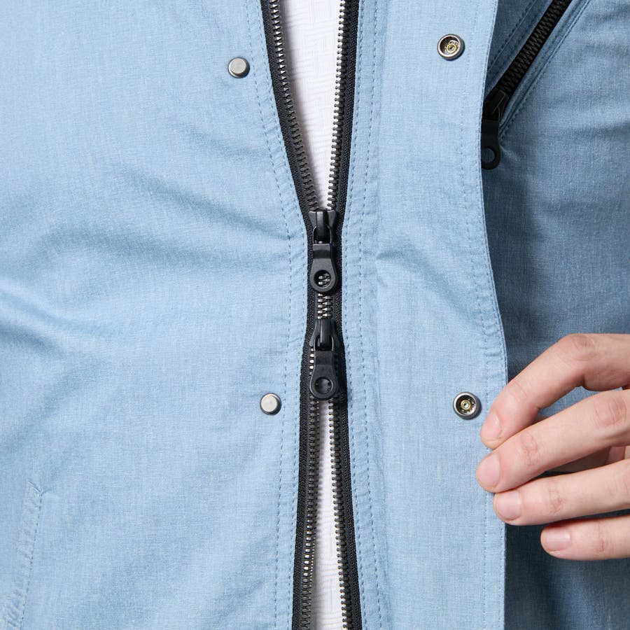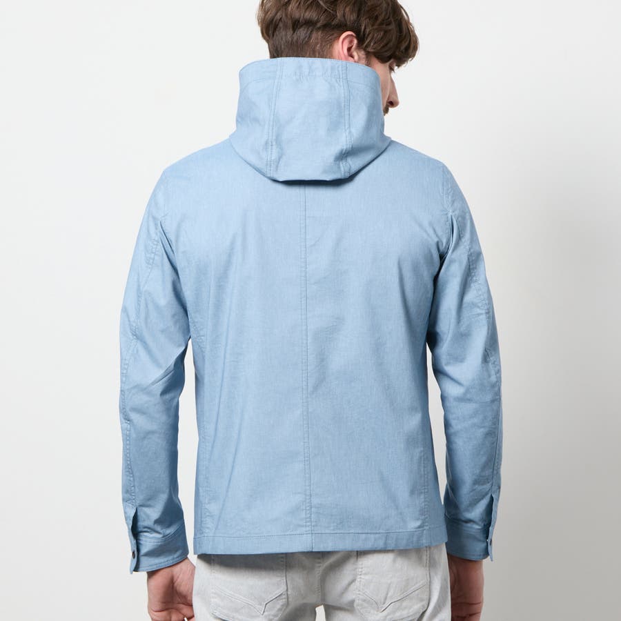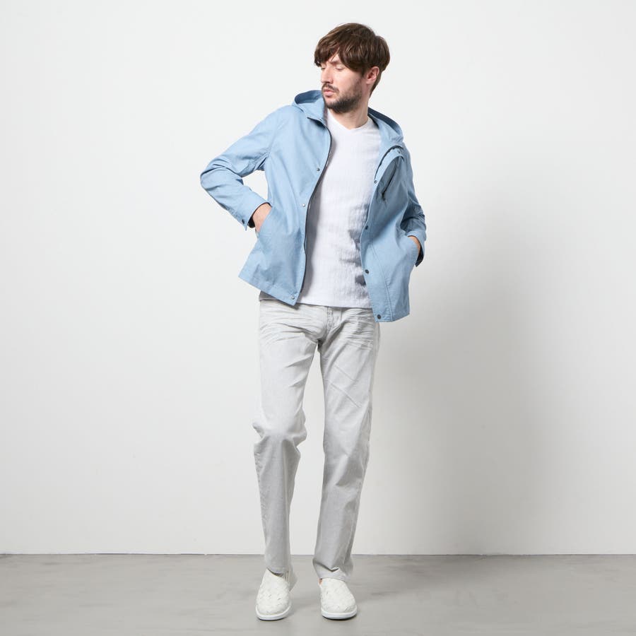 フード一体型のマウンテンパーカーデザイン。胸のファスナーポケットをアクセントにフロント、袖口にはオリジナルのロゴ入りドット釦を使用して高級感をプラスしました。一重の仕様で軽く羽織れるデザインに仕上げています。