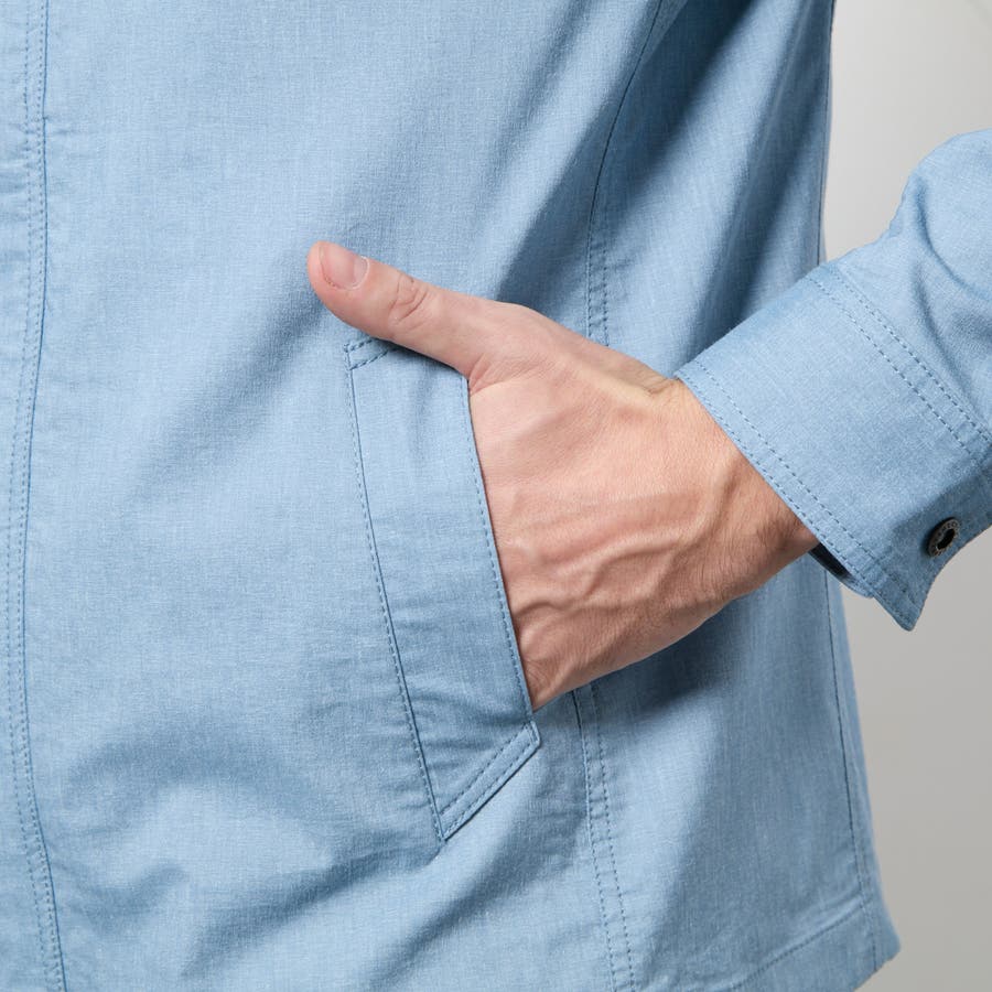 綿麻の混紡糸とナイロン糸を組み合わせた平織のハイストレッチ素材を使用。綿麻特有の節感とナイロンの上品な光沢が独特な表情を出している素材です。とてもよく伸び、しっかり戻るストレッチ性もありますので、体の動きに沿ったストレスフリーな着心地を提供してくれます。