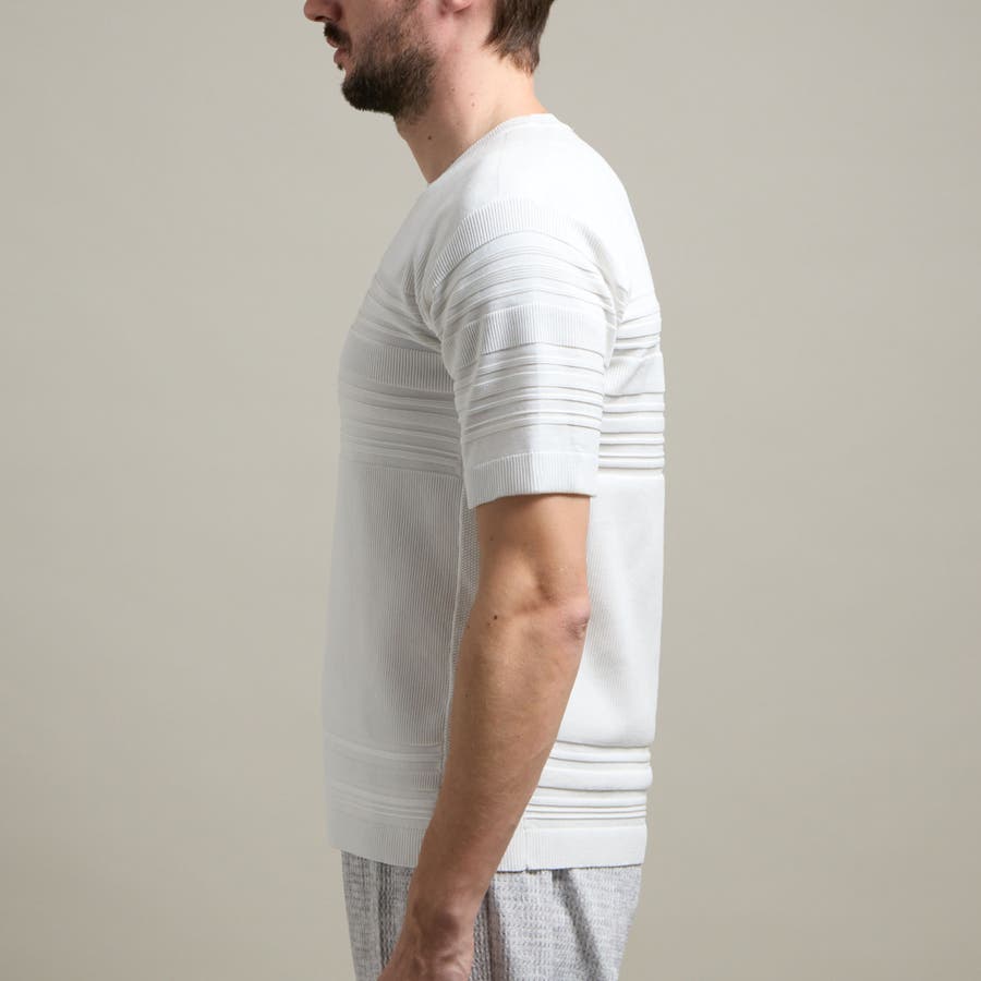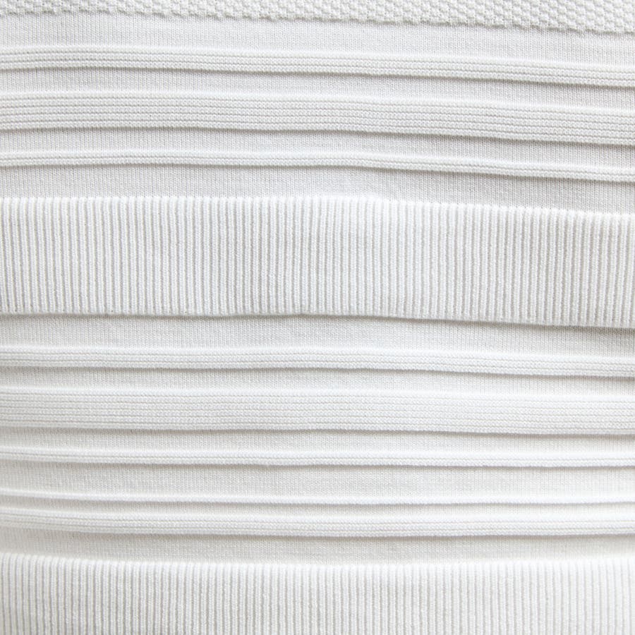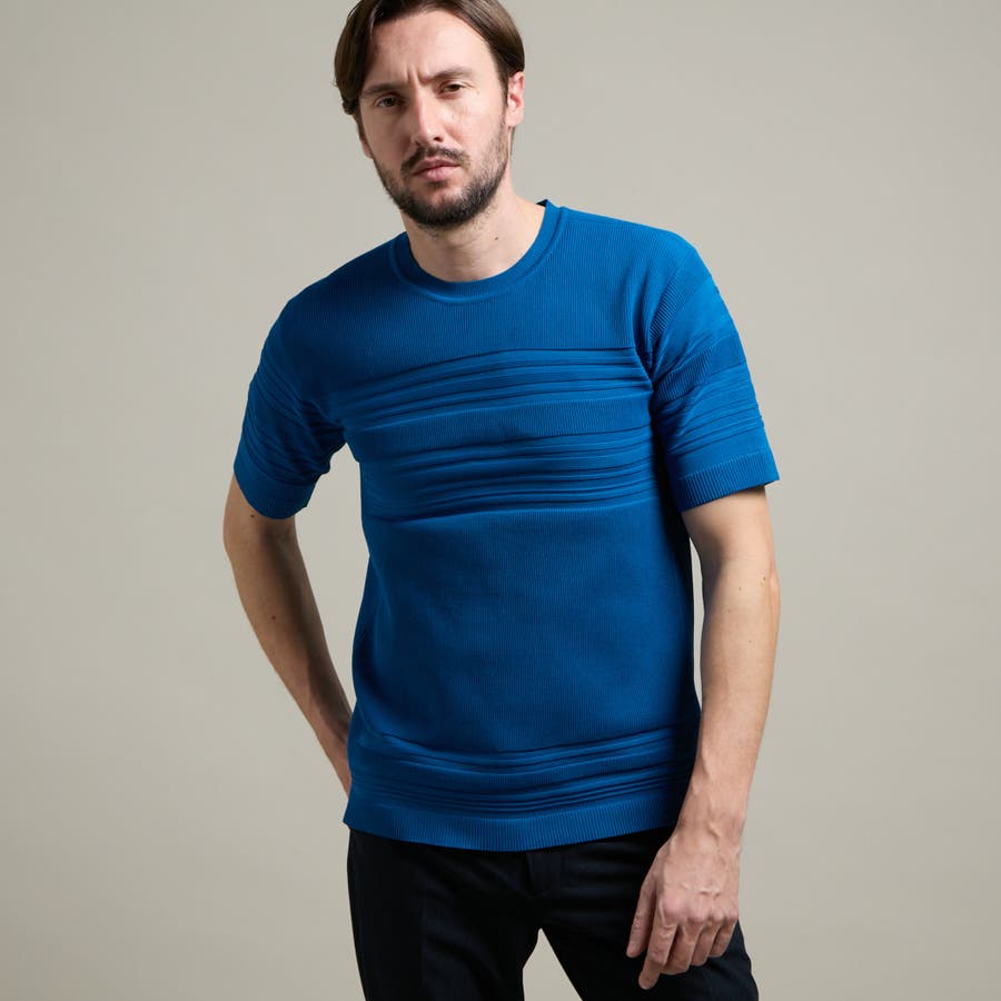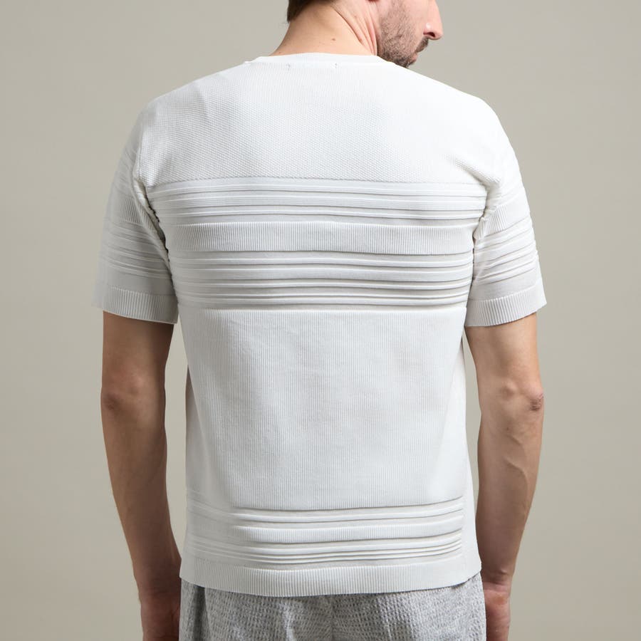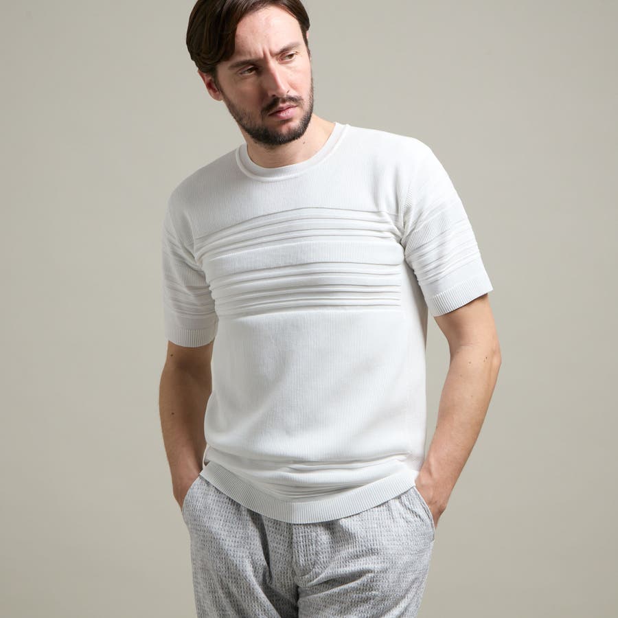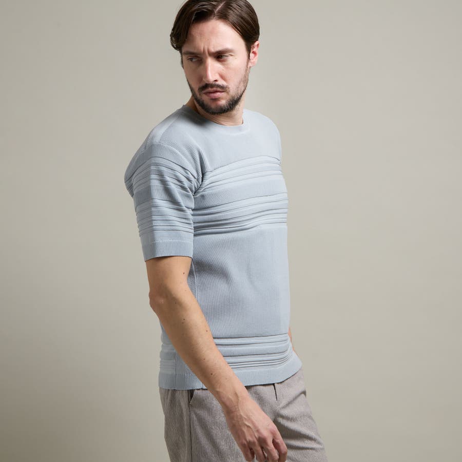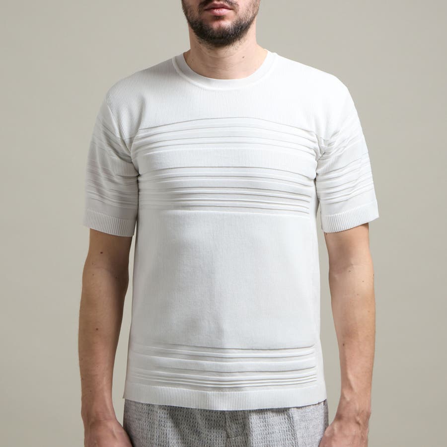 高収縮ポリエステル糸を使用し、14Gのハイゲージで高密度に編みたてた半袖ランダムタックボーダージャカードニットになります。
