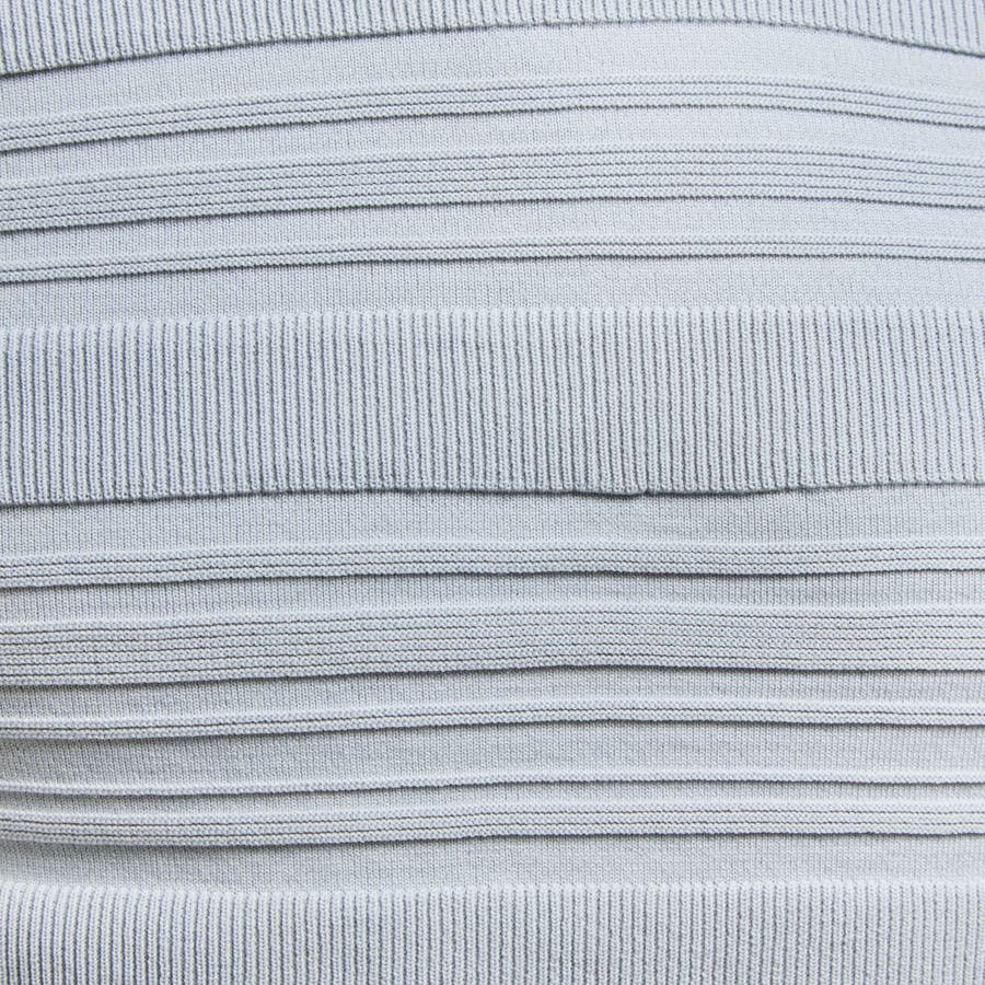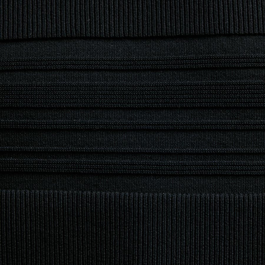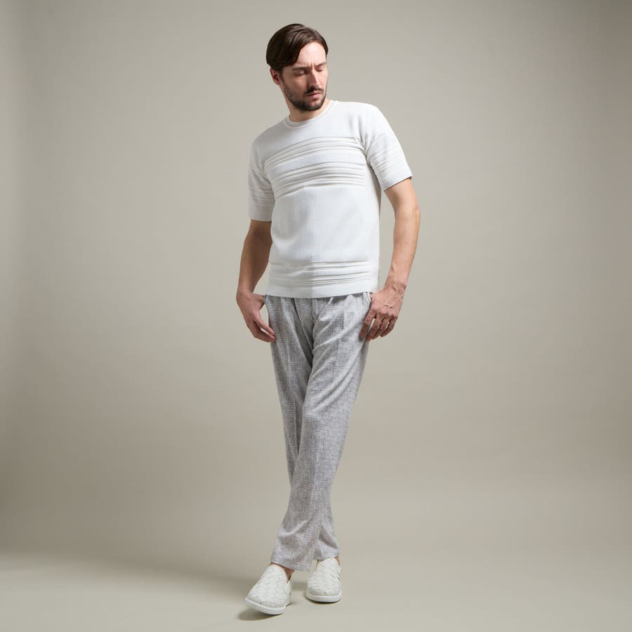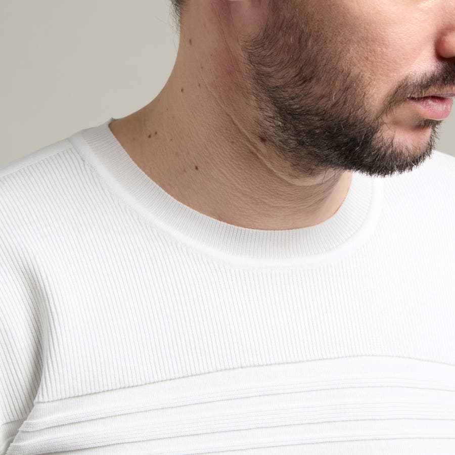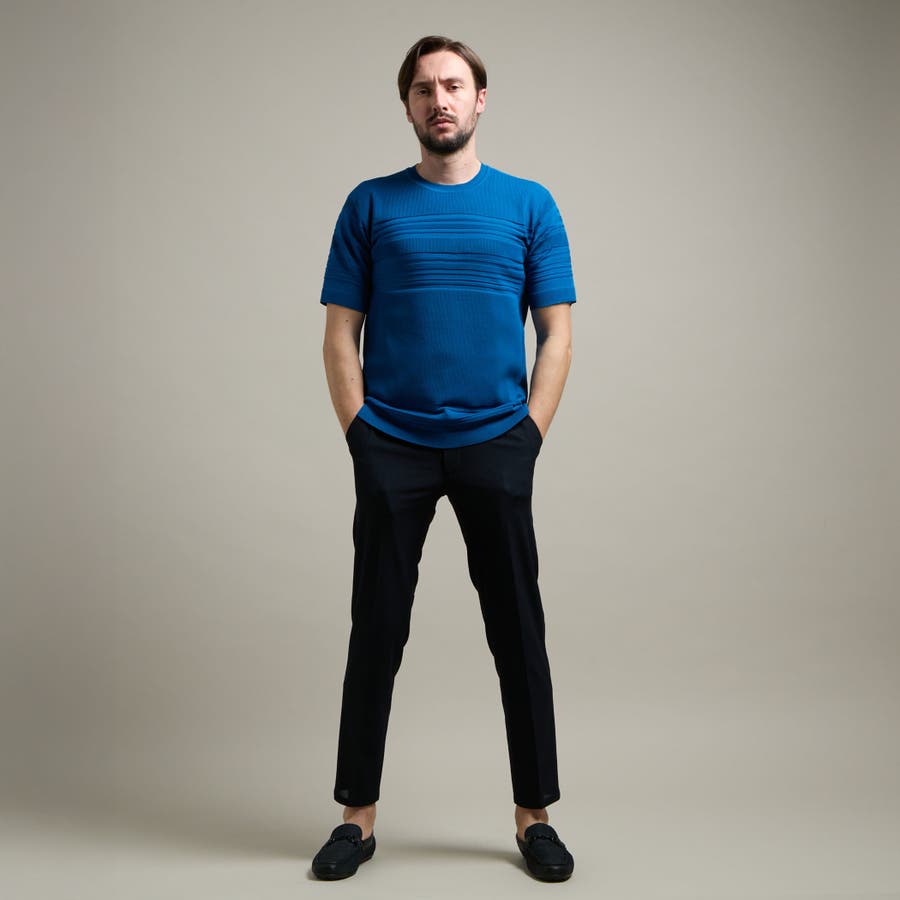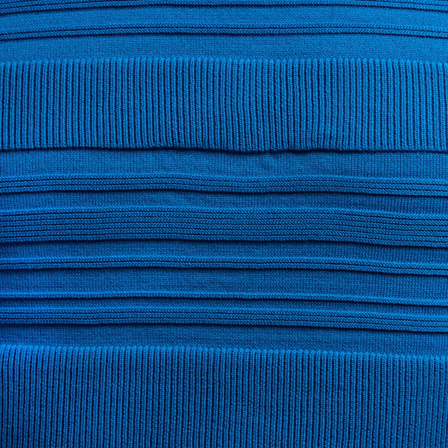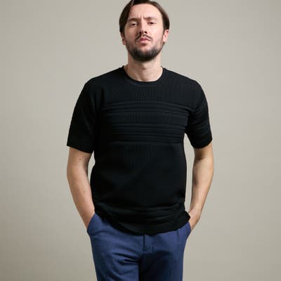 高収縮ポリエステル糸を使用し、14Gのハイゲージで高密度に編みたてた半袖ランダムタックボーダージャカードニットになります。