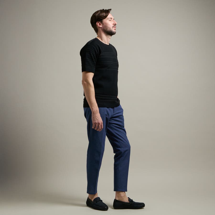 軽量かつニットならではのストレッチ性にも優れ、長時間の着用でも疲れにくいストレスフリーな素材です。