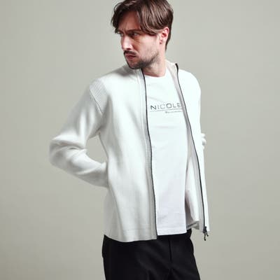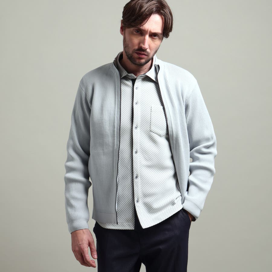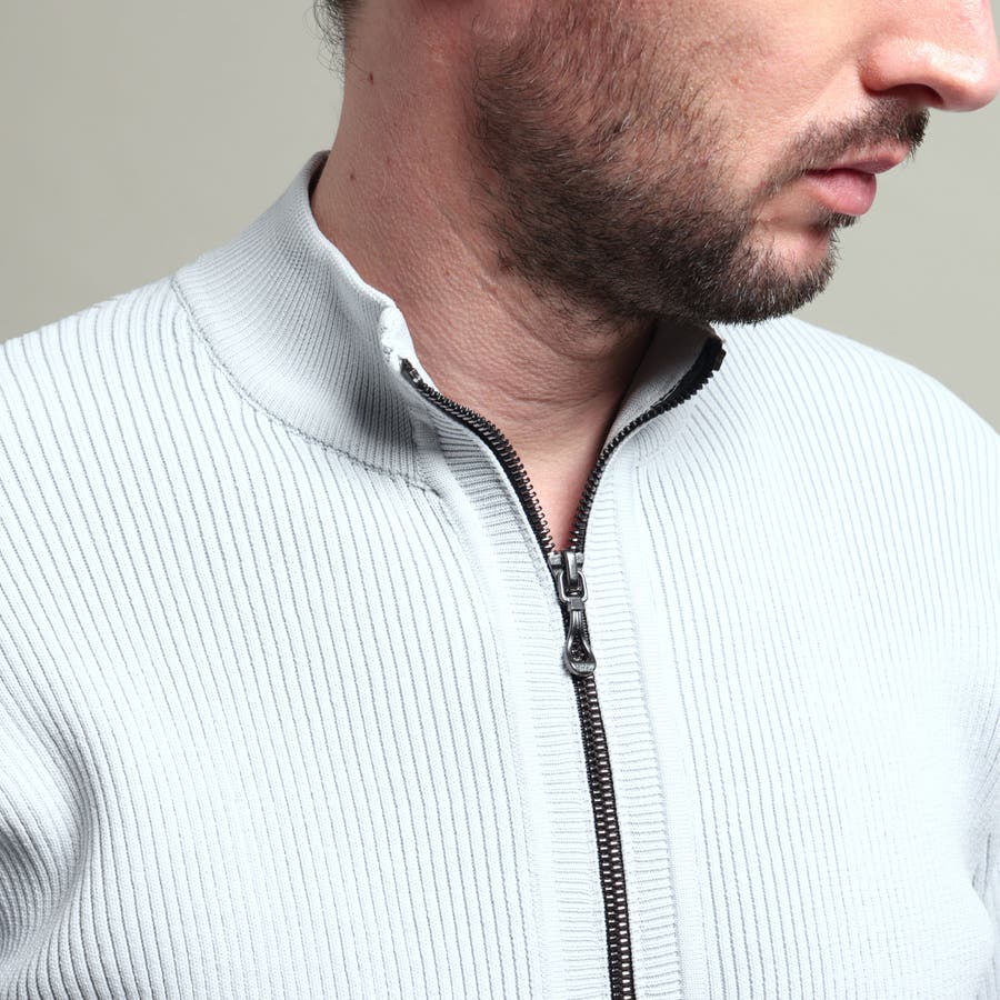 高収縮ポリエステル糸を使用し、14GGというハイゲージで、編み立てたフルジップスタンドニットブルゾンになります。