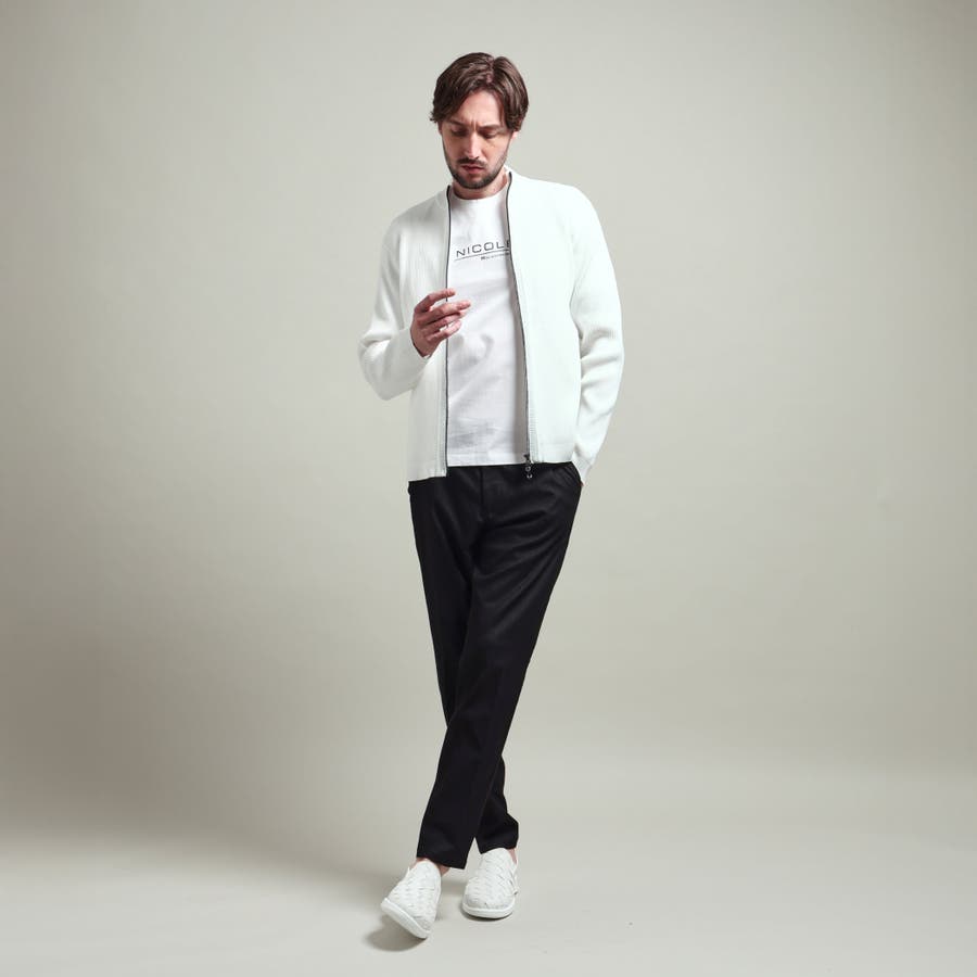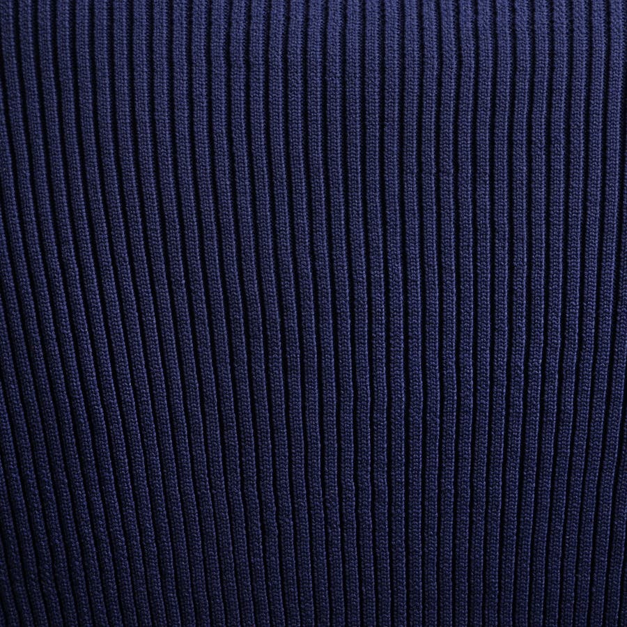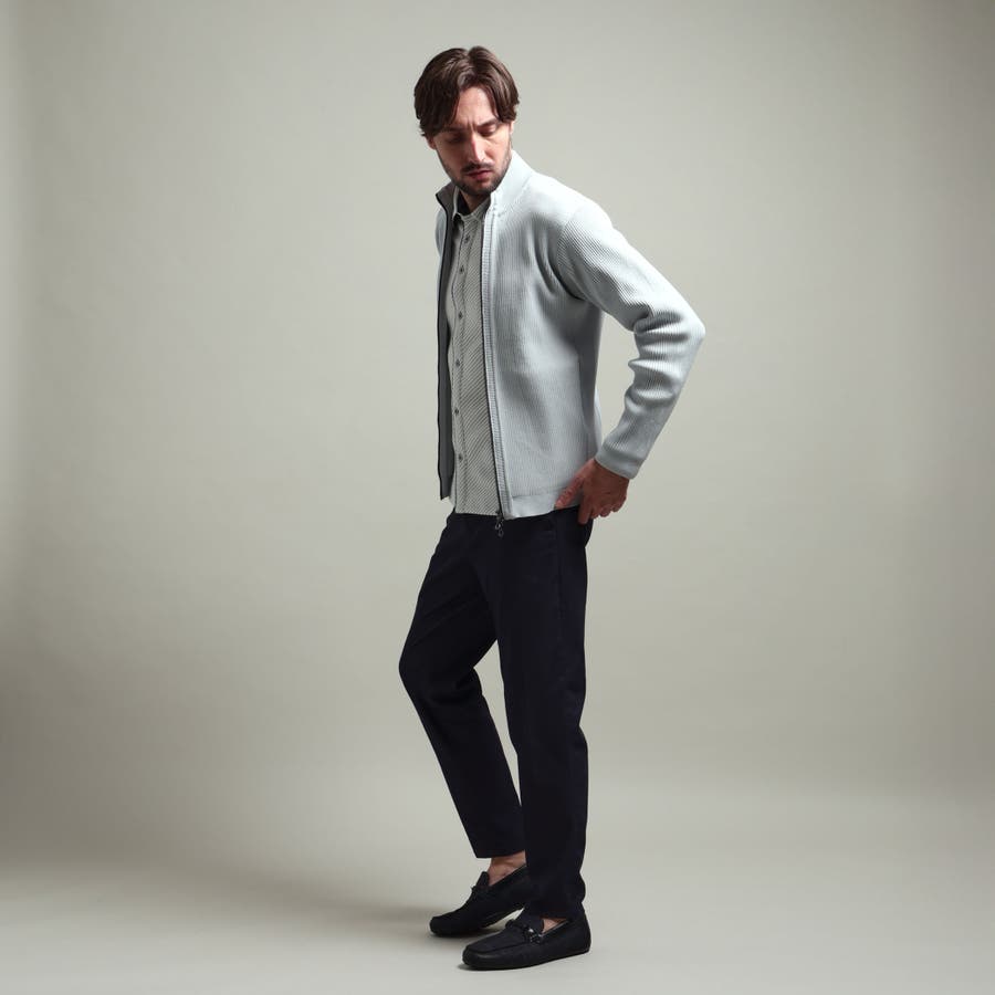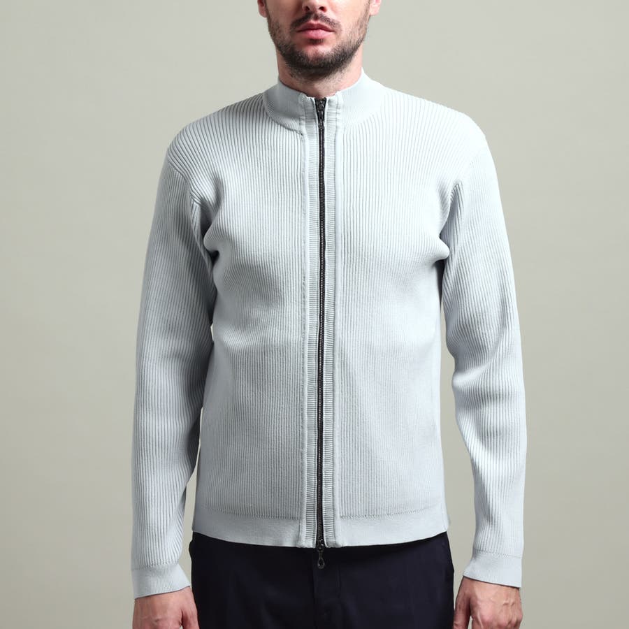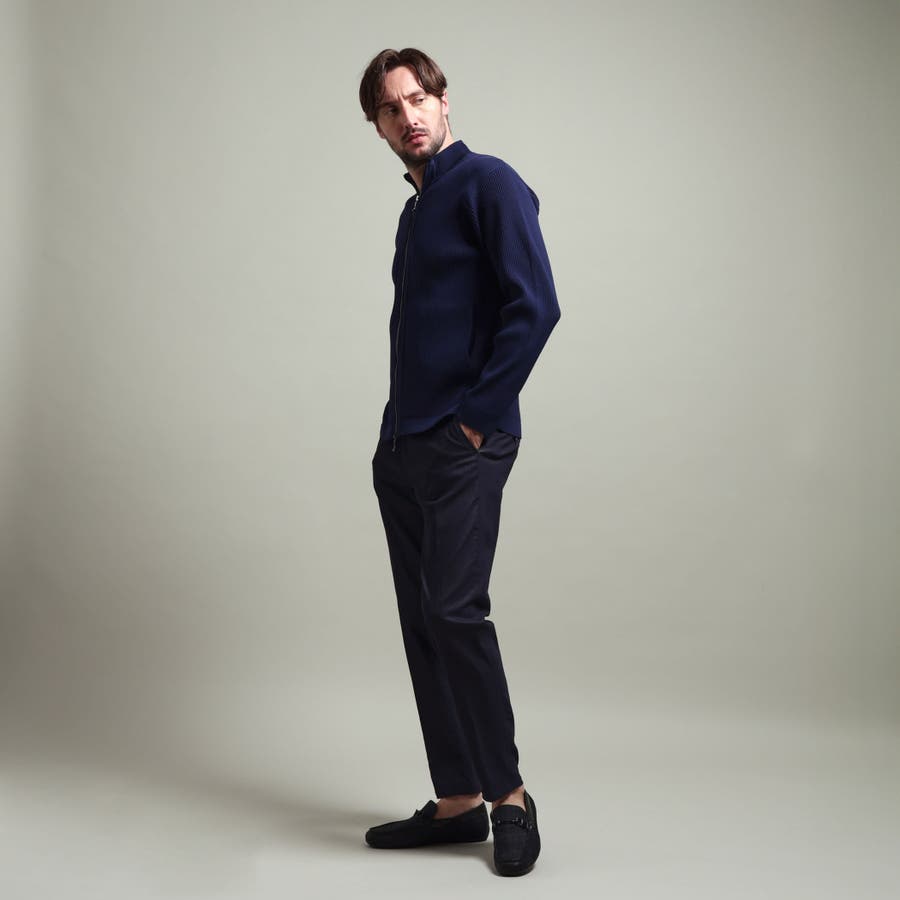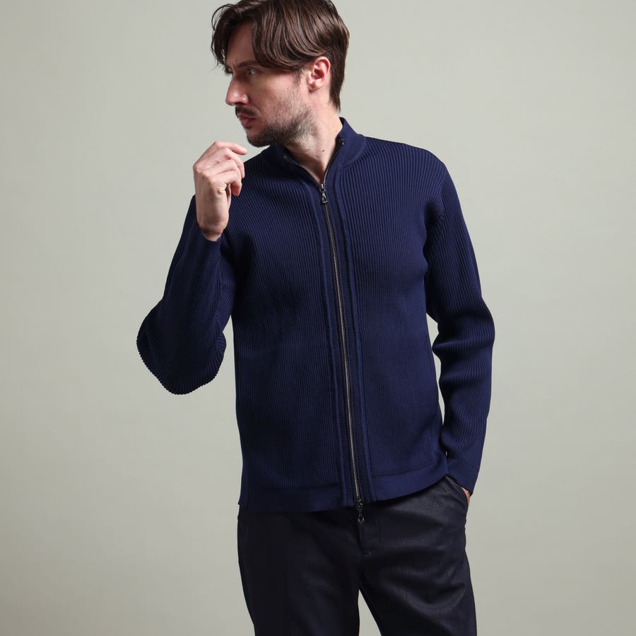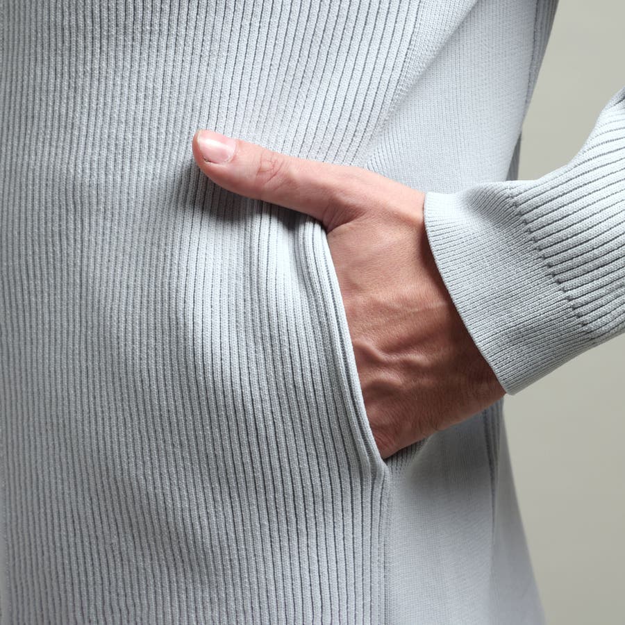身頃、袖を2×2RIBで編立て、細腹を1×1RIBに編み立てることでシャープな印象を演出。