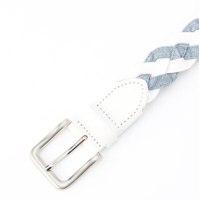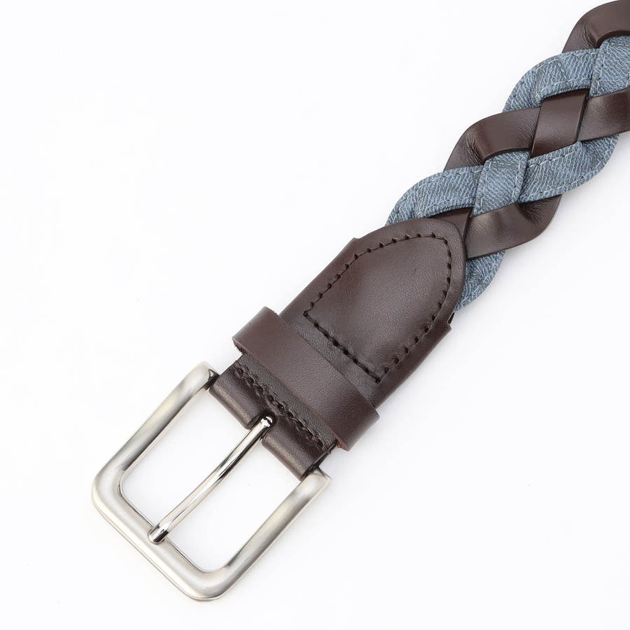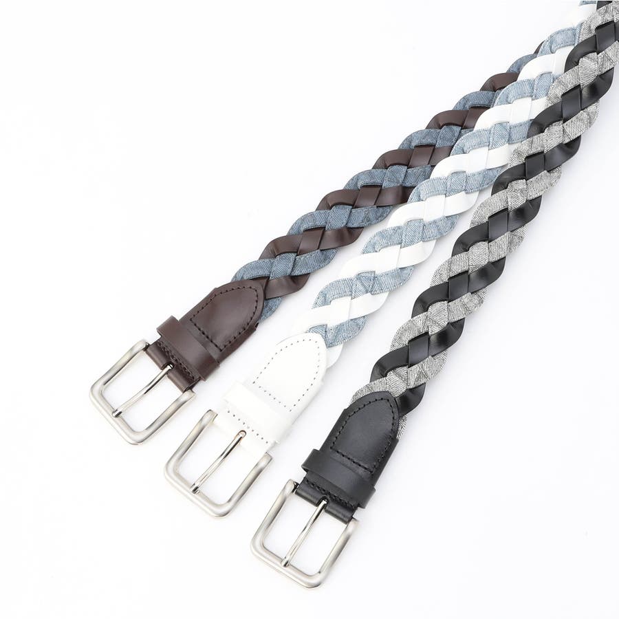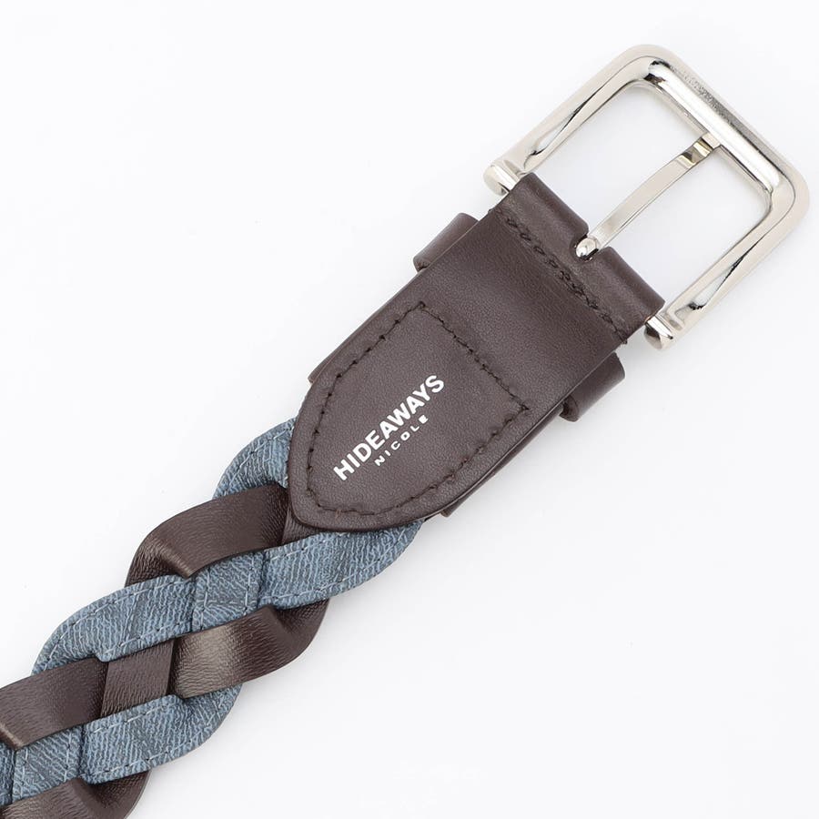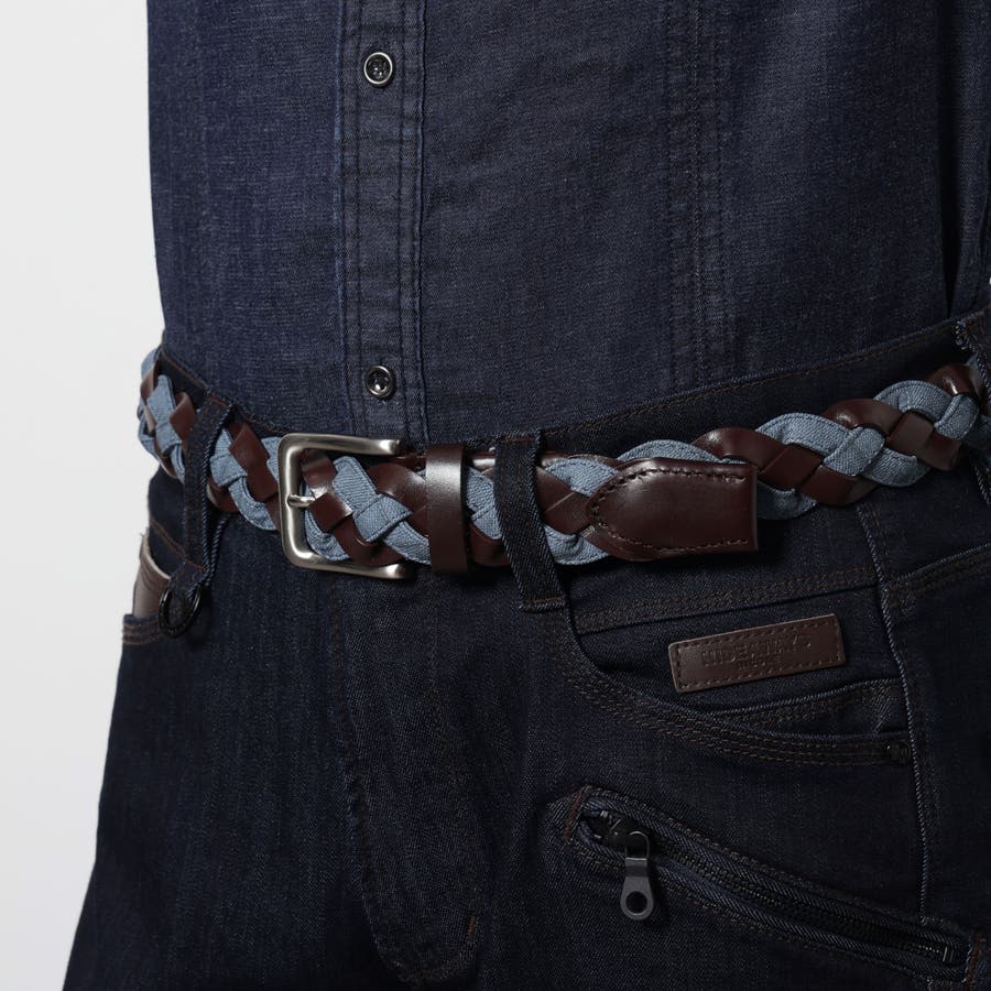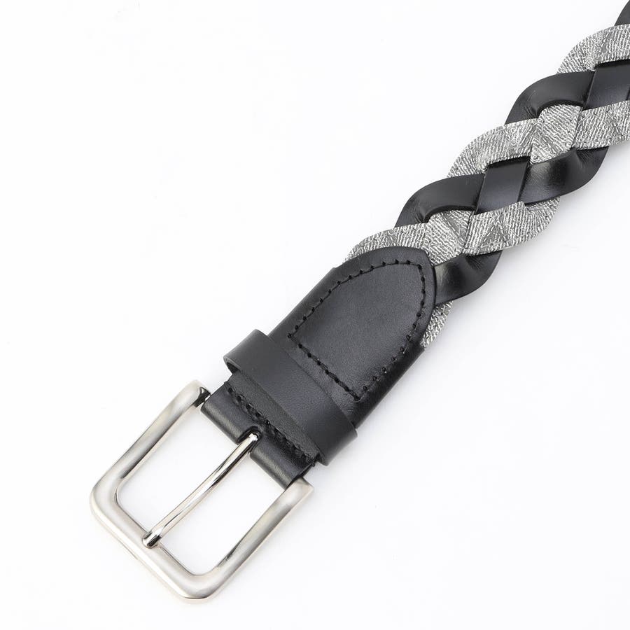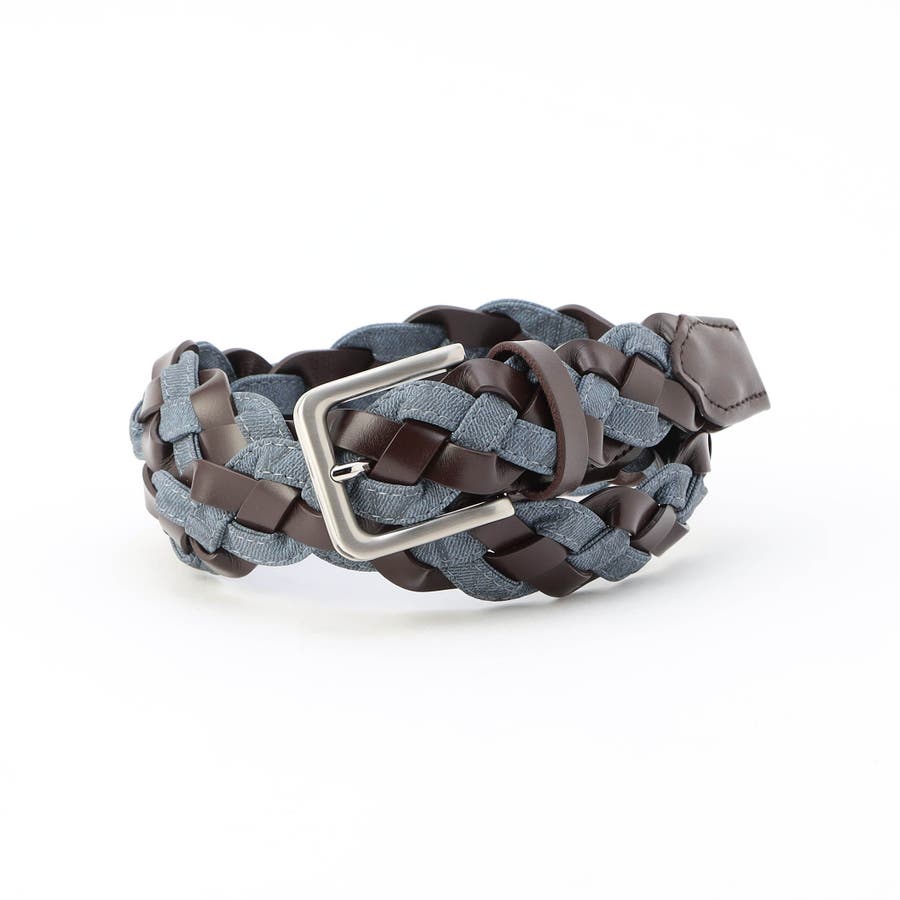 帯部分は皮革繊維再生複合材とウォッシュドデニム調の合成皮革をテープ使いした異素材合わせで編み込んでいます。