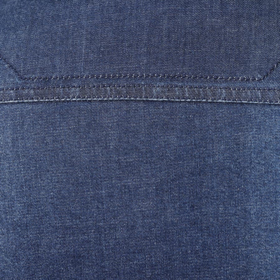 各接ぎのWステッチ、前身の切り替えデザインで加工後のアタリ感の印象を強くし、前立て部分のステッチには環縫いステッチを使用してちょっとしたアクセントになるようにしております。