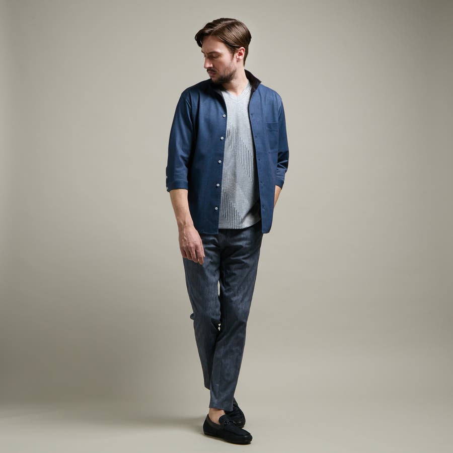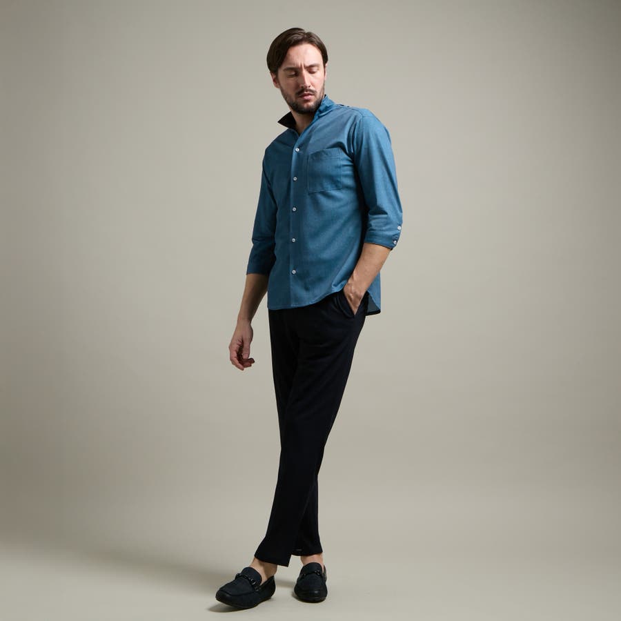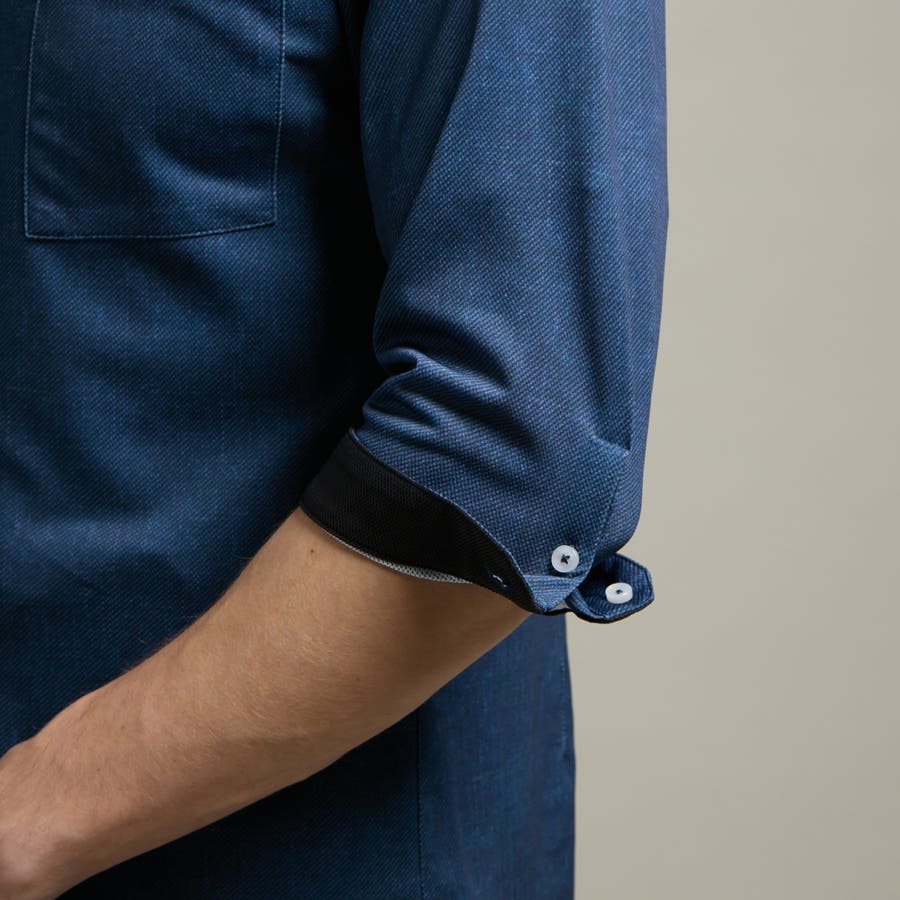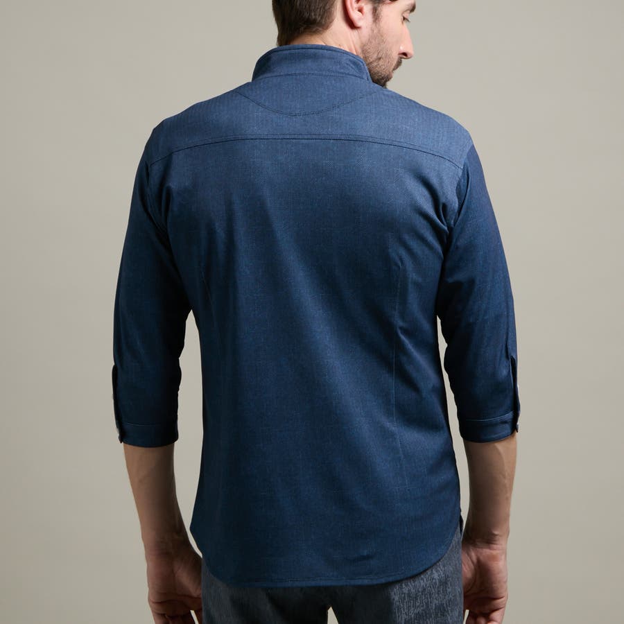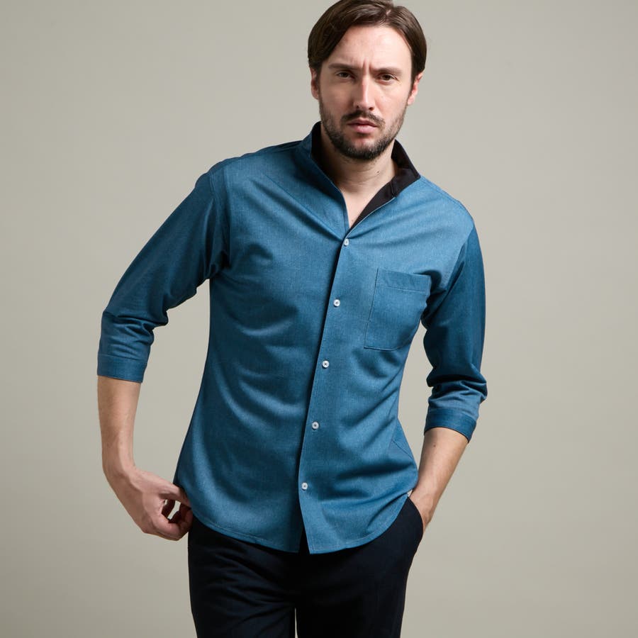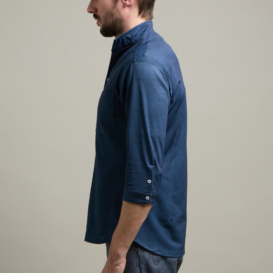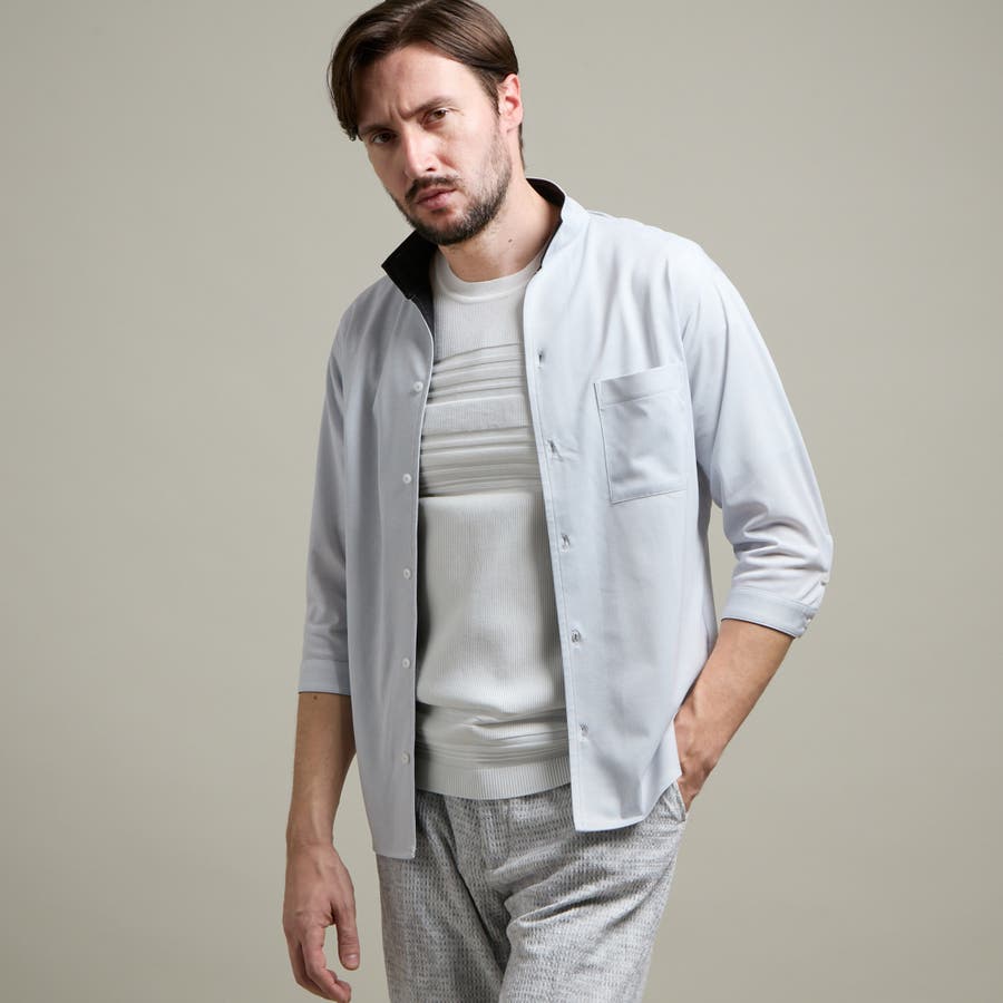 袖丈が肘下7分丈のスタンドカラーカットシャツ。