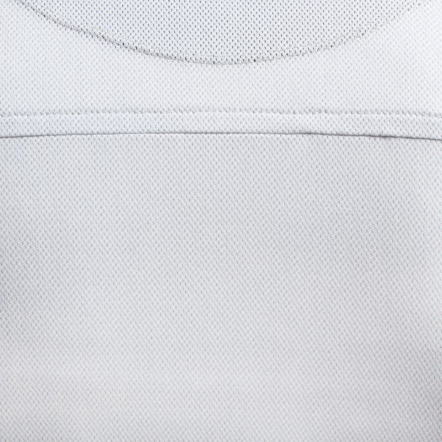 メッシュ調のストレッチカットソー生地をベースに、細かなカスレ調ツイルのプリントを施して透け感を抑えたカットソー素材を使用。