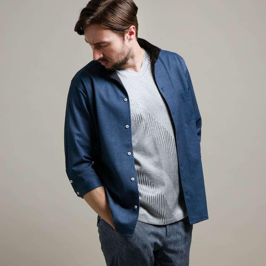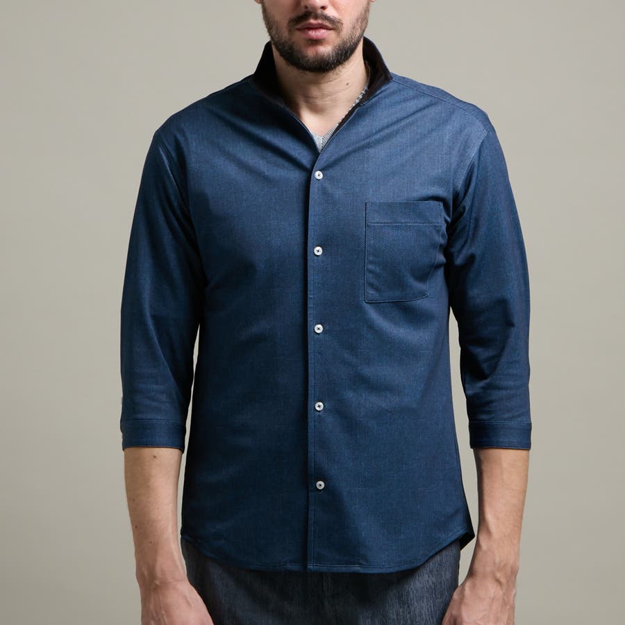 カスレプリント 7分袖スタンドカラーシャツ